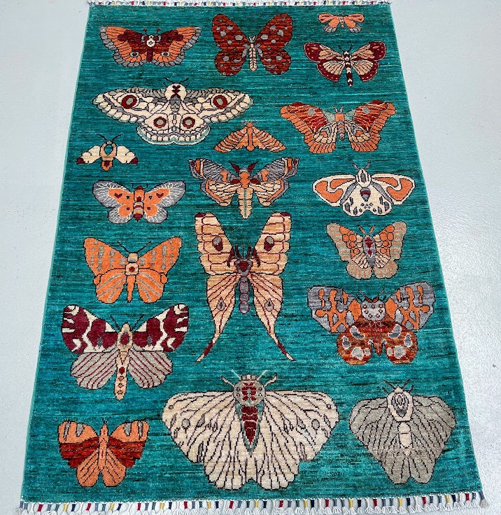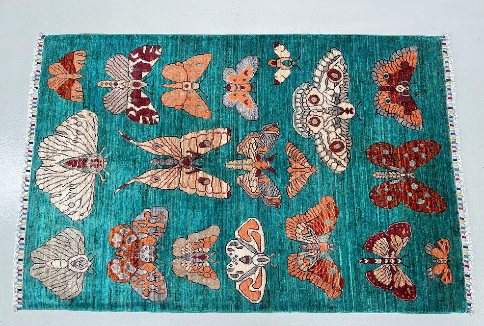 Coffee Table Size Genuine Hand Knotted Afghan Super Kazak Gabbeh Rug. Above All It Has A Pure Hand Spun Wool Pile On Cotton Base. Green / Aqua Marine Tone Dyed Using Traditional Methods (Vegetable Dyes). Last of True Woven Nomadic Art.
