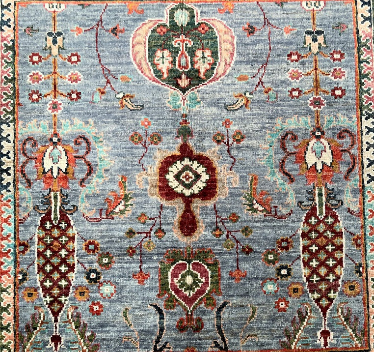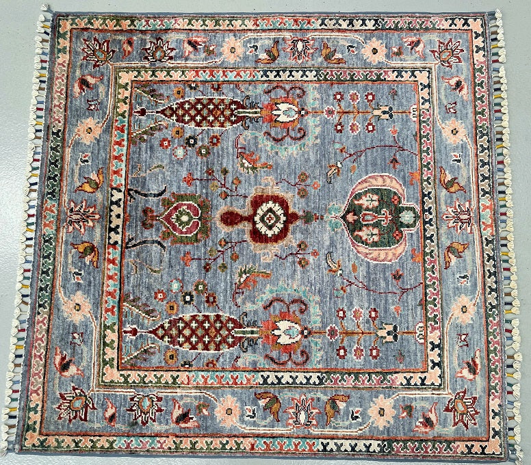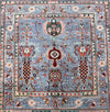 Square Size Hand Knotted Afghan Chobi Rug. Above All It Has A Pure Hand Spun Wool Pile On Cotton Base. Grey Blue, Beige, Green, Red And Orange Tone Dyed Using Traditional Methods (Vegetable Dyes). Last of True Woven Nomadic Art.