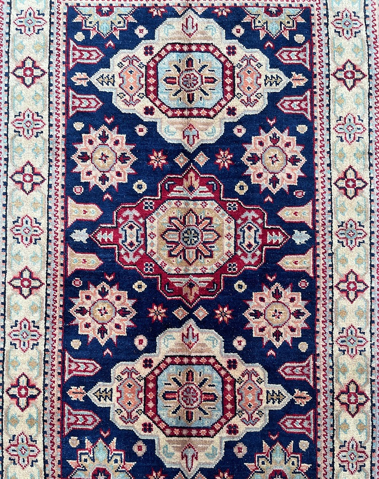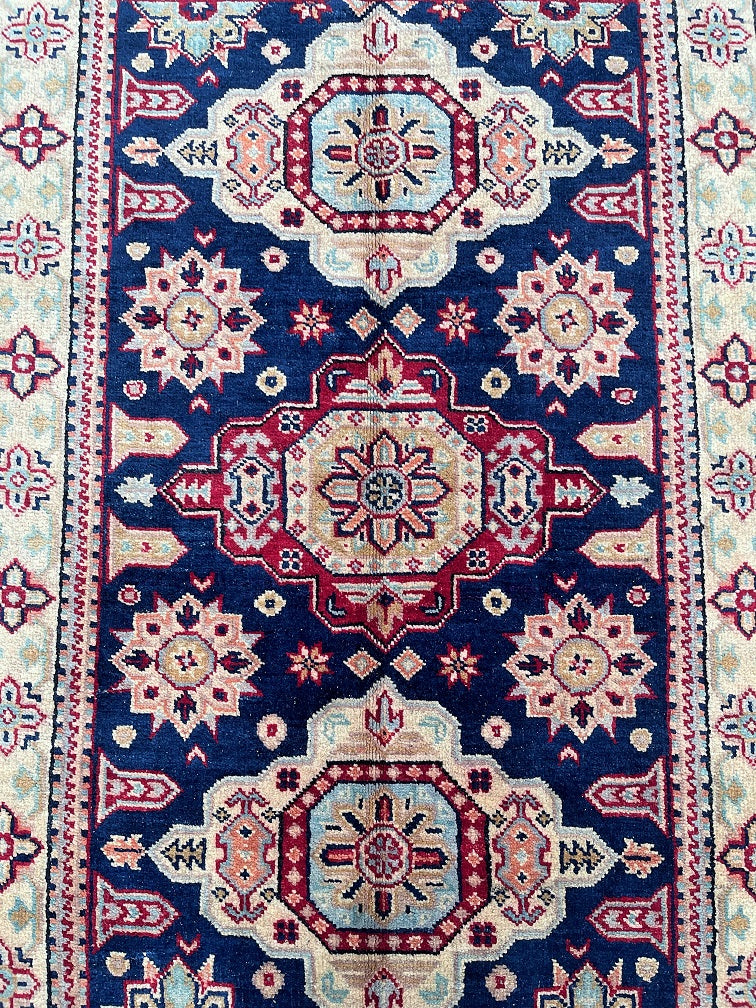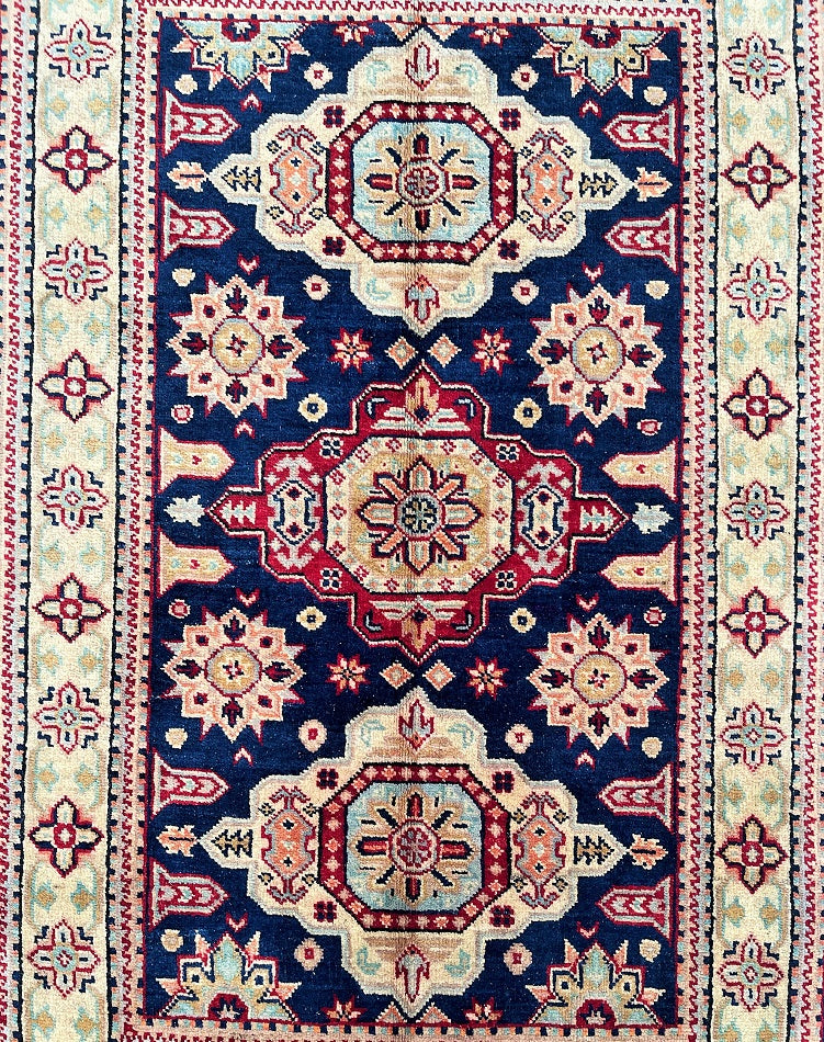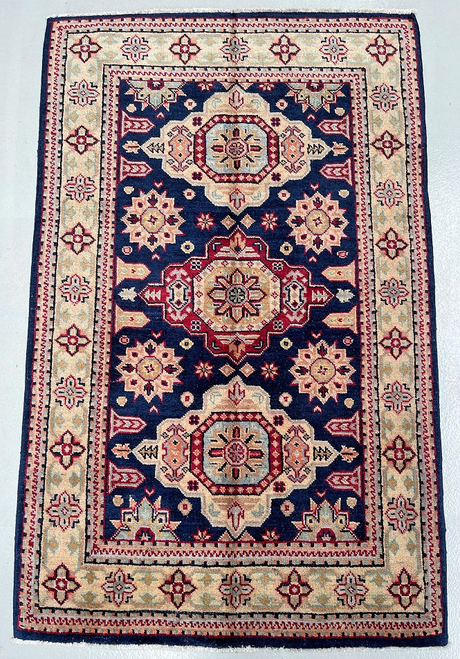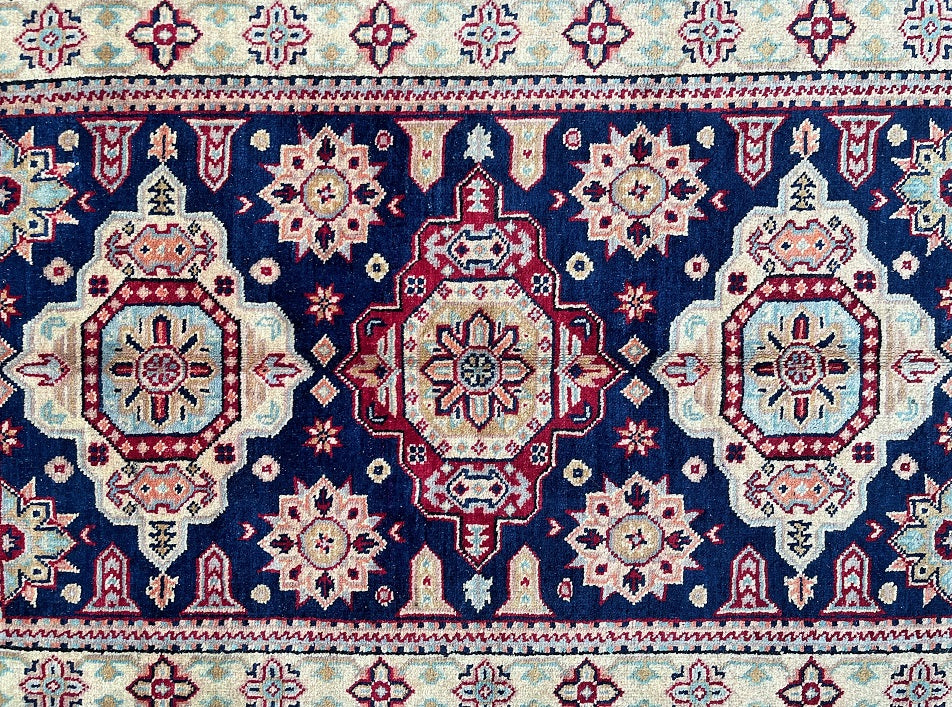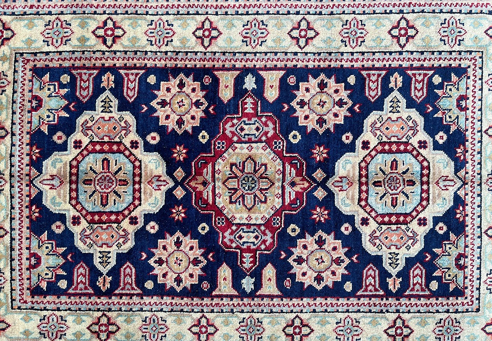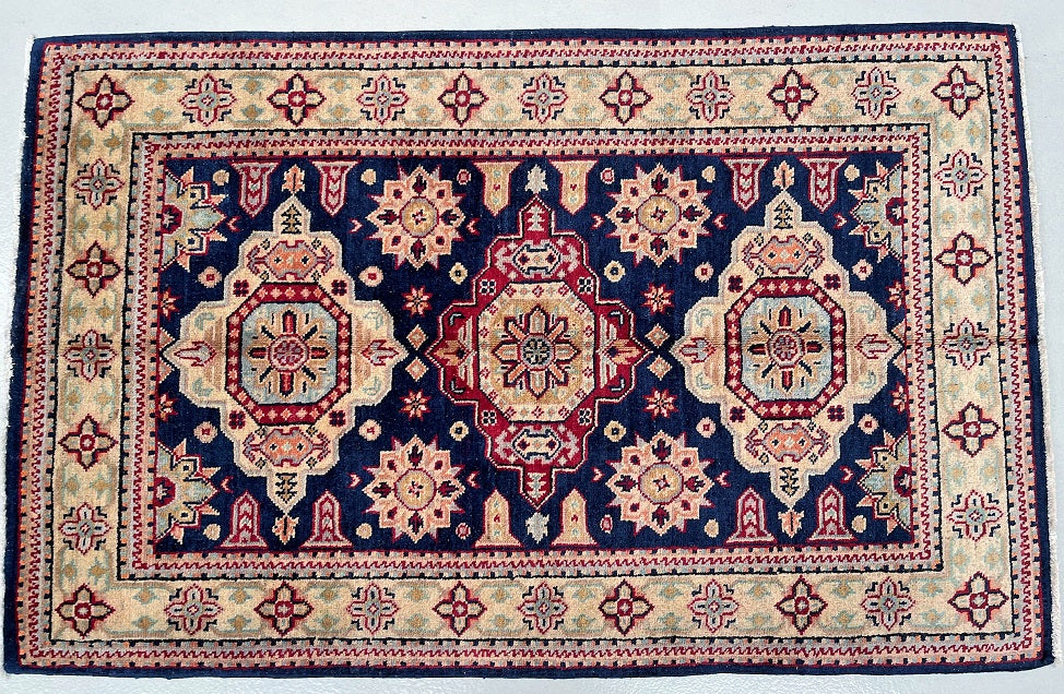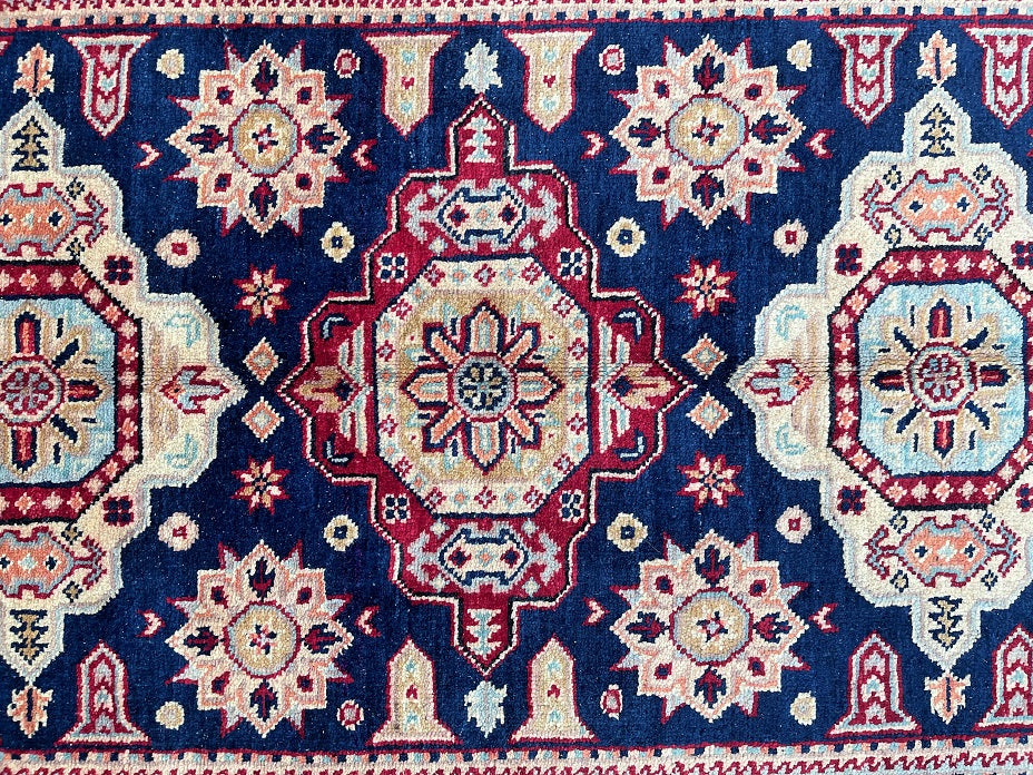 Free Shipping Australia Wide Offered! Certified Handmade Afghan Kazak Rug 151x96cmHand Knotted Afghan Kazak Rug. Above All It Has A Wool Pile On Cotton Base. Navy Blue, Red, Purple and Beige Tones Dyed Using Traditional Methods (Vegetable Dyes). L...