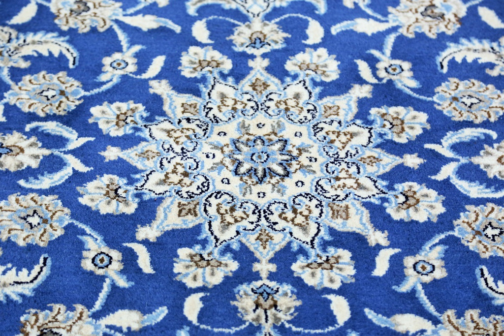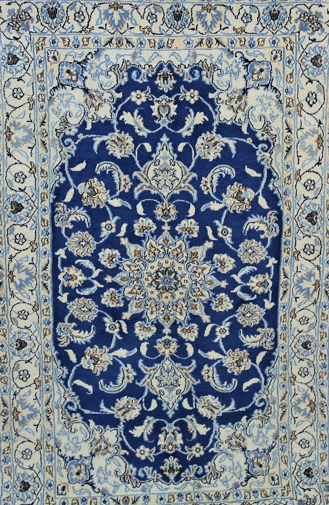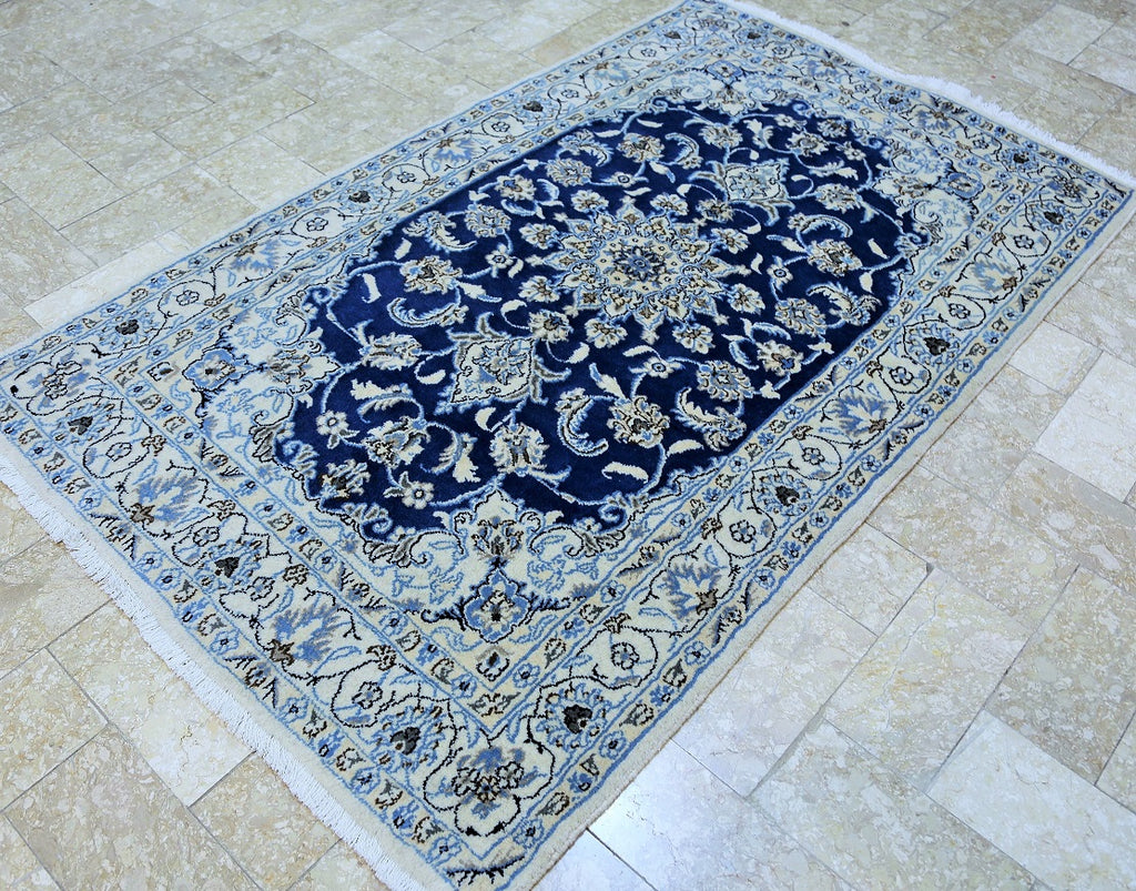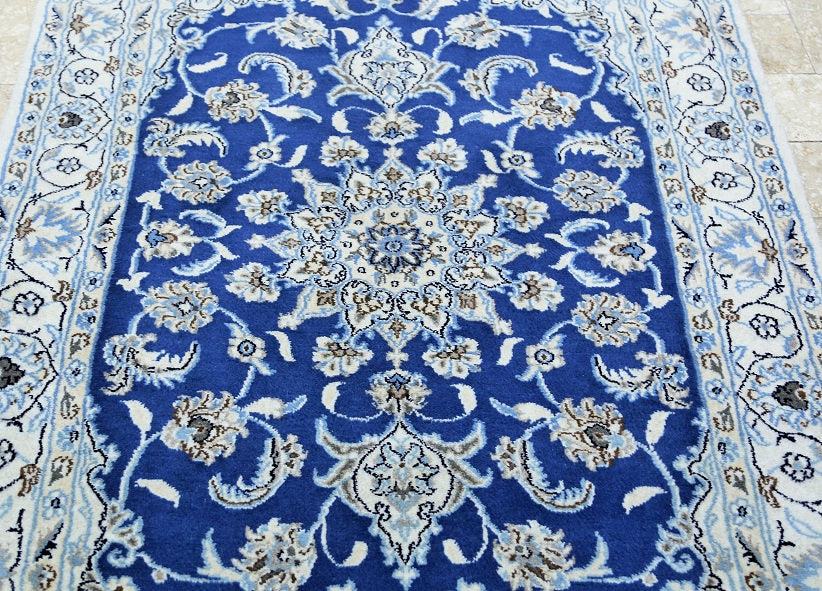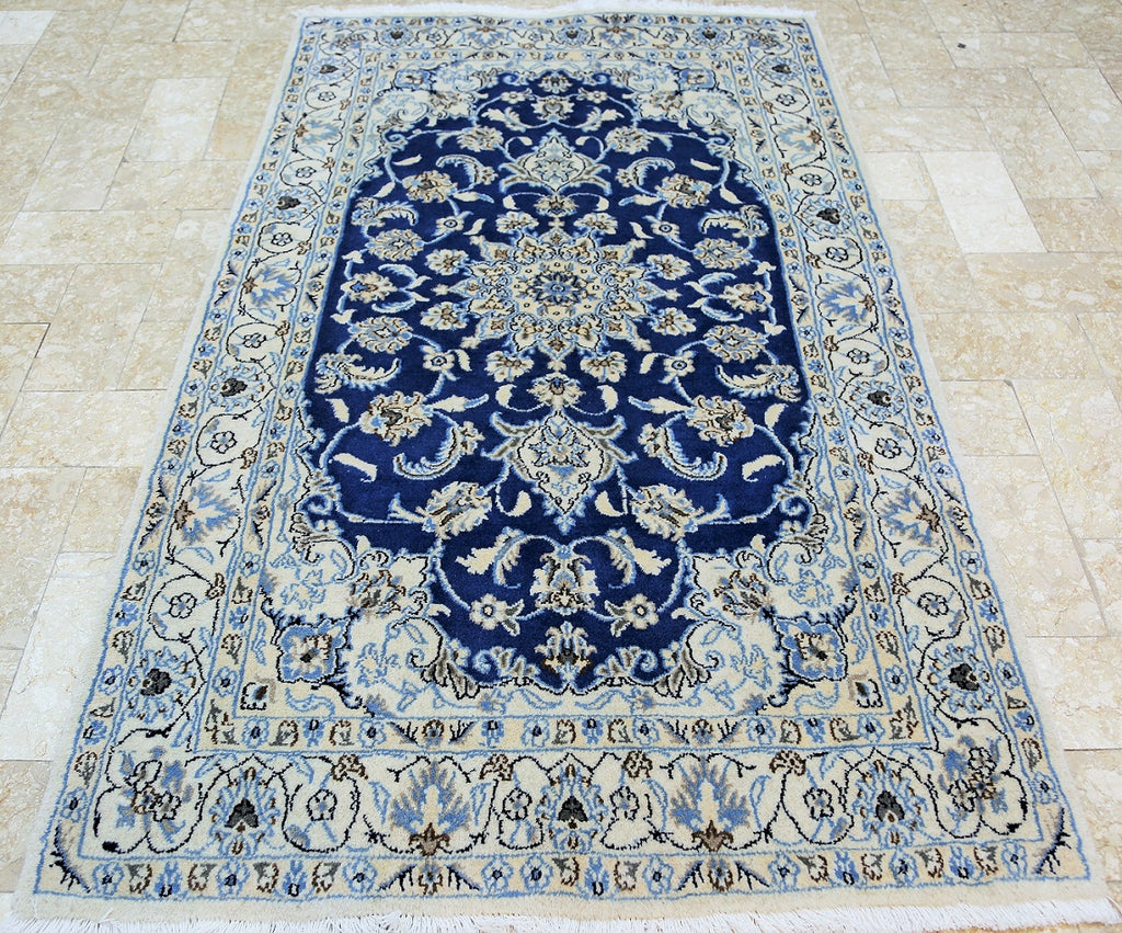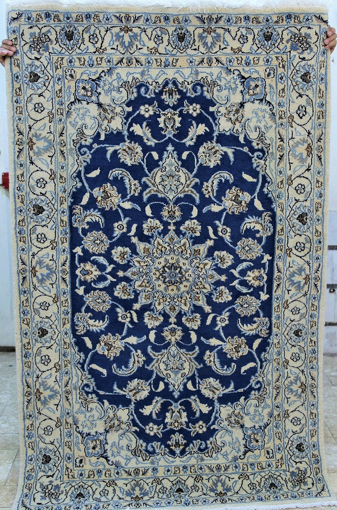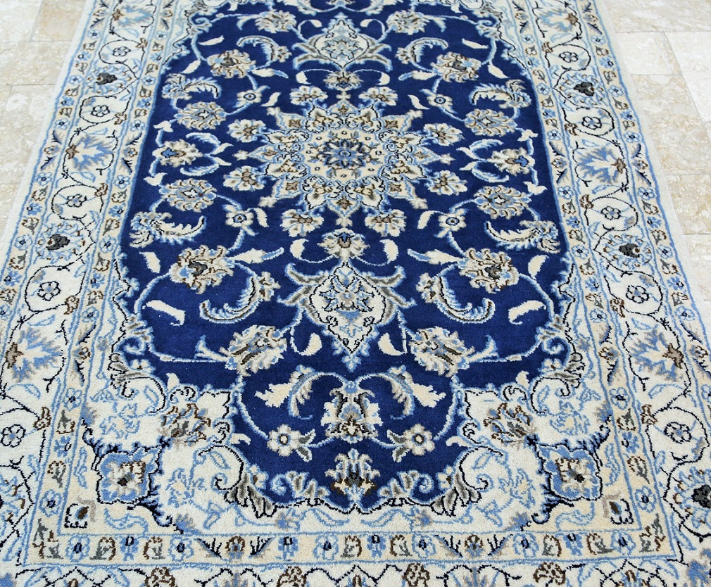 Fine Authentic Persian Carpet , It Is Hard To Get This Quality Hand Made Rug In Larger Sizes. Above All It Has Pure Lamb’s Pile On Cotton Base. It Also Have French Blue And Beige Tones Dyed Using Traditional Methods. Fine Quality Piece From City Of Nain.