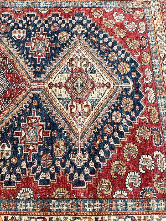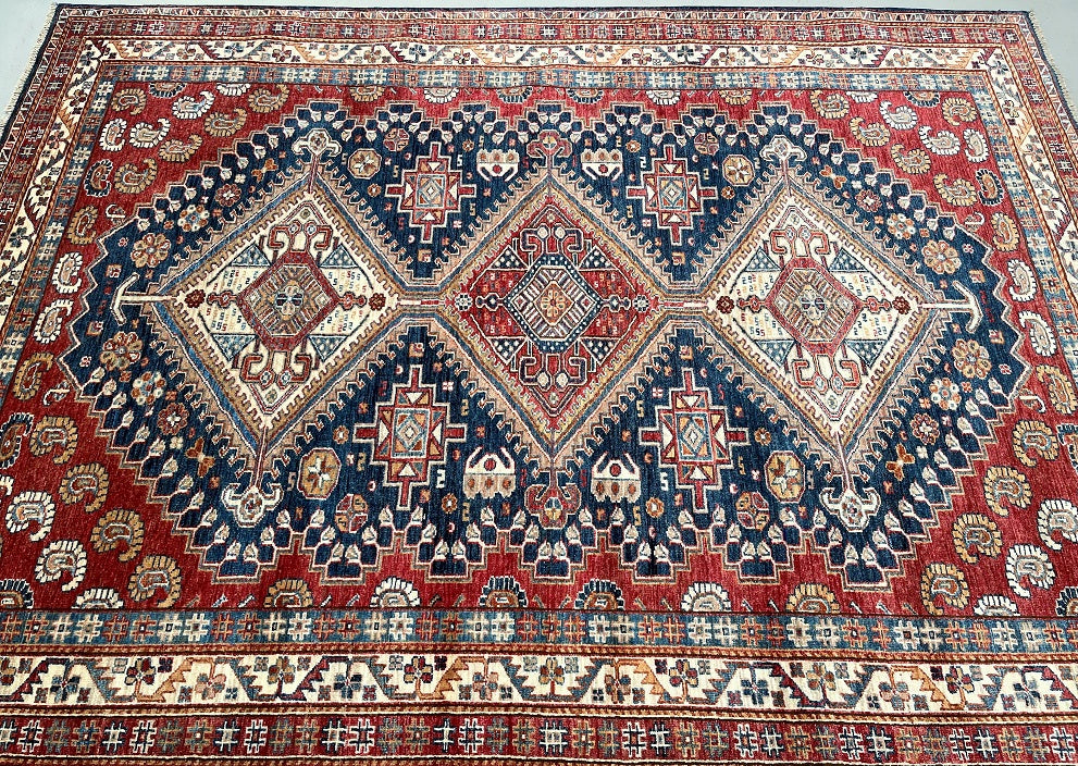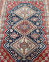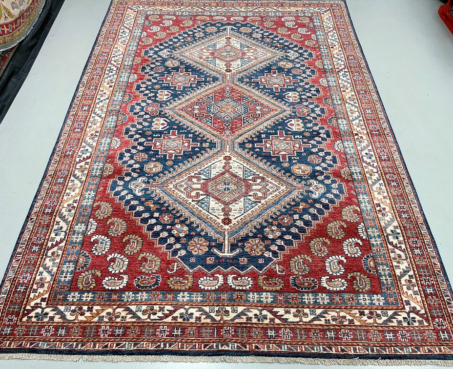 Room Size Authentic Hand Knotted Afghan Super Kazak Rug. Above All This Quality of Kazak Rugs Are Rare And Made Using Lamb’s Wool Pile on Cotton Base. Navy Blue, Terracotta Red, Orange, Green, gold And Beige Tone Dyed Using Traditional Methods (Vegetable Dyes). Last of True Woven Nomadic Art.