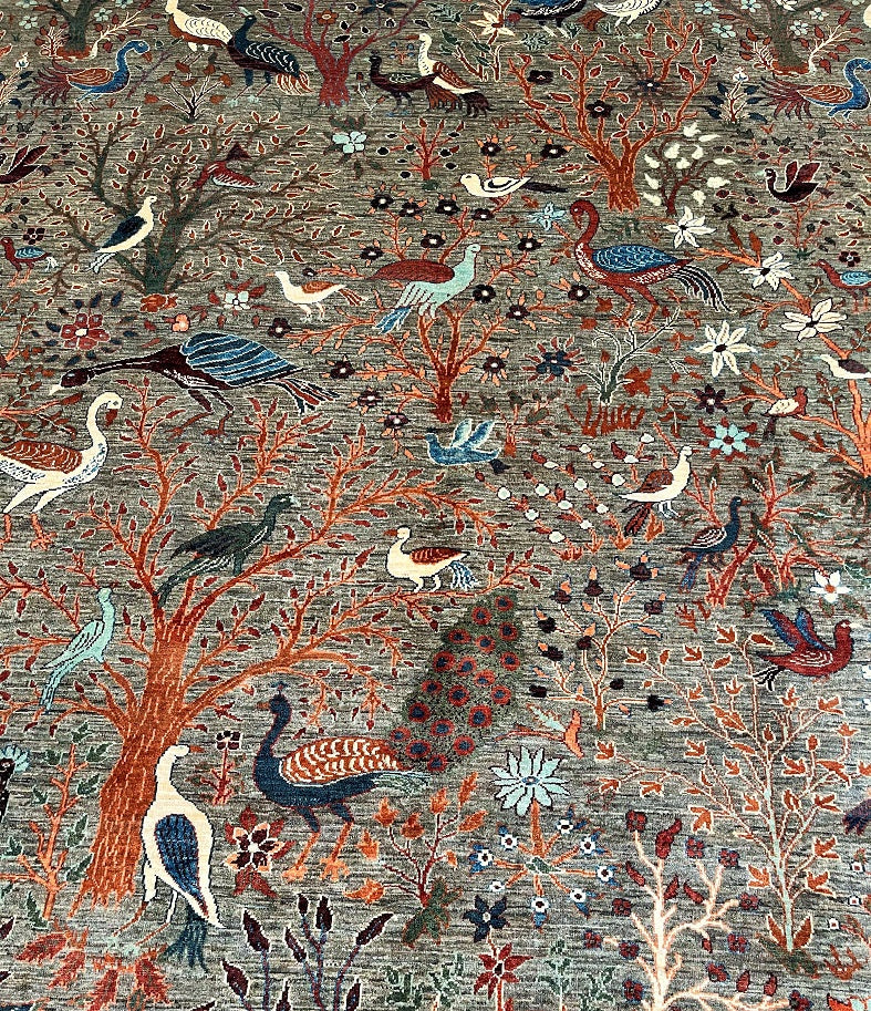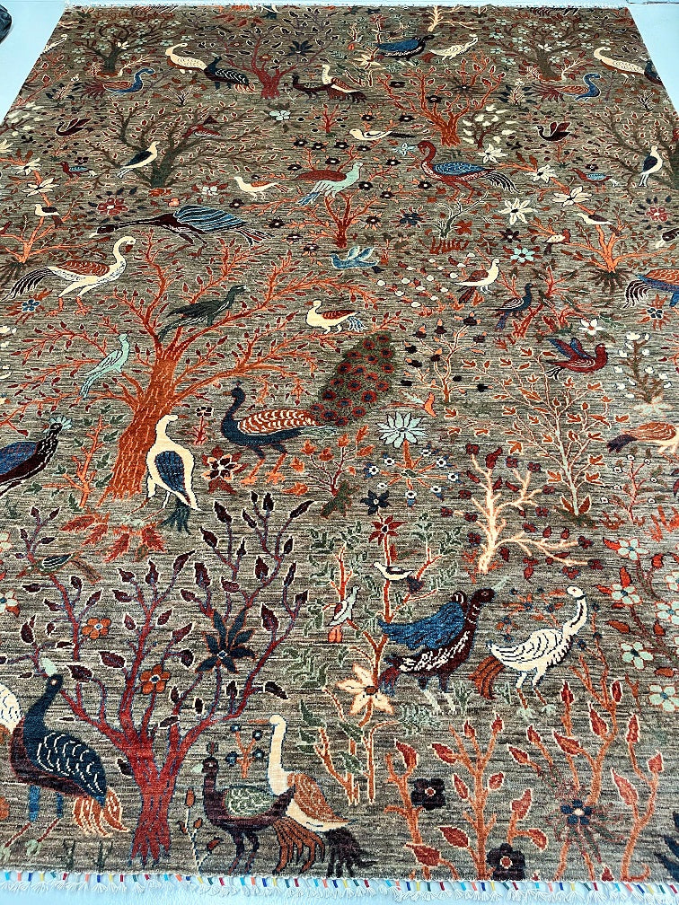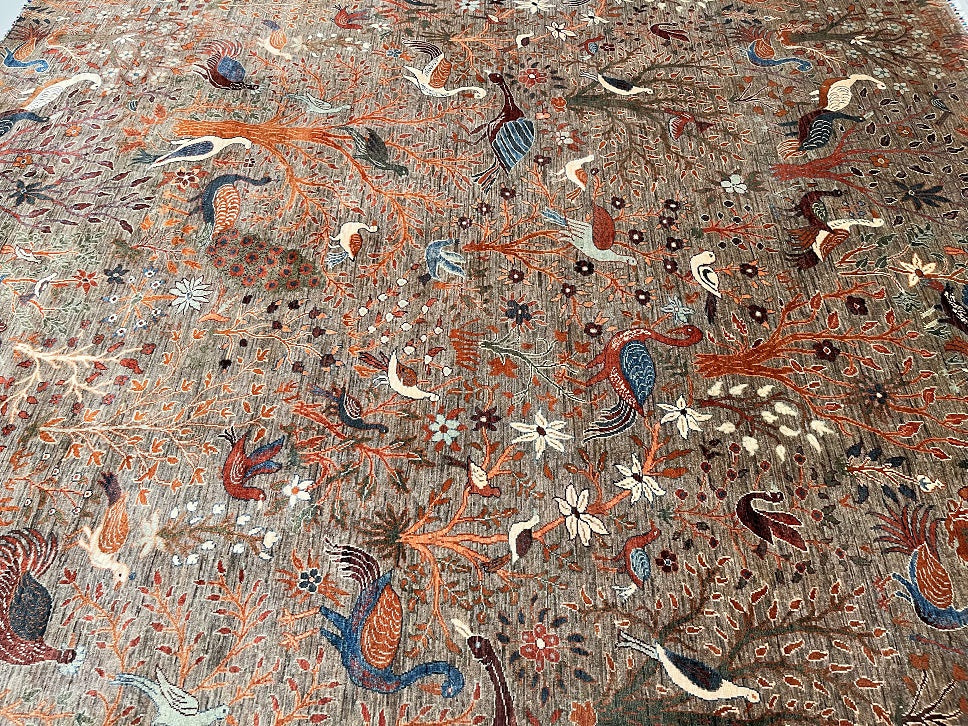 Large Room Size Garden Of Paradise Genuine Hand Knotted Afghan Chobi Rug. Above All It Has A Pure Hand Spun Wool Pile On Cotton Base. Beige, Light Brown, Caramel, Green And Blue Dyed Using Traditional Methods (Vegetable Dyes). Last of True Woven Nomadic Art.