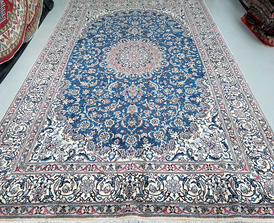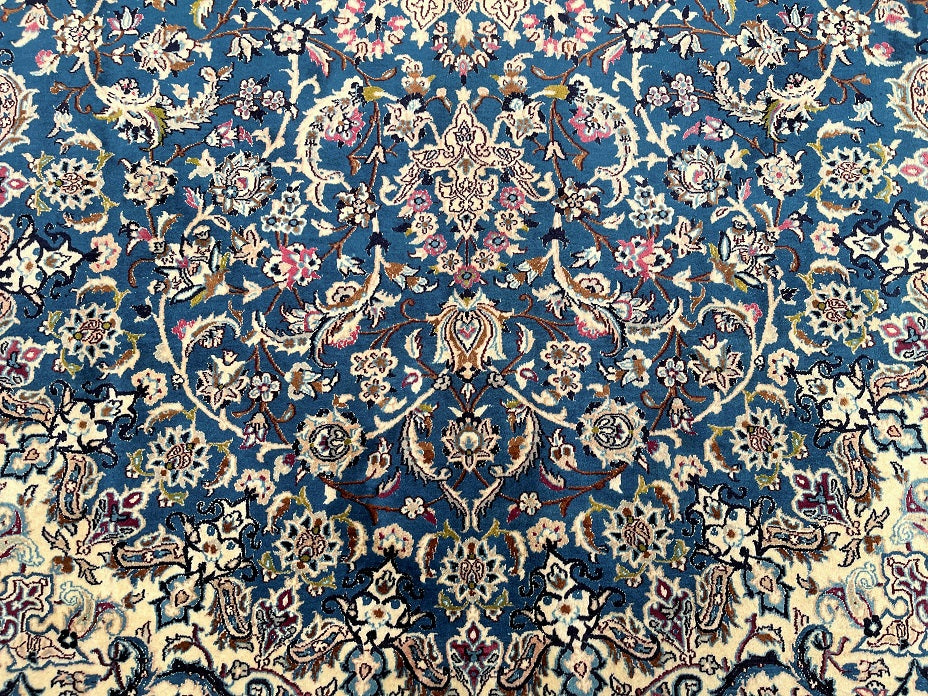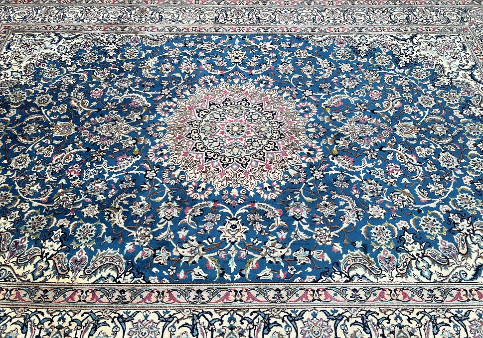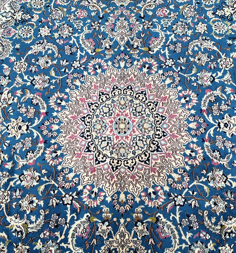 Superb Large Room Size Authentic Hand Knotted Vintage Persian Nain rug. Above All It Has A Lamb’s Wool And Silk-inlaid Pile On Cotton Base. It Also Has A Light Blue, Beige, Black, Pink And Red Tones Dyed Using Traditional Methods. Stunning Central Medallion Floral Design.