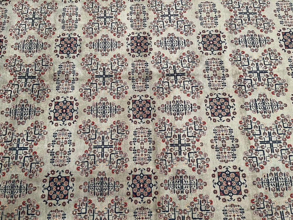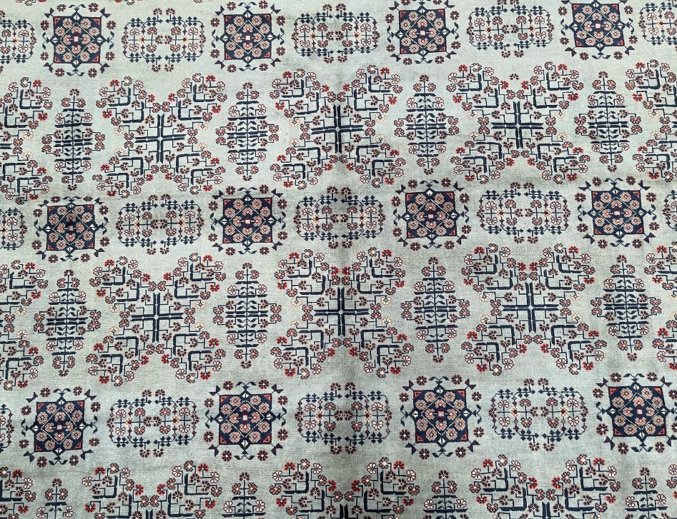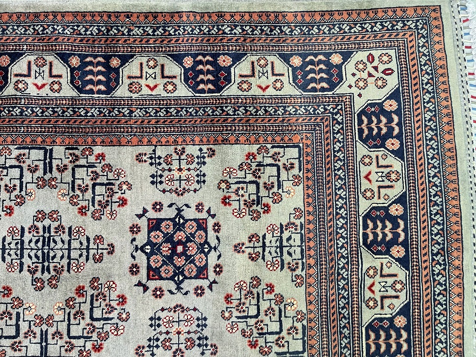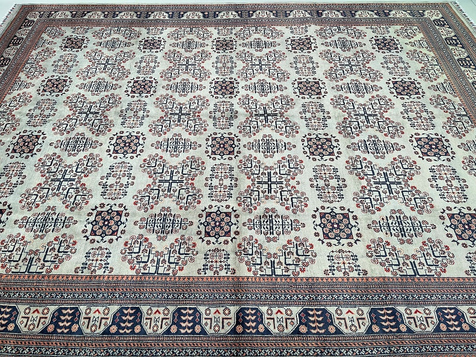 Fine Large Room Size Authentic Handmade Afghan Khamyab Rug. Above All It Has A Pure Lamb’s Wool Pile On Cotton Base. It Also Has A Beige, Indigo Blue, Brown And Peach/Pink Tones Dyed Using Traditional Methods.