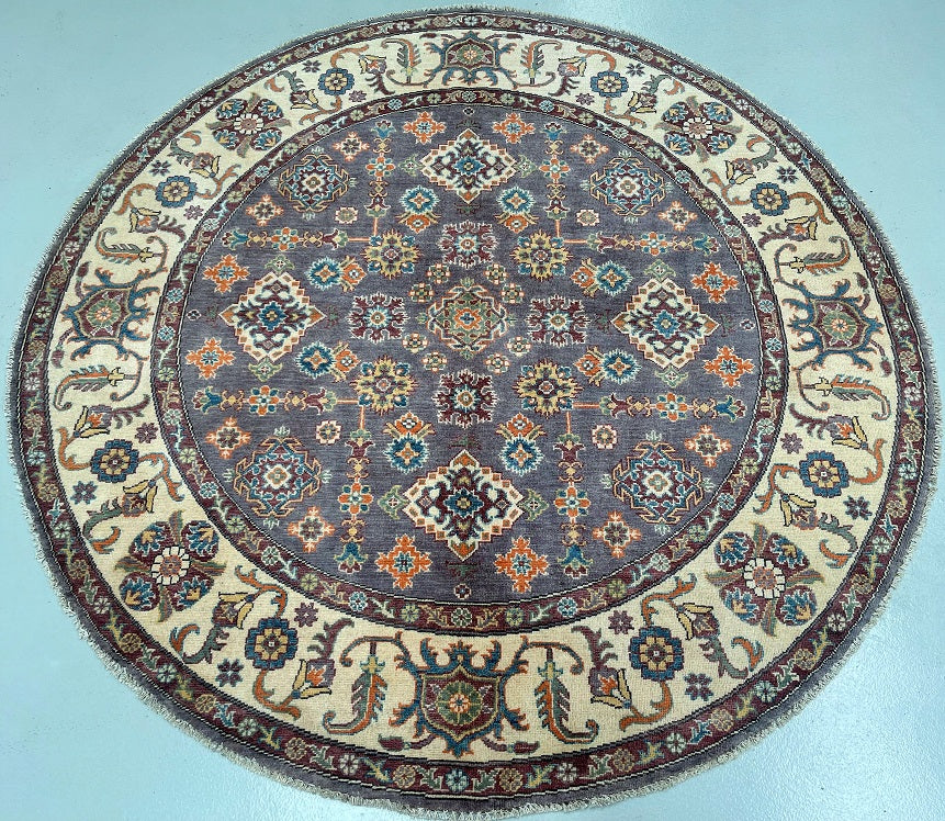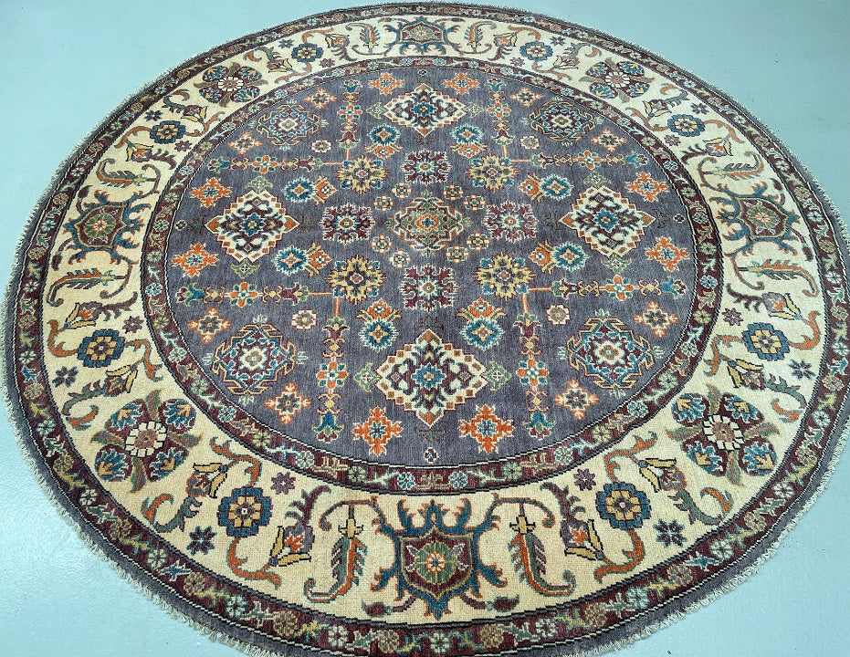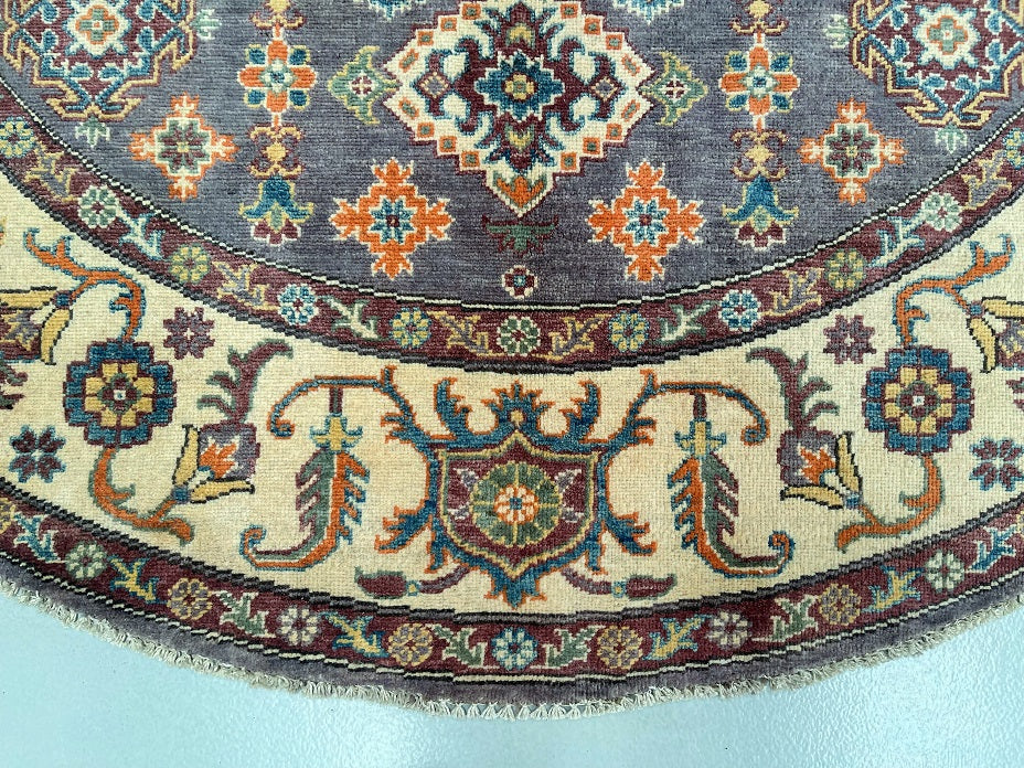 Rare Room Size Authentic Hand Knotted Afghan Kazak Round Rug. Above All It Is Very Hard To Weave Circular carpets. Pure Wool Pile On Cotton Base. Light Brown, Beige, Blue, Gold, Green And Orange Tone Dyed Using Traditional Methods (Vegetable Dyes). Last Of True Woven Tribal Art.