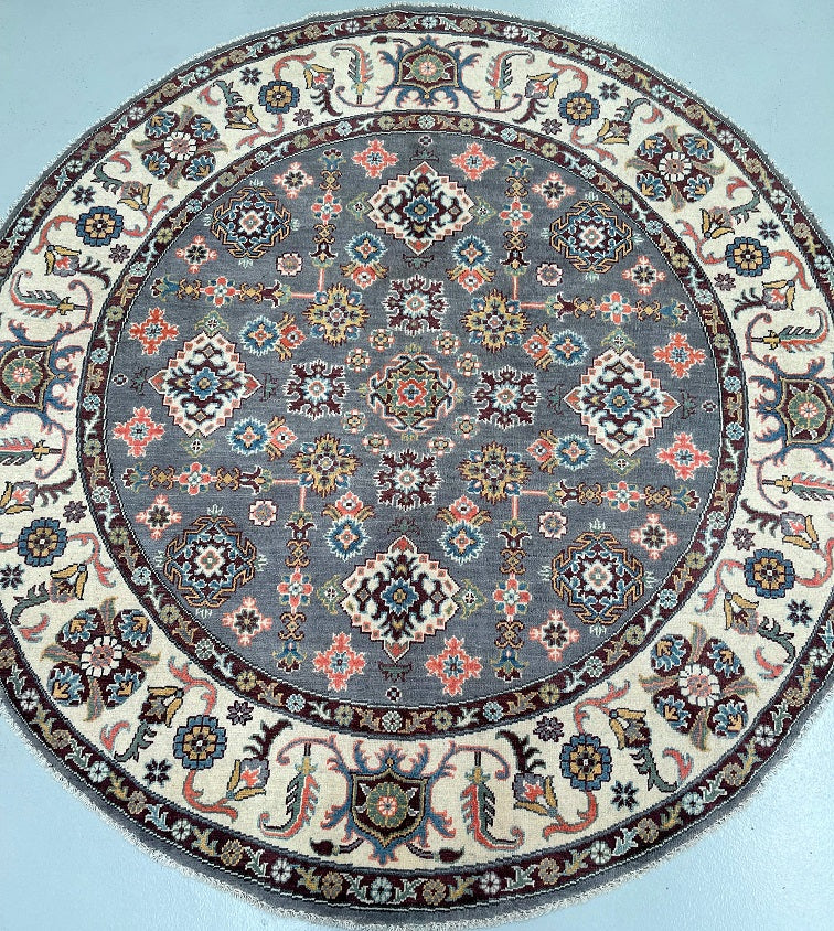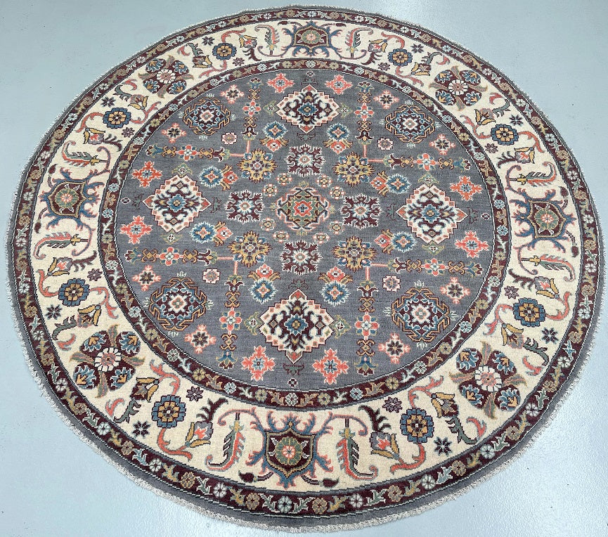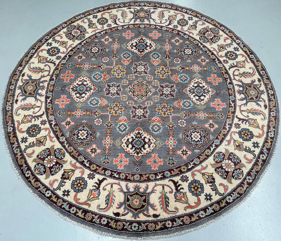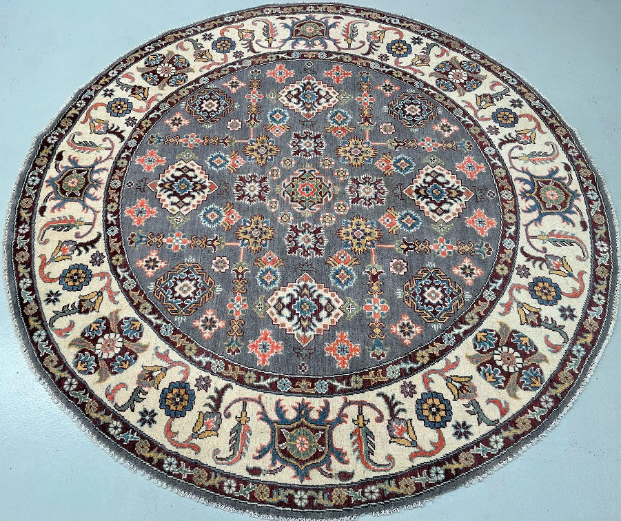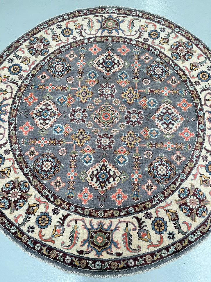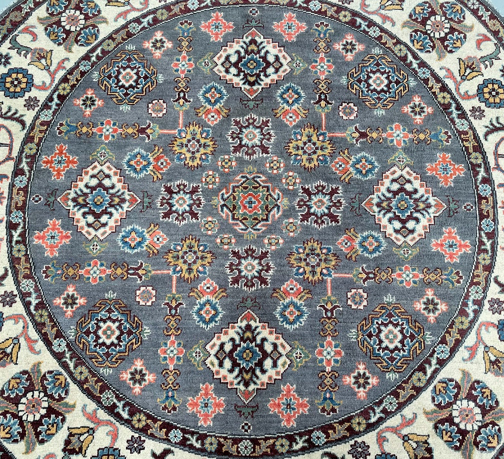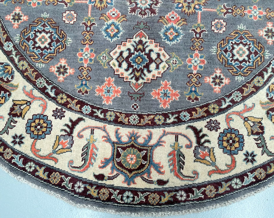 Rare Room Size Authentic Hand Knotted Afghan Kazak Round Rug. Above All It Is Very Hard To Weave Circular Carpets. Pure Wool Pile On Cotton Base. Soft Slate Grey Field With Ivory, Burgundy, Coral, Terracotta, Mustard Gold, Teal Blue, And Hints Of Navy And Olive Green Throughout The Motifs Dyed Using Traditional Methods (Vegetable Dyes). Last Of True Woven Tribal Art.