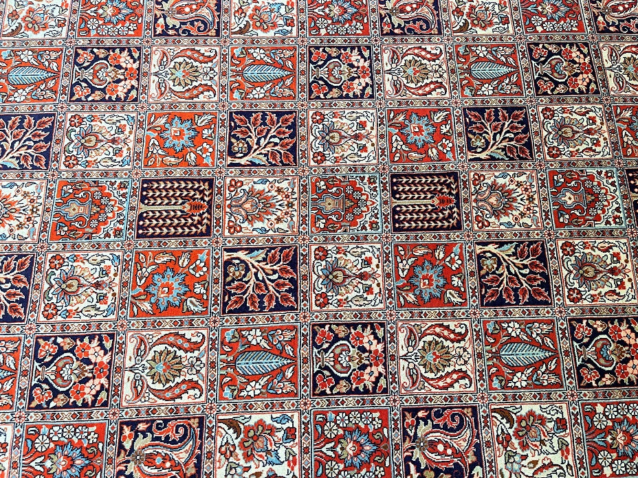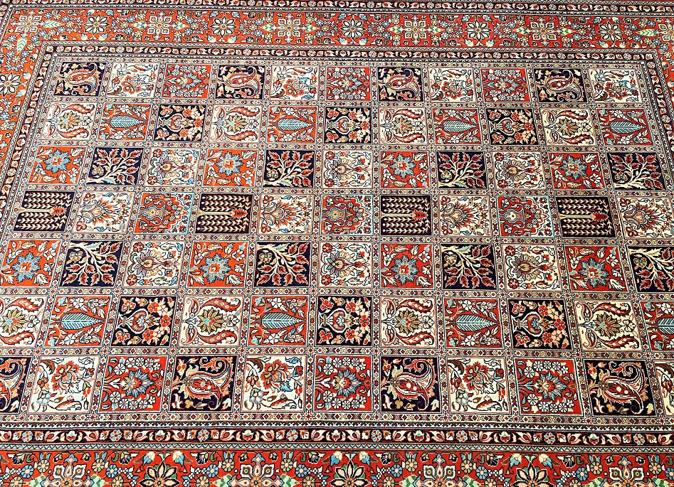 Superb Quality Room Size Authentic Handmade Persian Qum Rug. Above All It Is Hard To Get This Quality Handmade Rug In Such Unique Design. Pure Lamb’s Wool Pile on Cotton Base. Burnt Orange Tones Dyed Using Traditional Methods. Pin Point Quality Piece from City Of Qum.