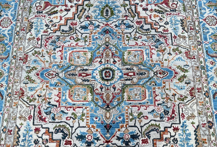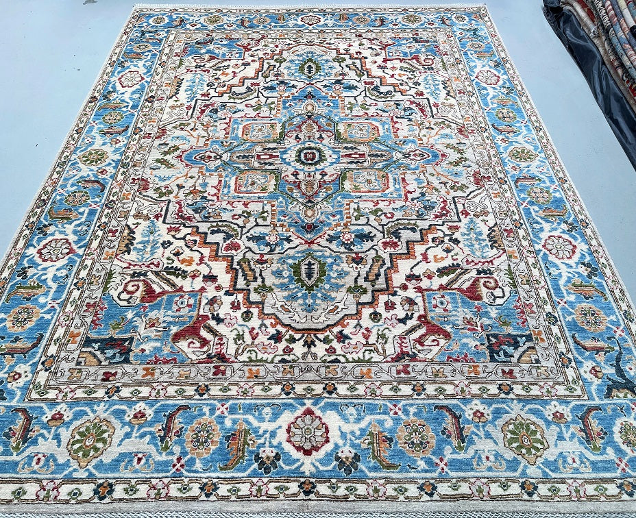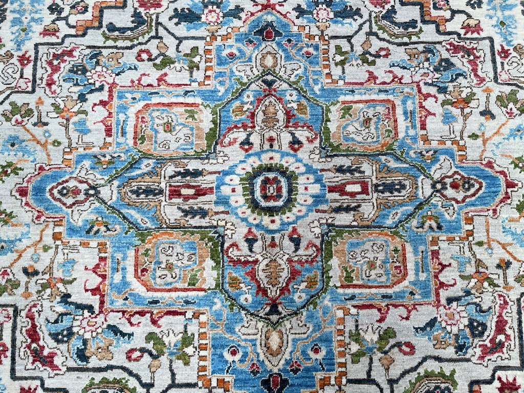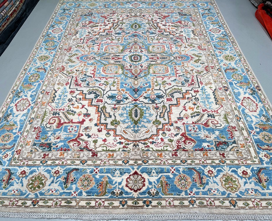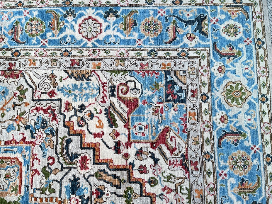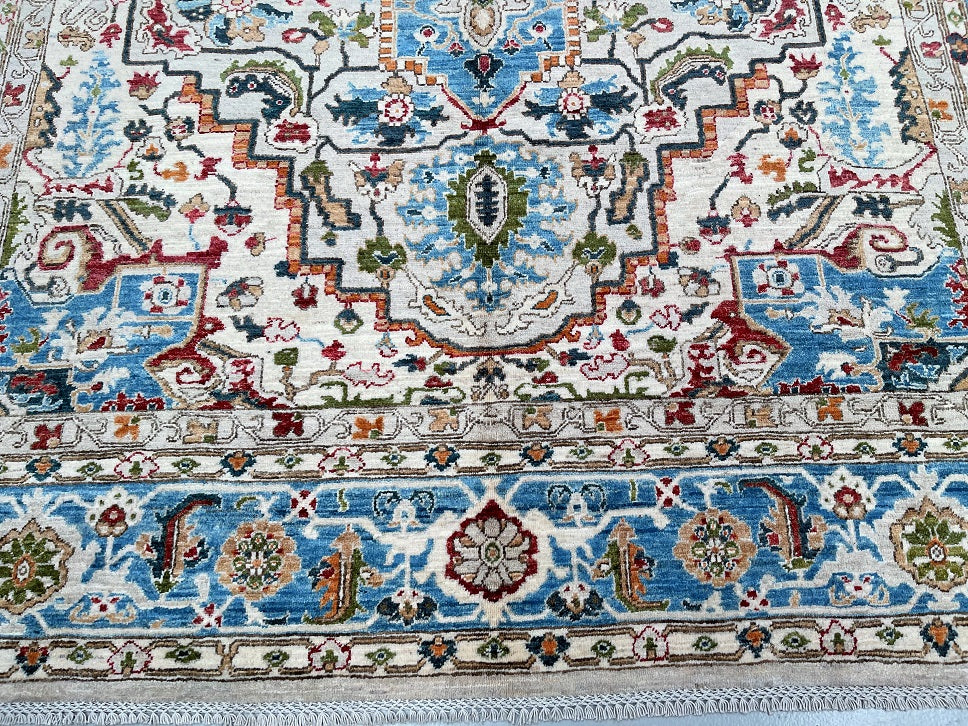Full Room Size Hand Knotted Afghan Serapi Heriz rug. Above All It Has A Pure Hand Spun Wool Pile On Cotton Base. Beige, Blue, Green, Terracotta Red Tone Dyed Using Traditional Methods (Vegetable Dyes). Last Of True Woven Tribal Art.