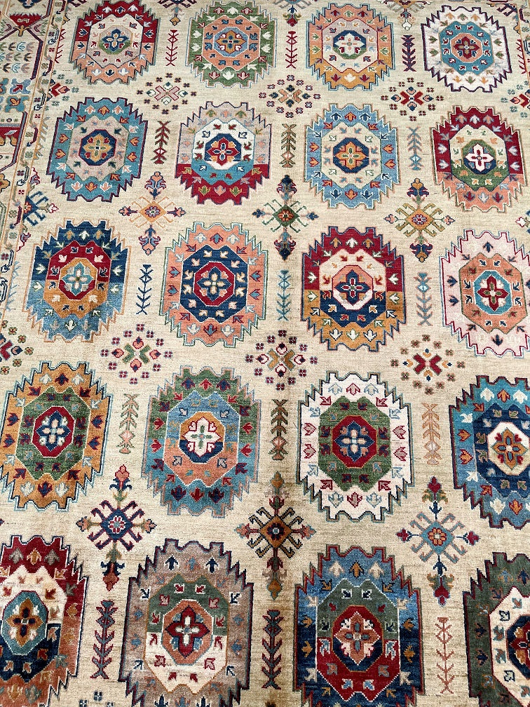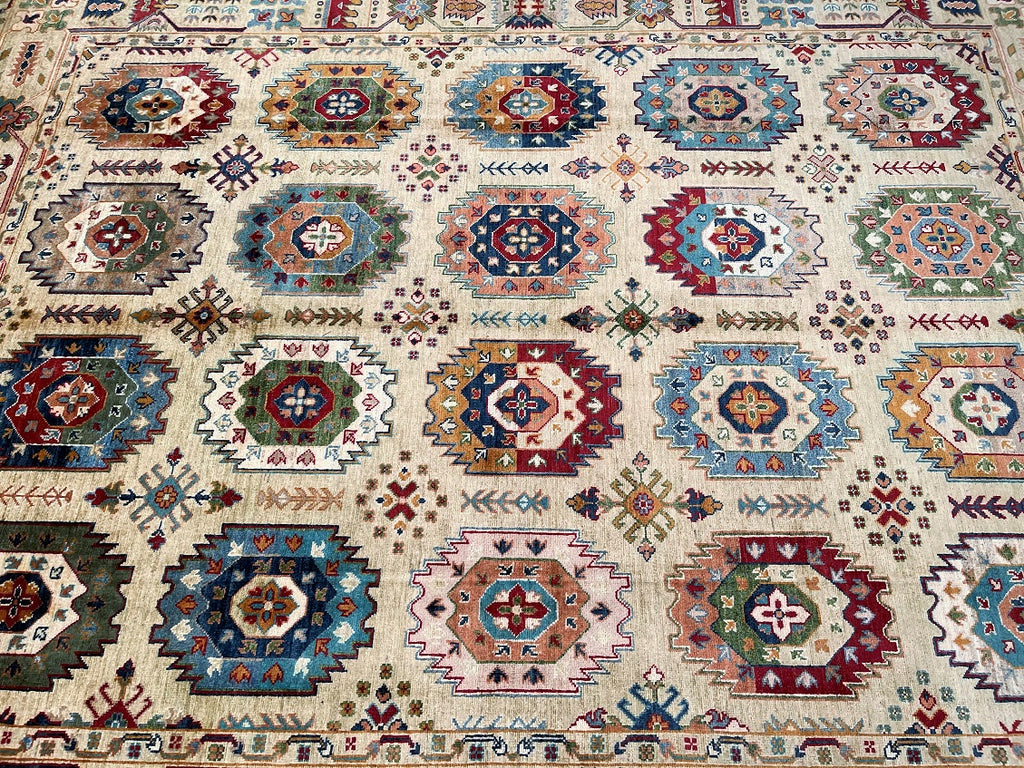Full Room Size Handmade Afghan Super Kazak Rug. Above All It Has A Pure Wool Pile On Cotton Base. A Warm Ivory Base Is Enriched With Sky Blue, Sage Green And Slate Tones, Highlighted By Rust Red, Soft Terracotta, Mustard And Navy Accents Dyed Using Traditional Methods (Vegetable Dyes). Last Of True Woven Tribal Art.