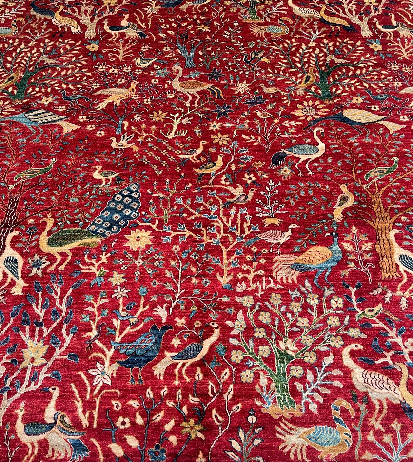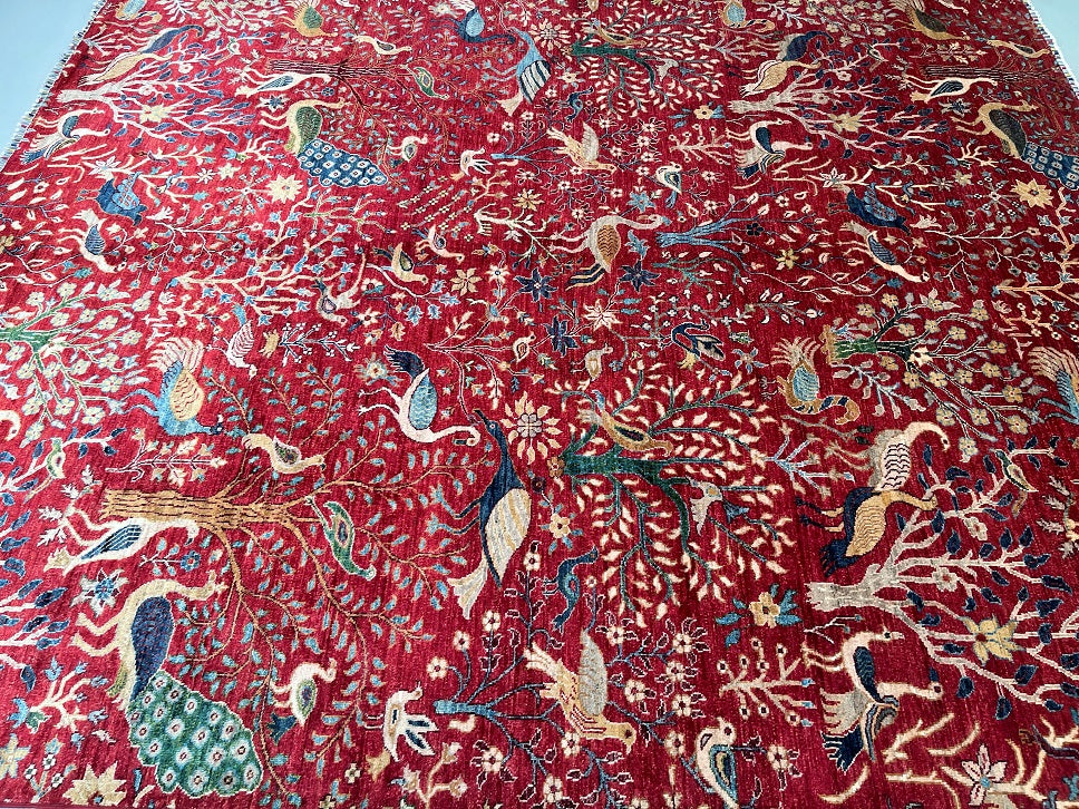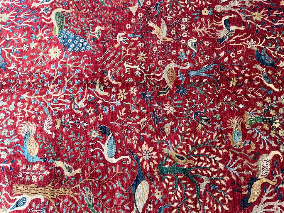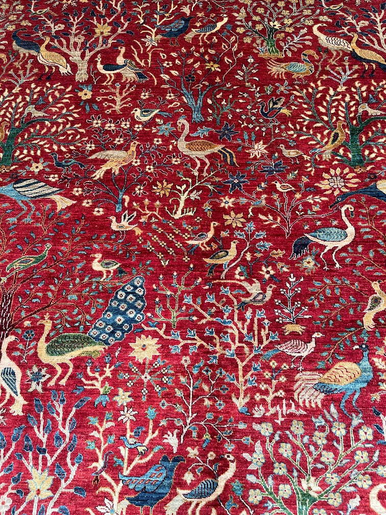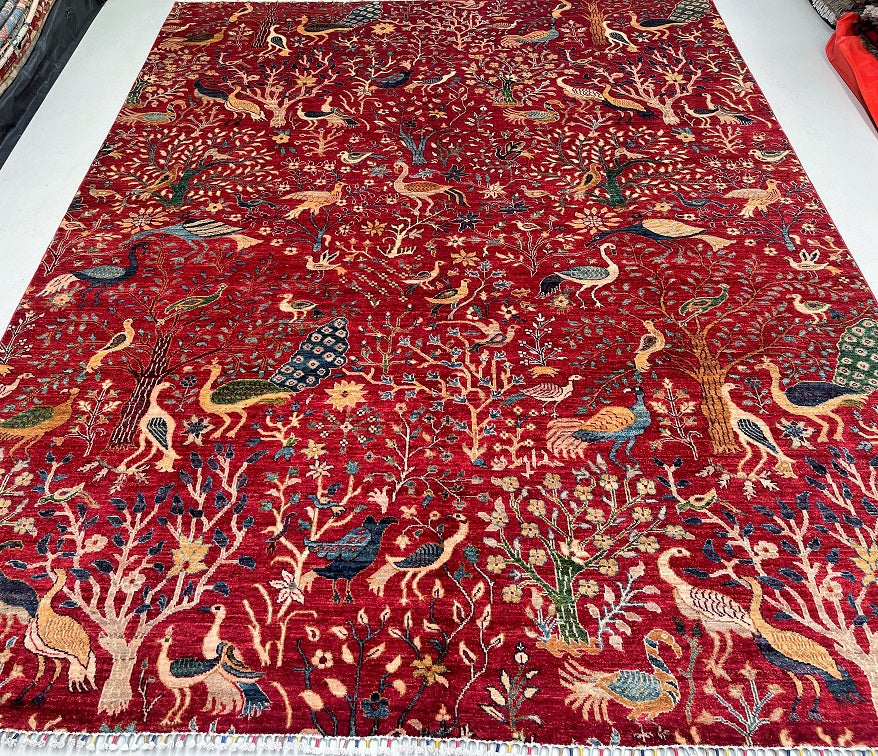 Large Room Size Garden Of Paradise Genuine Hand Knotted Afghan Chobi Rug. Above All It Has A Pure Hand Spun Wool Pile On Cotton Base. Red Background Dyed Using Traditional Methods (Vegetable Dyes). Last of True Woven Nomadic Art.