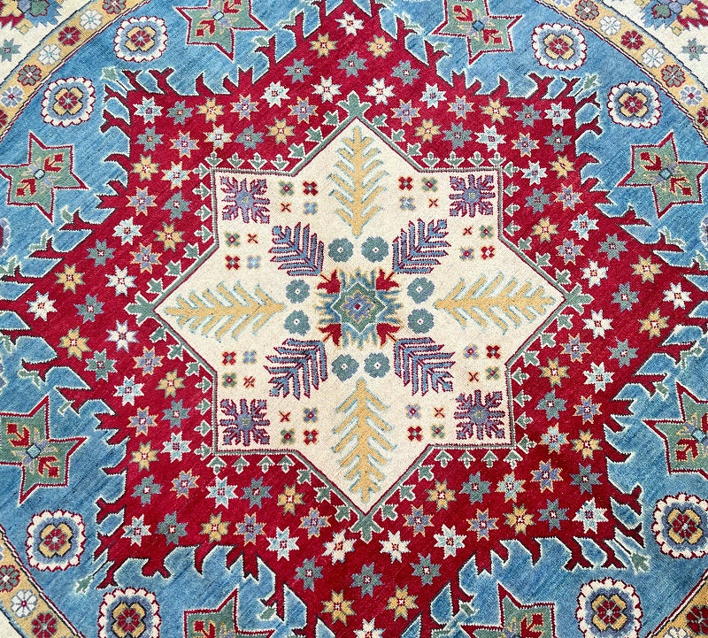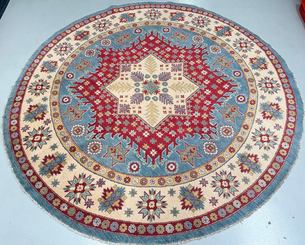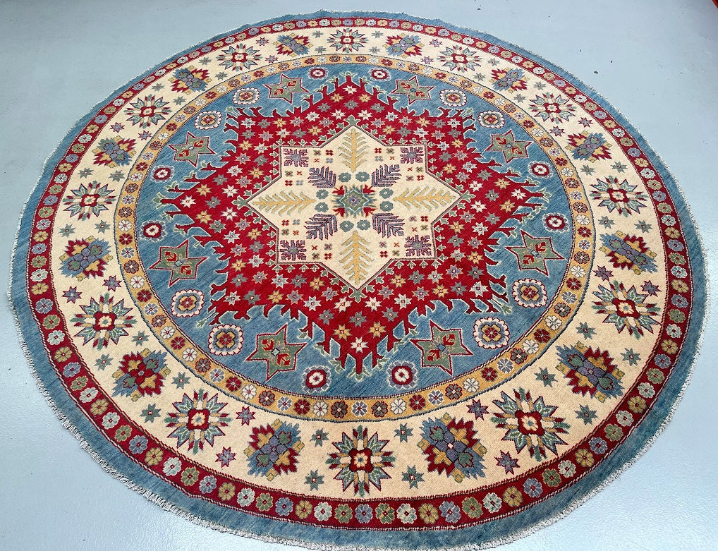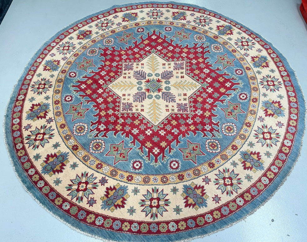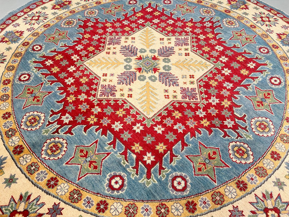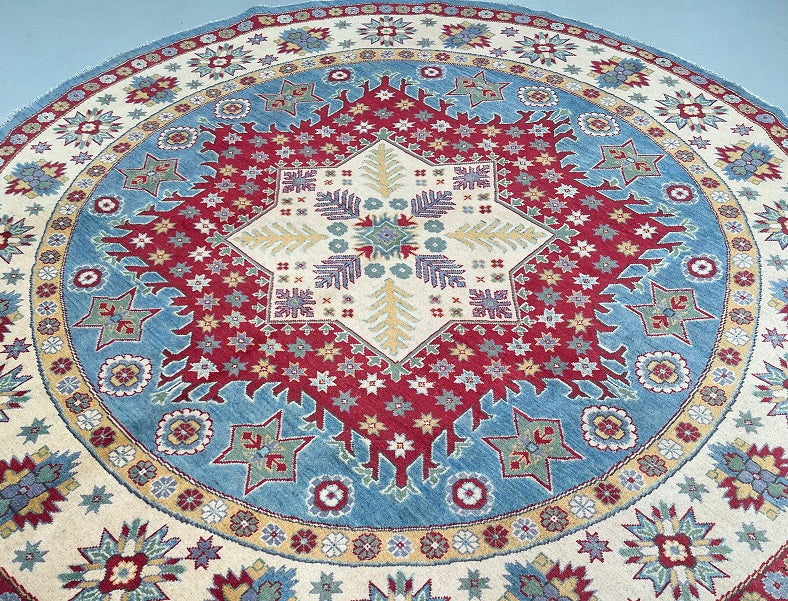 Decorative Full Room Size Genuine Hand Knotted Afghan Kazak Round Rug. Above All It Is Ideal For A Round Or Square Dinning Table. It Is Also Hard To Weave Circular Carpets. Pure Wool Pile On Cotton Base. Soft Ivory And Beige Base With Sky Blue, Red, Terracotta, Sage Green, Mustard Gold, And Subtle Navy Accents In Harmonious Traditional Tones. Dyed Using Traditional Methods (Vegetable Dyes). Last Of True Woven Tribal Art.