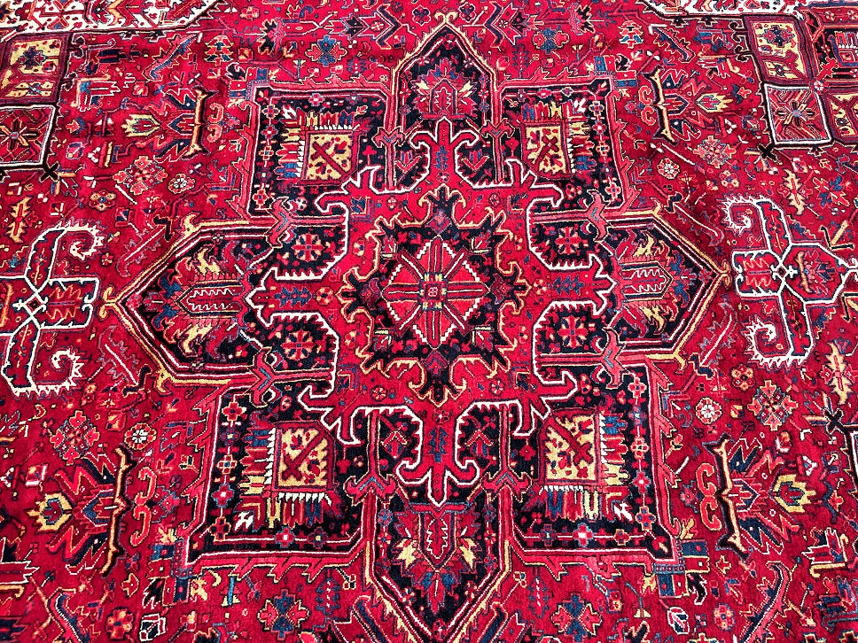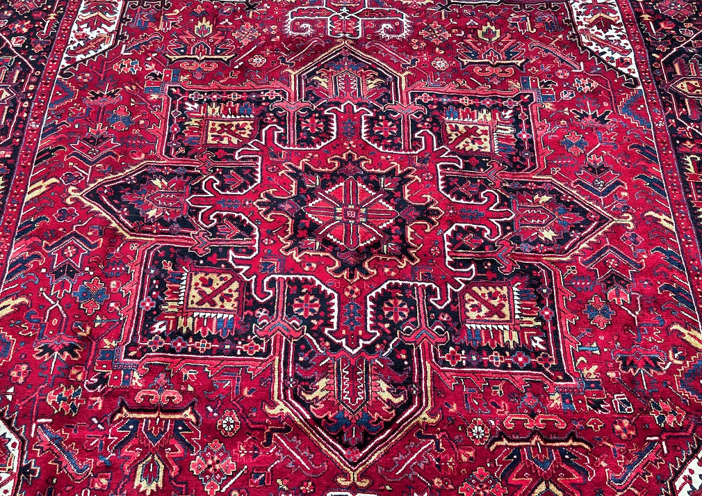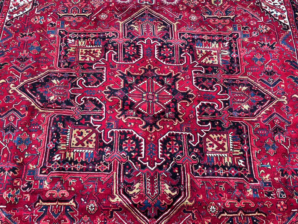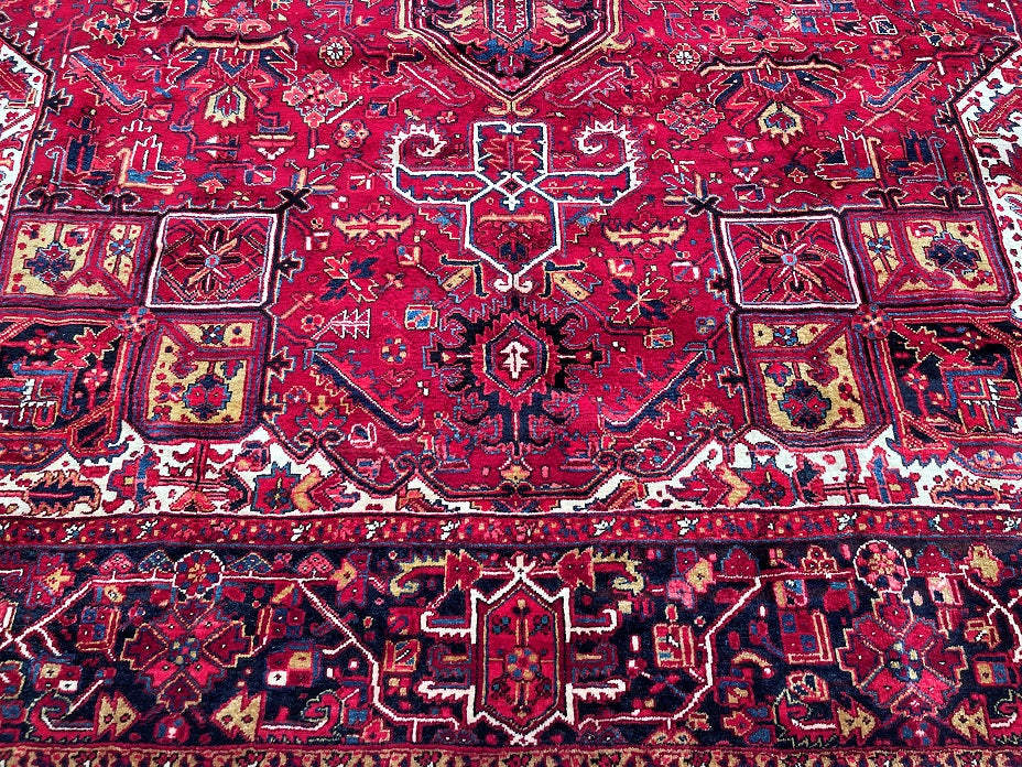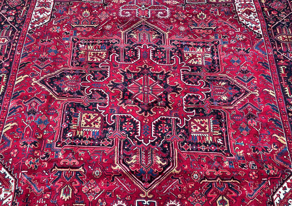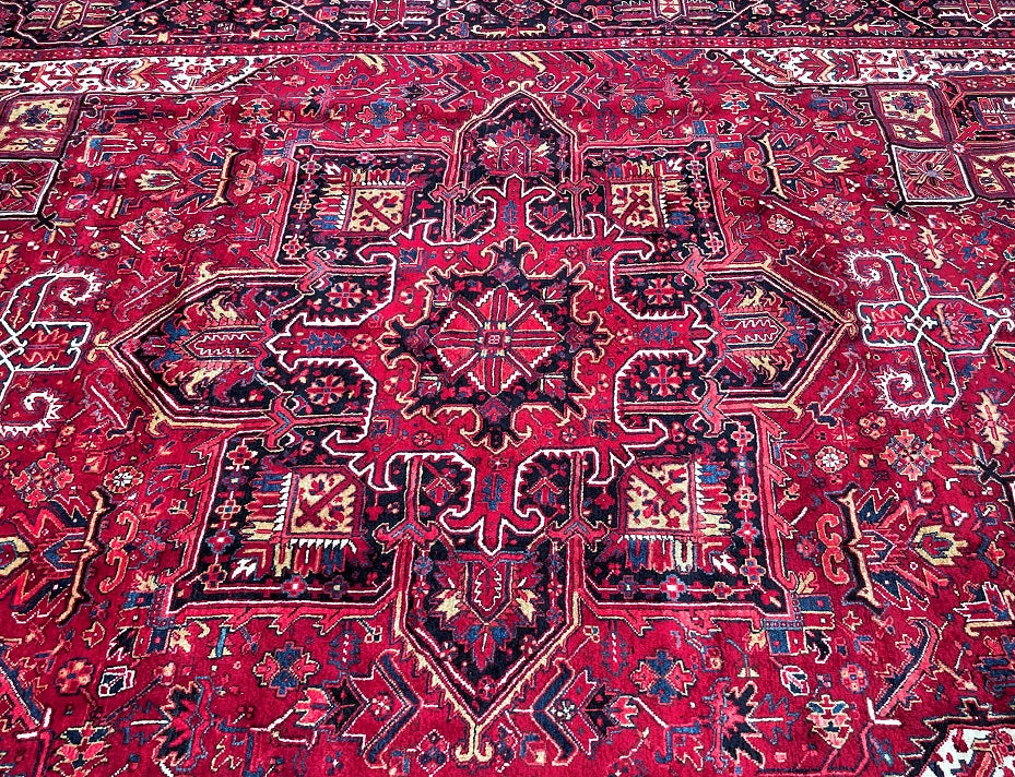 Stunning Massive Room Size Authentic Handmade Persian Heriz Rug. Above All Heriz Rugs Are One Of The Hardest Wearing And Very Soft Under The Feet. It Has A Pure Wool Pile On Cotton Base. It Also Has A Red, Brown, Beige, Mustard, Blue, Black, Pink And Gold Tone Dyed Using Traditional Methods.