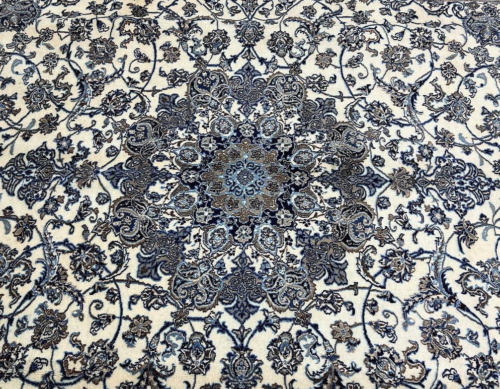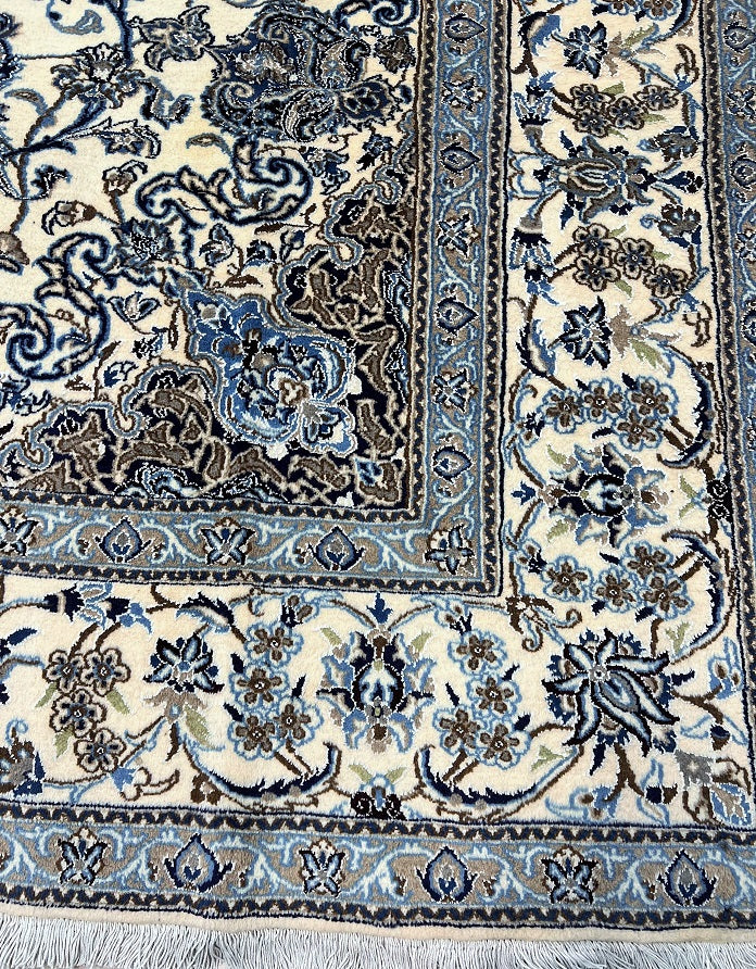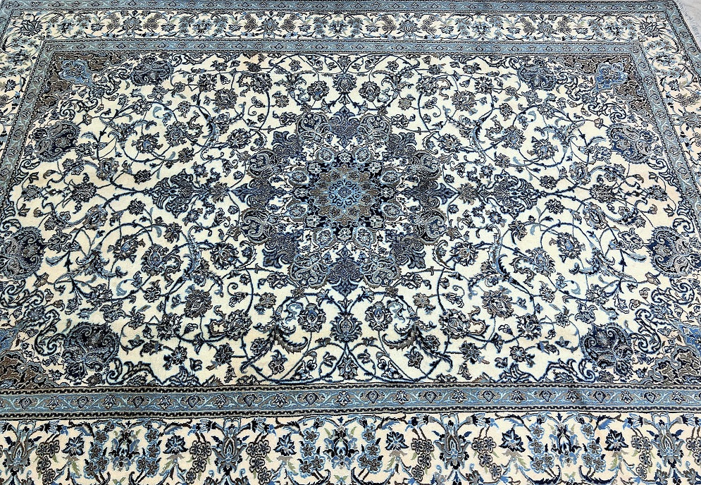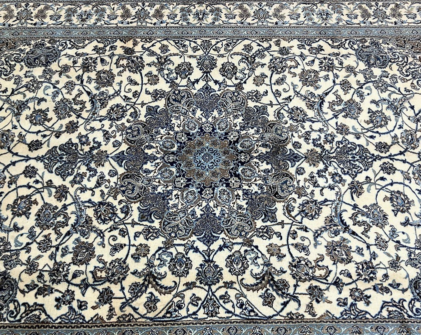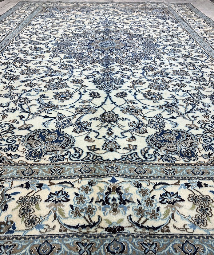 Large Room Size Hand Knotted Persian Nain Rug. Above All It Is Rare To Find A 4x3m Nain Rug. Lamb’s Wool Pile on Cotton Base. It Also Has A Beige, Light Blue, Black/Indigo Blue, Brown And Grey Tone Dyed Using Traditional Methods.