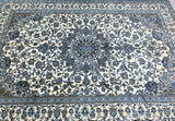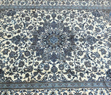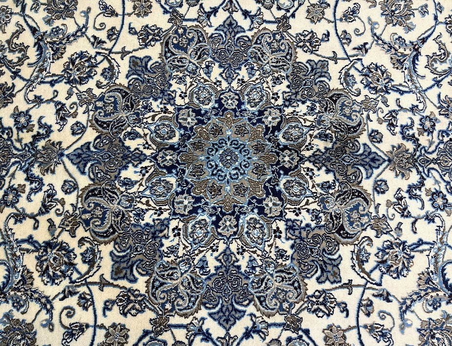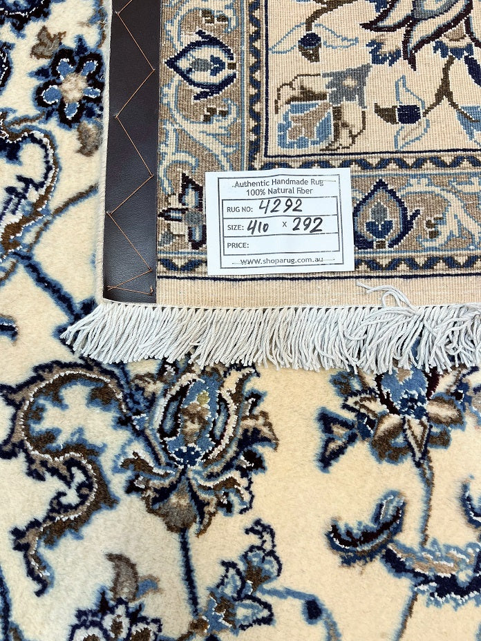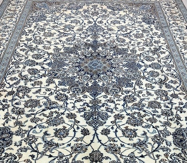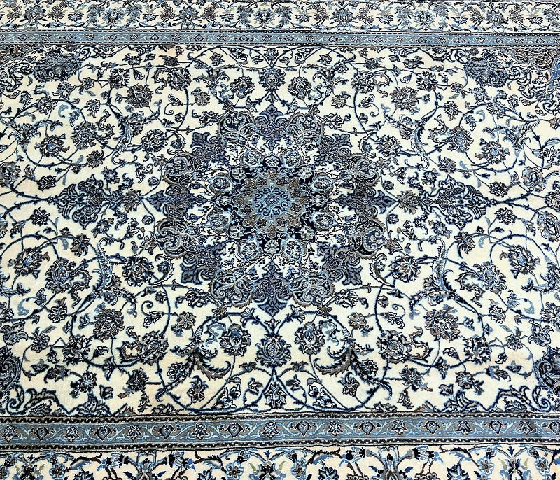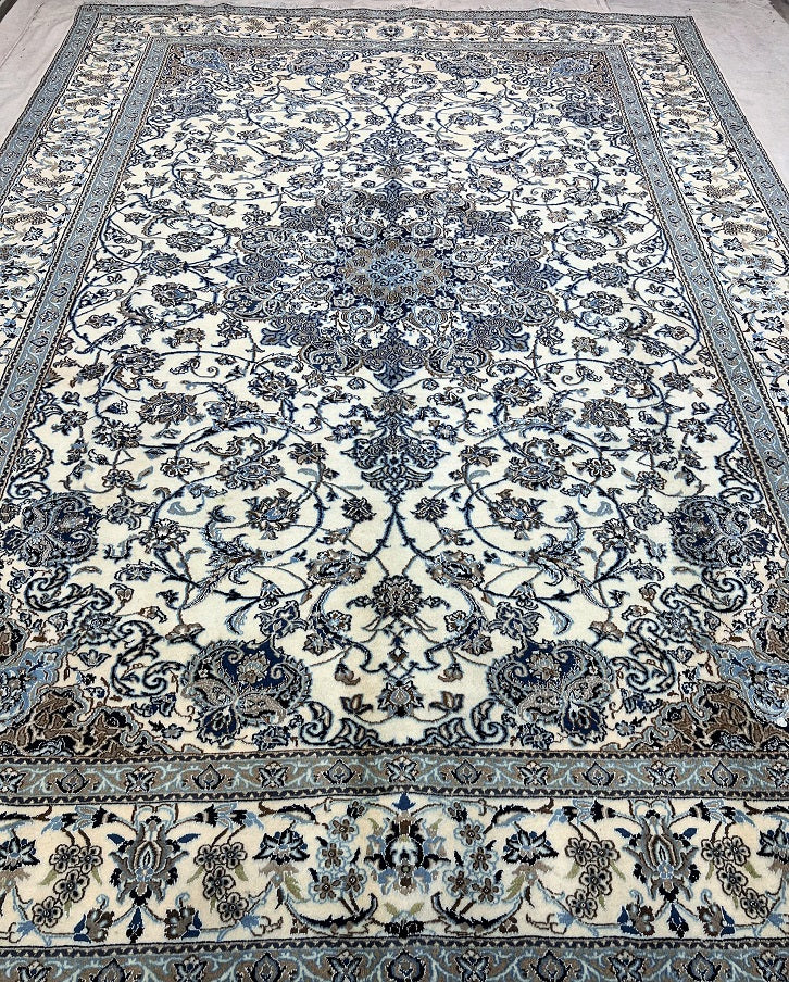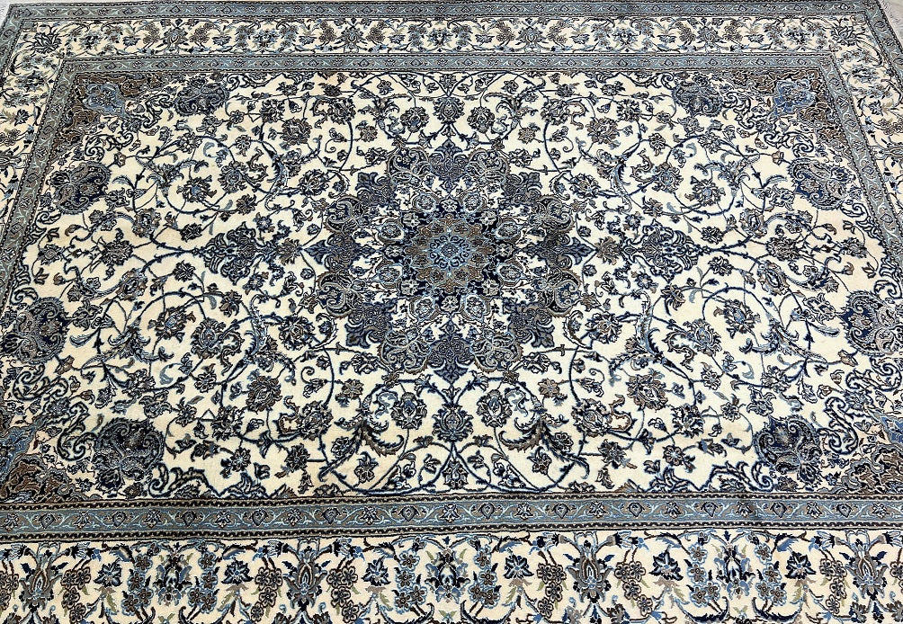 Large Room Size Hand Knotted Persian Nain Rug. Above All It Is Rare To Find A 4x3m Nain Rug. Lamb’s Wool Pile on Cotton Base. It Also Has A Beige, Light Blue, Black/Indigo Blue, Brown And Grey Tone Dyed Using Traditional Methods.
