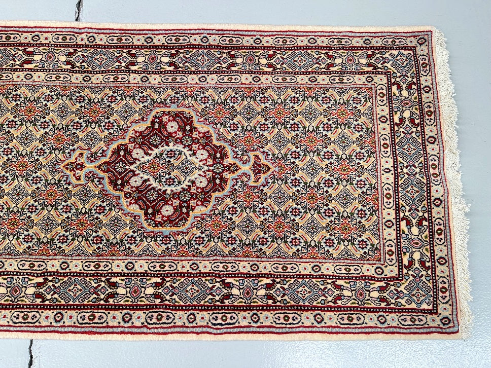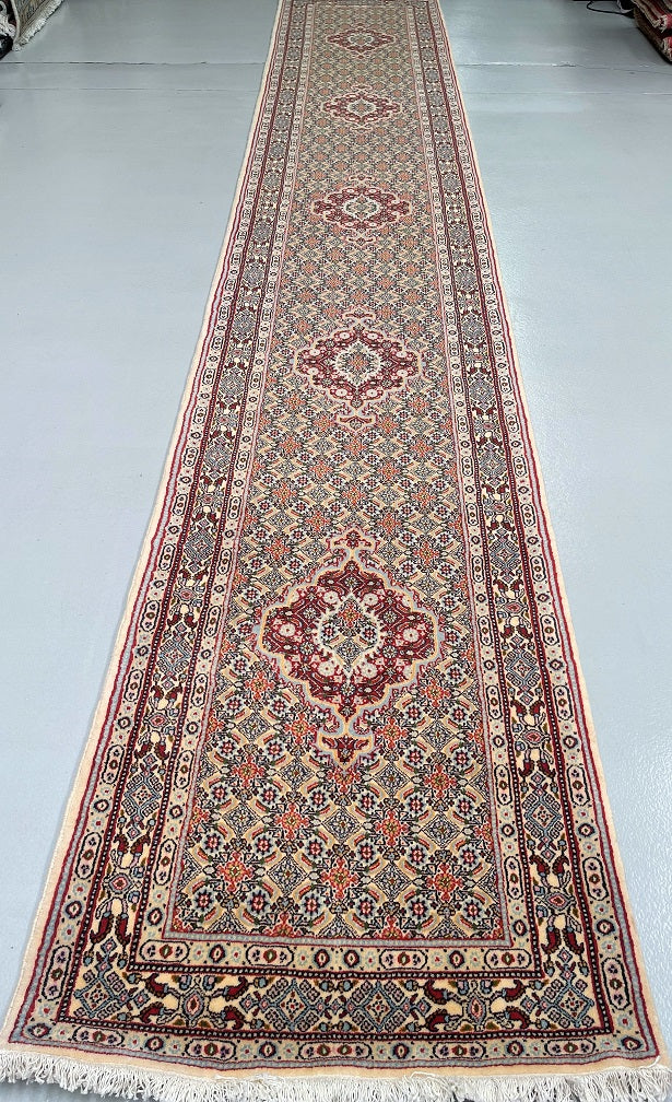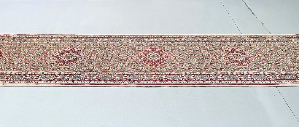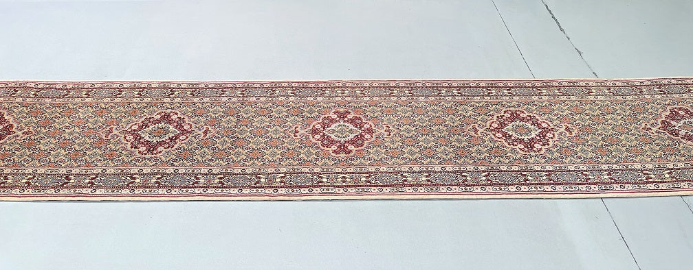 Superb Authentic Handmade Persian Birjand Hall Runner. Above All It Has A Lamb’s Wool and Touch of Silk Pile on Cotton Base. It Also Has A Beige, Gold, Red, Black, Light Blue, Pink And Orange Tone Dyed Using Traditional Methods.
