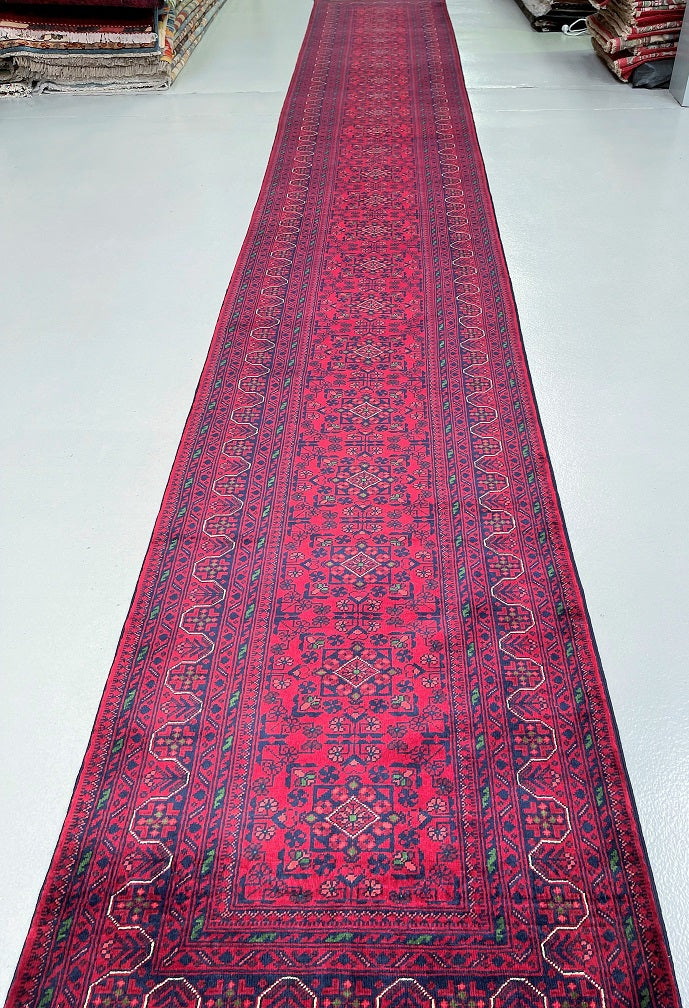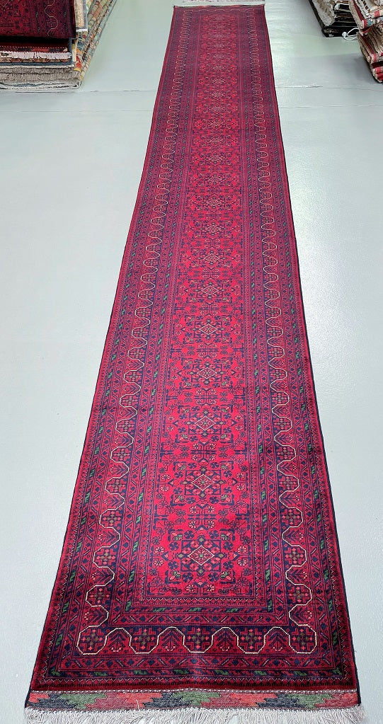 Superb Quality Hand Knotted Tribal Afghan Kunduz Hall Runner, a truly exceptional piece that exudes elegance and craftsmanship. This runner is meticulously crafted with a pure lamb's wool pile on a cotton base, ensuring both comfort and durability.