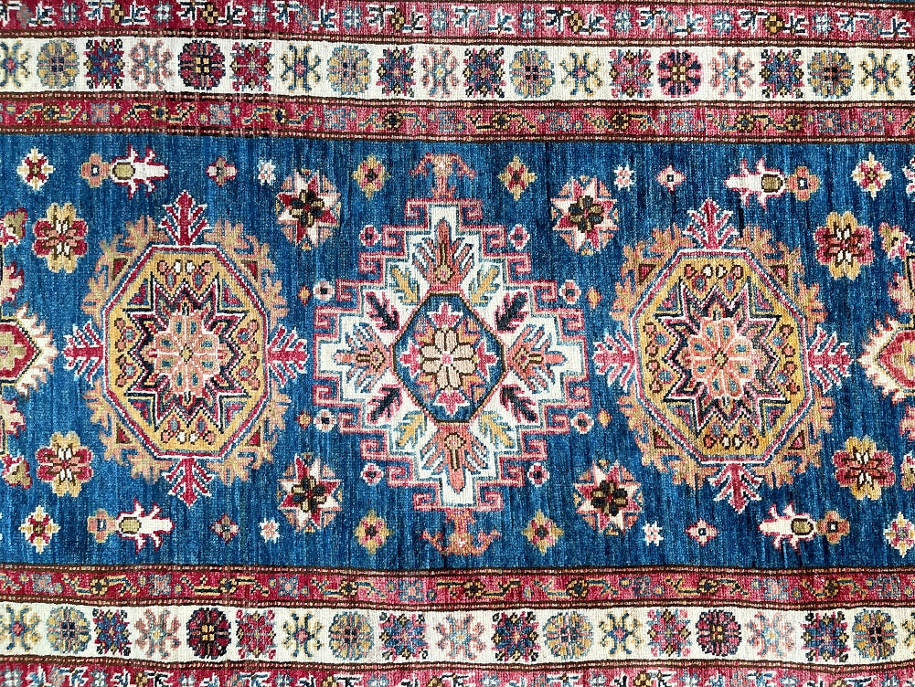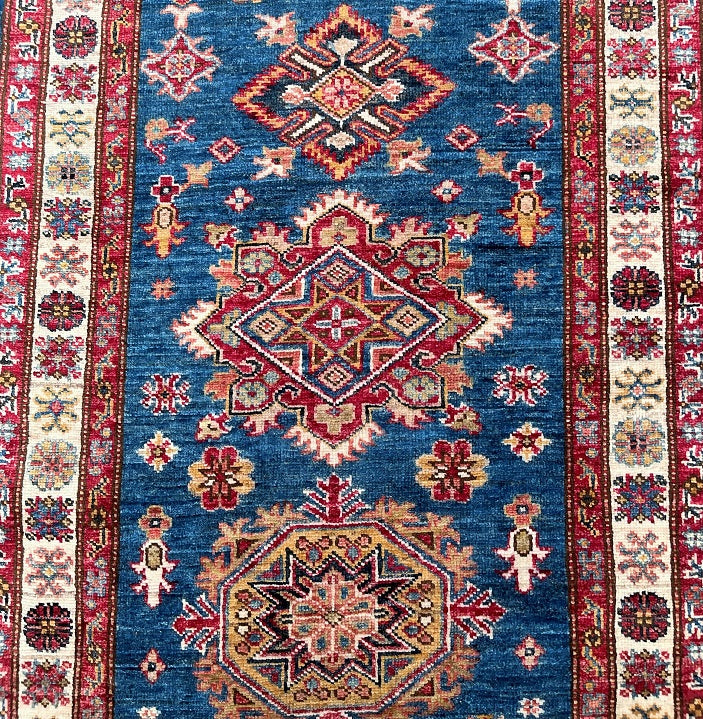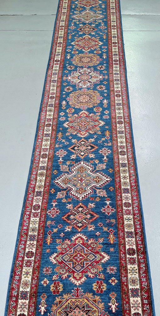 Oversize Genuine Handmade Afghan Super Kazak Hall Runner. Above All It Is Lamb’s Wool Pile On Cotton Base. Blue, Beige, Red, Terracotta Orange And Gold Tone Dyed Using Traditional Methods (Vegetable Dyes). Last Of True Woven Tribal Art.