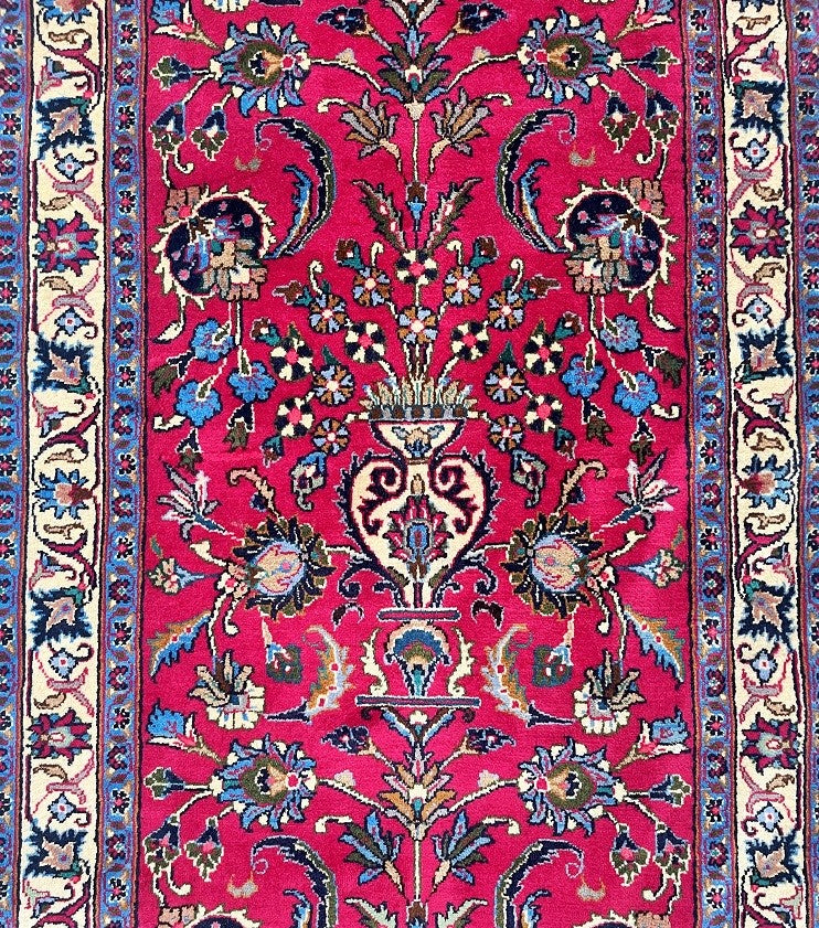 Dense Quality Authentic Handmade Persian Kashmar Hall Runner. Above All It Has A Dense Pure Lamb’s Wool Pile On Cotton Base. It Also Has A Magenta Red/Pink Background Dyed Using Traditional Methods. Hard Wearing Runner Which Would Last You A Life Time.
