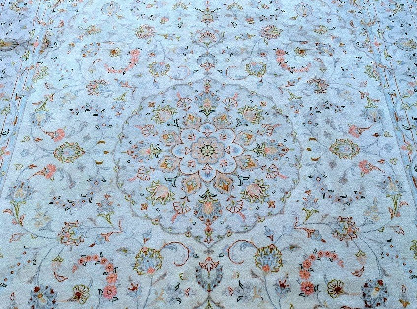 Full room size Genuine handmade Persian Kashan rug. It has a pure wool pile on cotton base. Soft Pastel tones (beige, Gold, Aqua blue, soft orange, green and mustard) tone dyed using traditional methods.