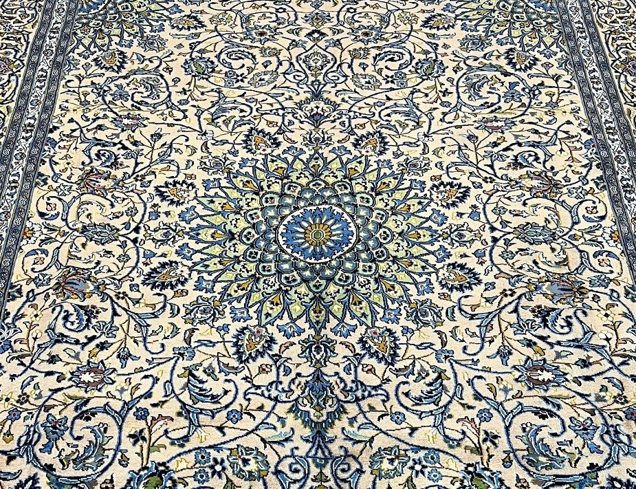 Massive Room Size Authentic Handmade Persian Kashmar Rug. Above All It Would Feel Amazing Under Your Feet. It Is Also Hard To Get This Quality Original Handmade Wool Rug In Larger Sizes. It Has A Pure Lamb’s Wool Pile On Cotton Base. Light Brown, French Blue, Pistachio, Indigo Blue And Olive Green Tone Dyed Using Traditional Methods.