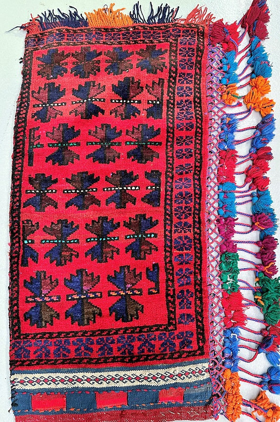 Authentic Handmade Vintage Afghan Mishwani Balouchi Saddle Rug/Pillow Case. Above All It Has The Kilim Backing And Could Be Filled And Used As A Large Cushion, Pillow Or As A Floor Rug. It Also Has A Pure Hand Spun Wool Pile On Wool Base. Red, Brown, Black And Blue Tones Dyed Using Traditional Methods.