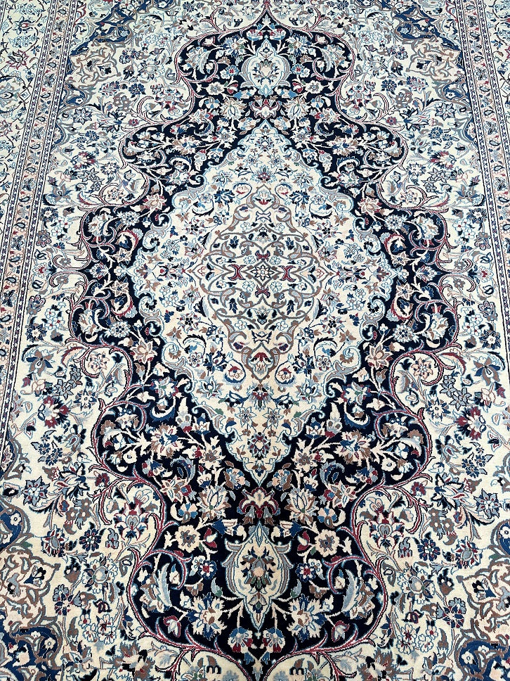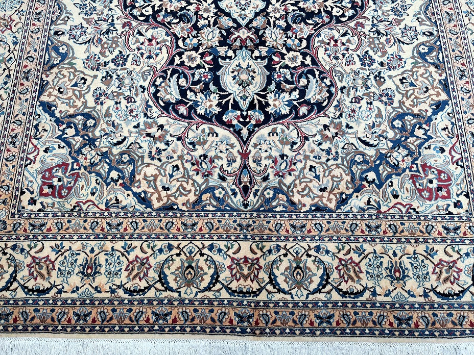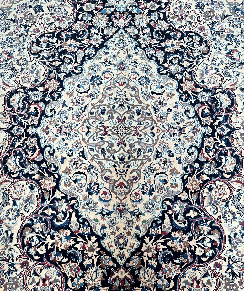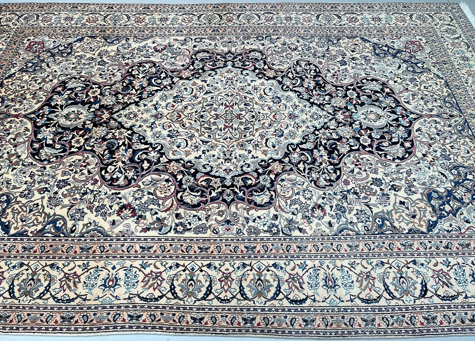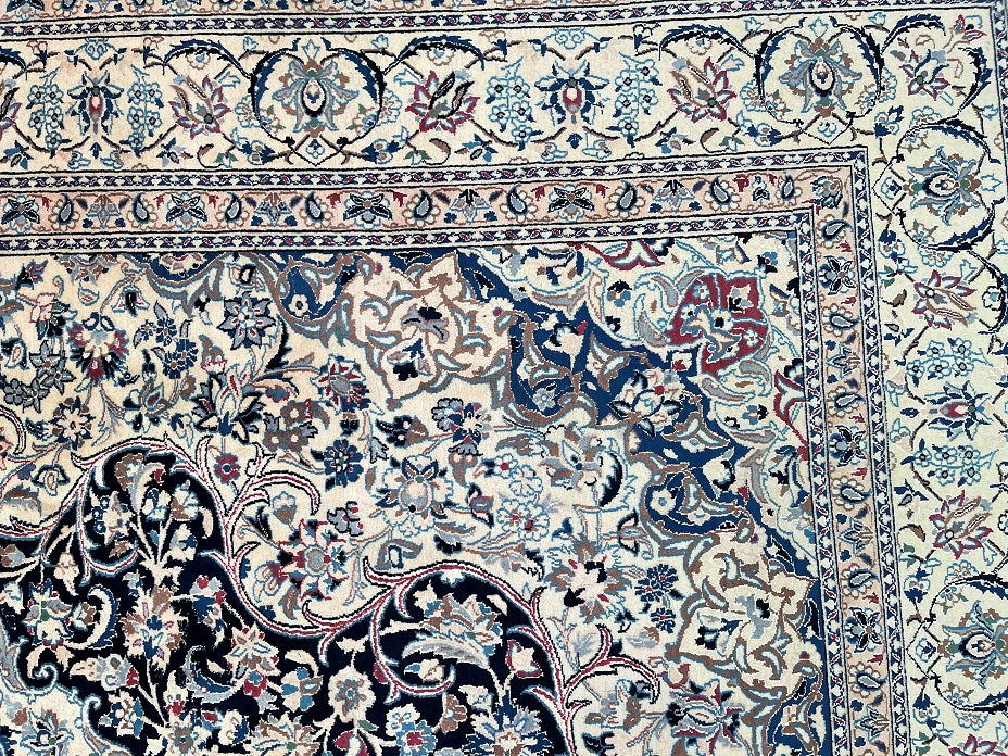 Stunning Large Room Size Authentic Hand Knotted Persian Nain Rug. Above All It Has A Lamb’s Wool with Silk inlaid Pile on Cotton Base. It Also Has A Beige, Cream, Indigo Blue, Maroon And Pink Tones Dyed Using Traditional Methods.