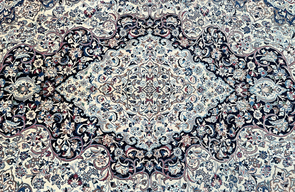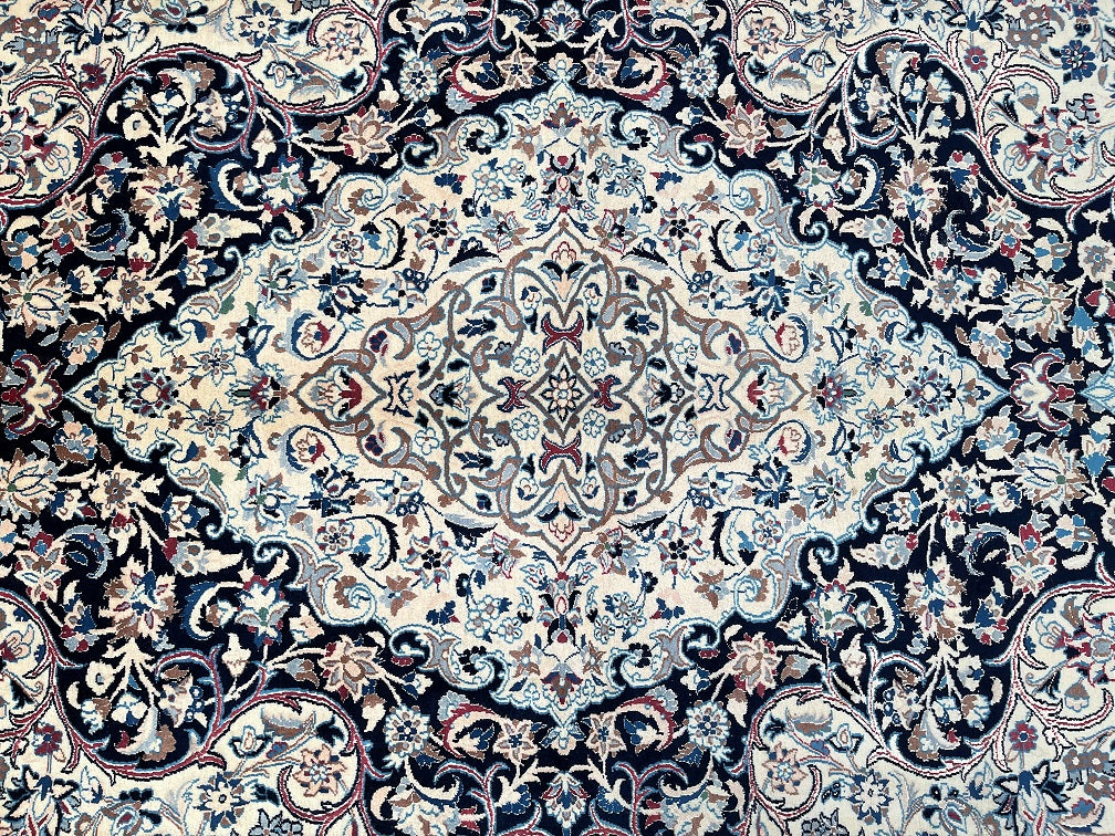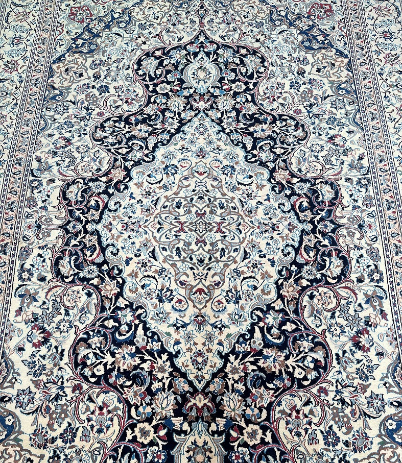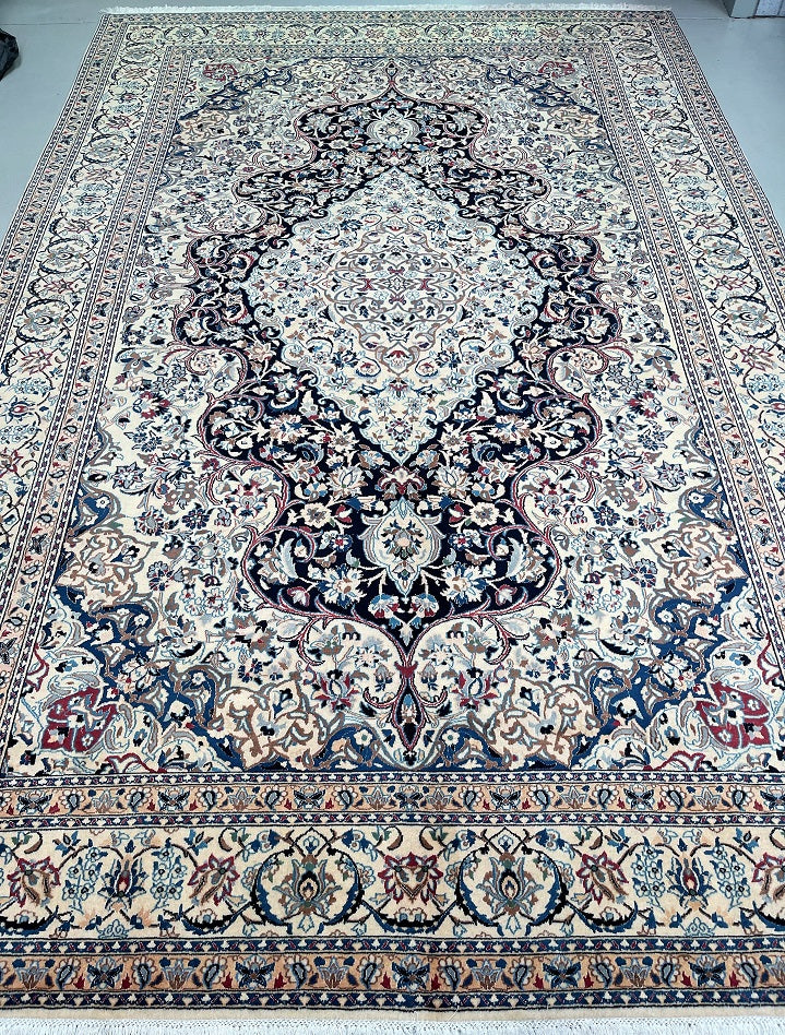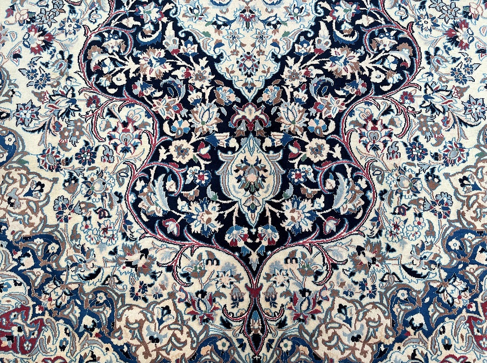 Stunning Large Room Size Authentic Hand Knotted Persian Nain Rug. Above All It Has A Lamb’s Wool with Silk inlaid Pile on Cotton Base. It Also Has A Beige, Cream, Indigo Blue, Maroon And Pink Tones Dyed Using Traditional Methods.