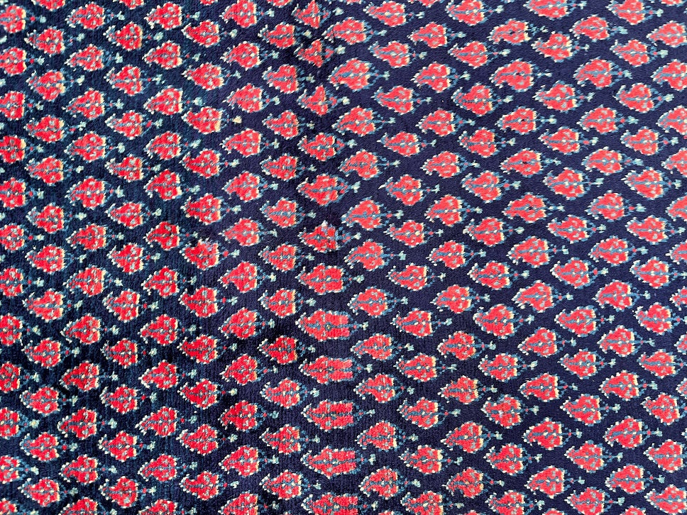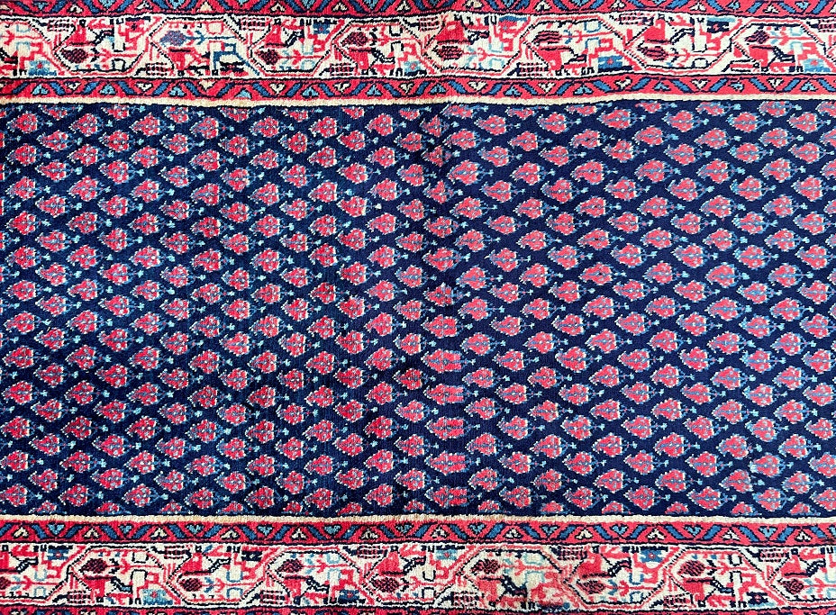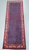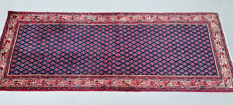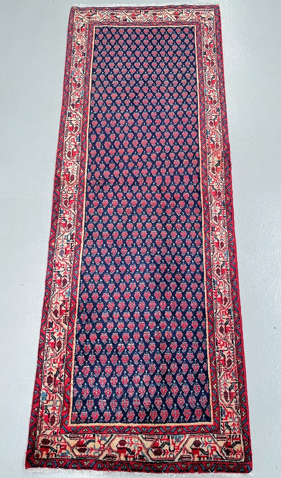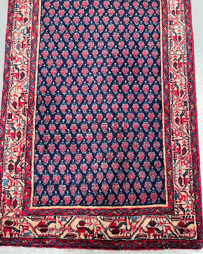 Authentic Handmade Persian Sarough Boteh Mir Short Hall Runner. This gorgeous runner features a wool pile on a cotton base, ensuring both softness and durability. The beautiful colors of navy blue, red, beige, pink and light blue tones have been skillfully dyed using traditional methods, resulting in a harmonious blend of tones. The allover paisley design, also known as the Boteh pattern, adds a touch of sophistication to this piece. It is worth noting that the weaving process for this runner took approximately 2 months, showcasing the dedication and skill of the weaver. Hand-woven in central West Persia, this runner measures 210 x 77 cm, making it a perfect fit for a short hall. With a gallery replacement value of $1799.