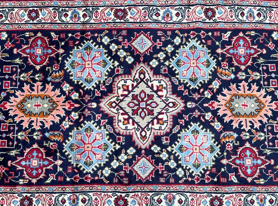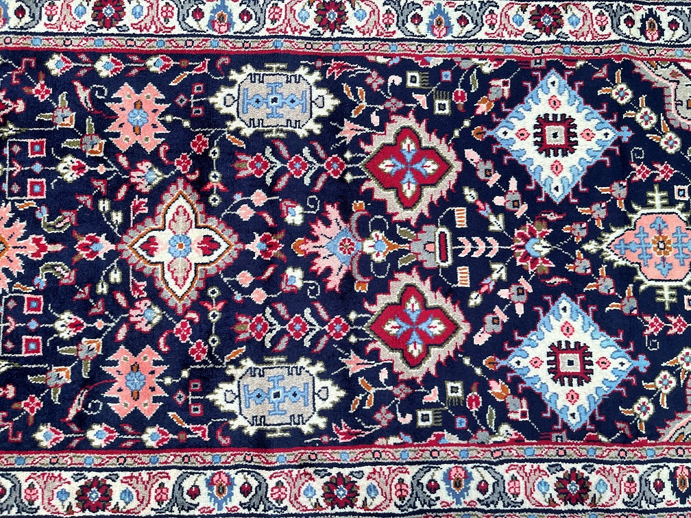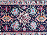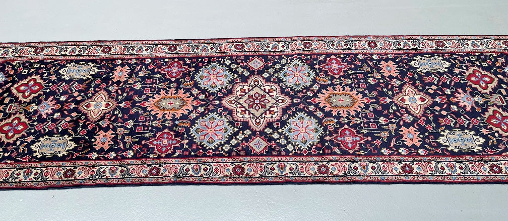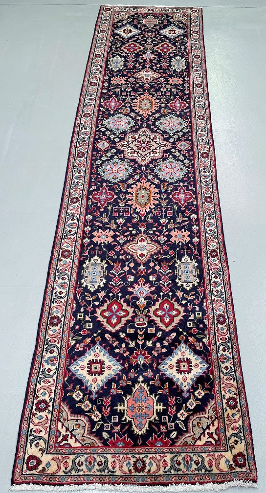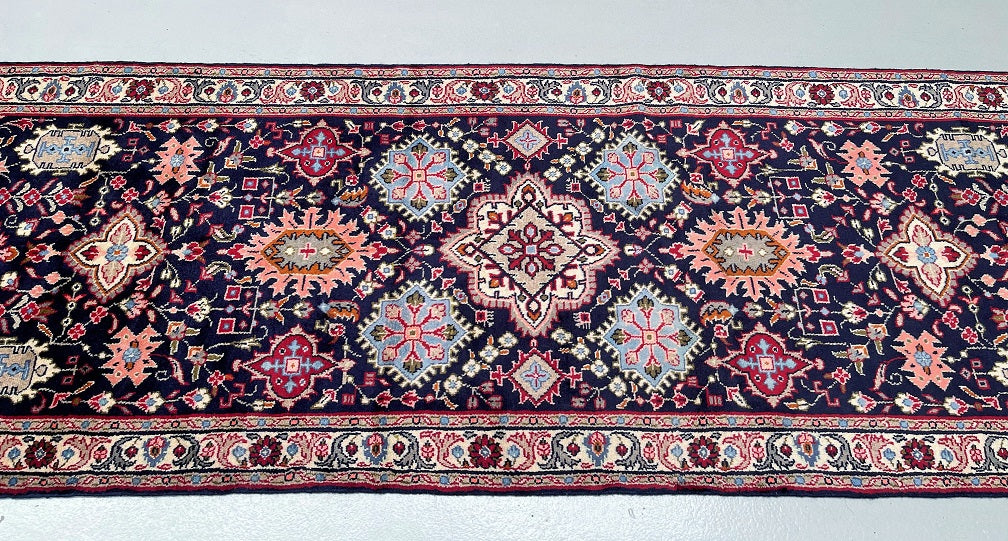 Collectible Authentic Hand Knotted Persian Mehraban Hall Runner. Above It Has A Wool Pile On Cotton Base. Indigo Blue, Green, Beige, Red, Orange, Brown, Light Blue And Pink Tones Dyed Using Traditional Methods.