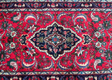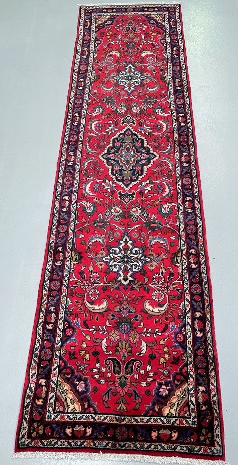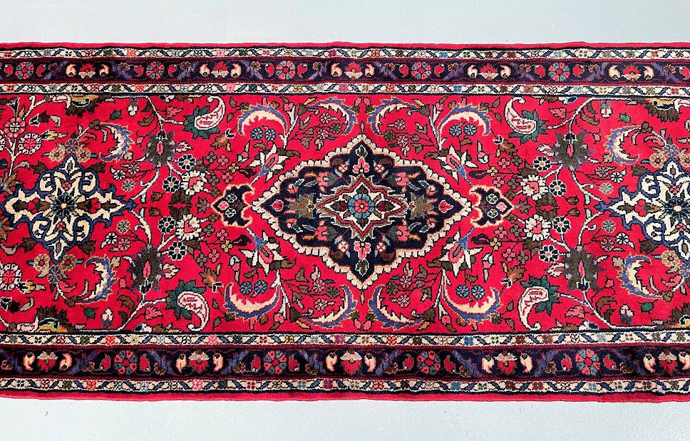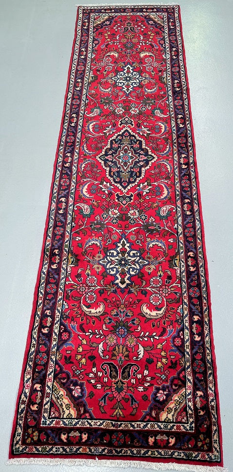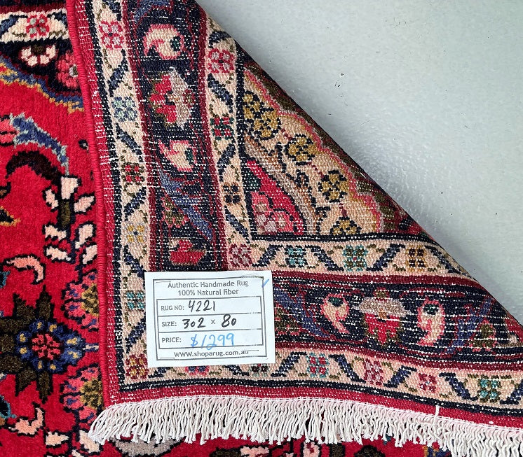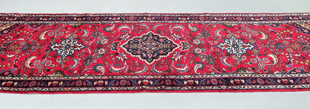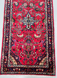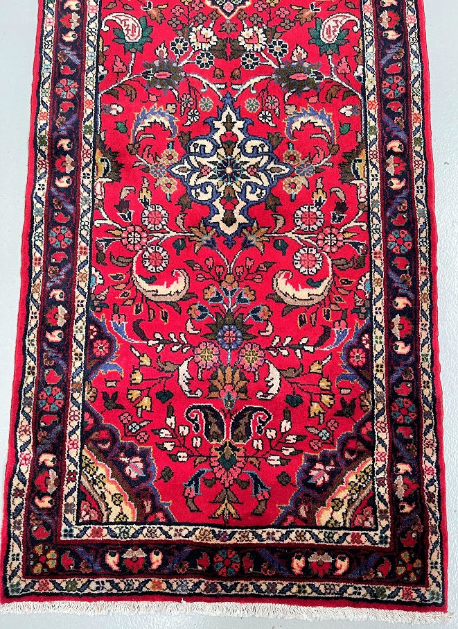 Rare Authentic Hand Knotted Persian Mehraban Hall Runner. Above All It Has A Pure Wool Pile On Cotton Base. Red, Indigo Blue/Black, Pink, Beige, Green, Gold, Blue And Brown Tones Dyed Using Traditional Methods.