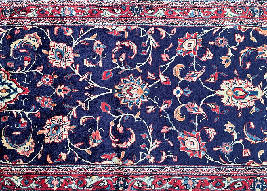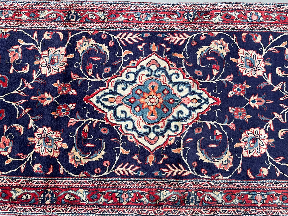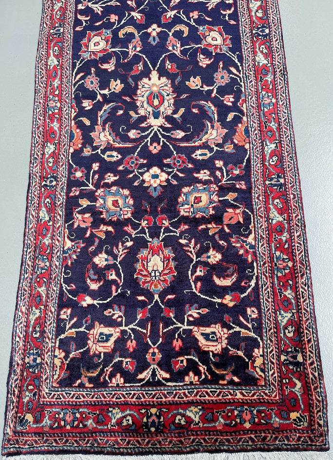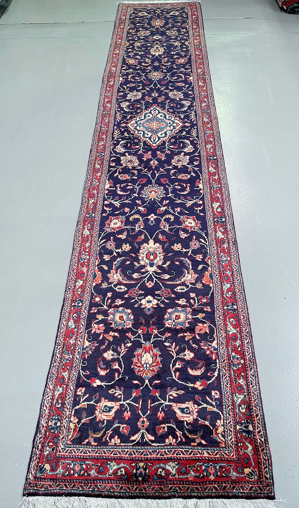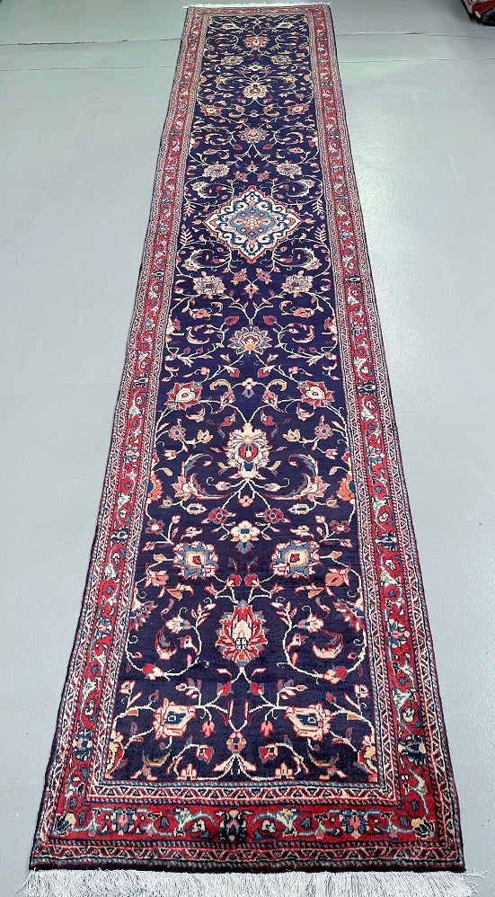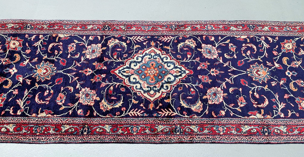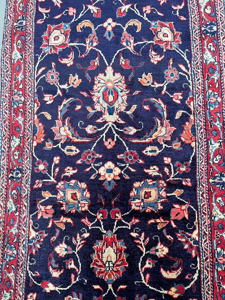 Extra Long Authentic Persian Sarough Hall Runner. Above All It Is Hard To Get This Quality Handmade Runners Over 3m Long. It Also Pure Wool Pile On Cotton Base. It Has An Indigo Blue, Beige, Red And Peach Tones Which Was Dyed Using Traditional Methods.