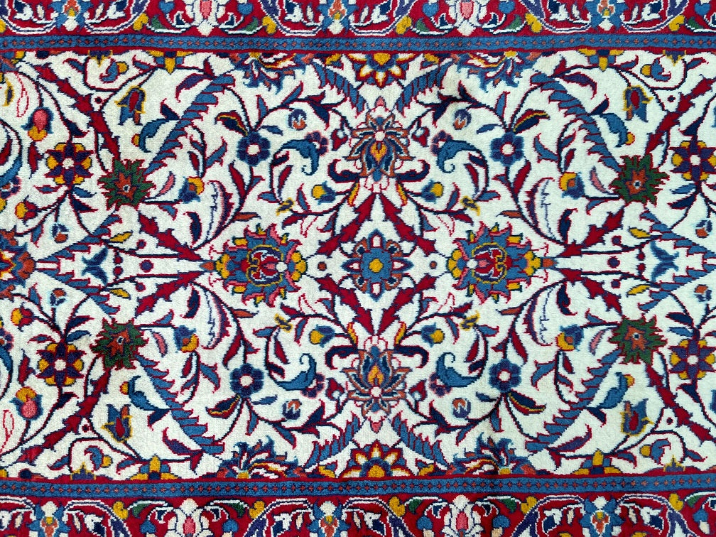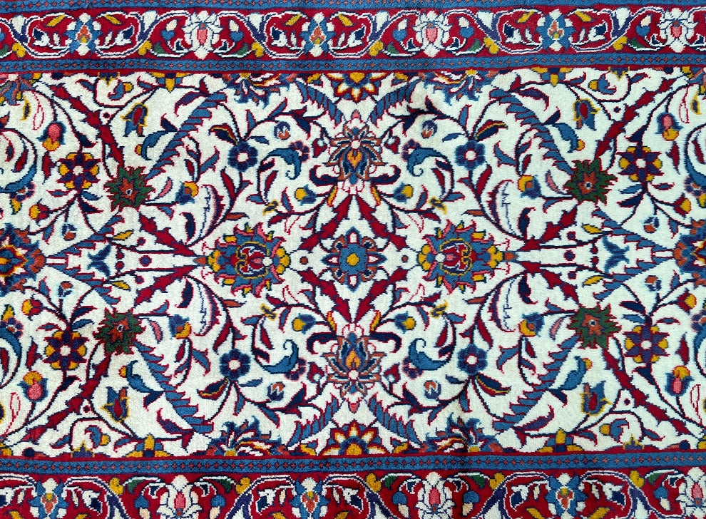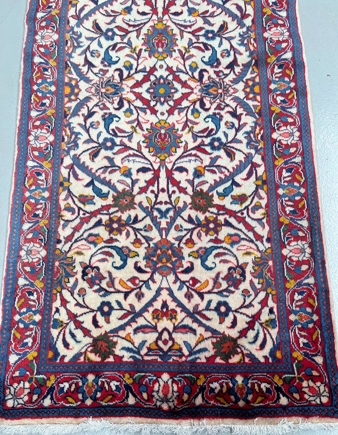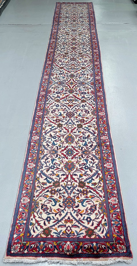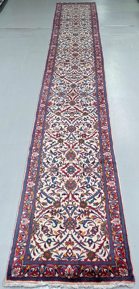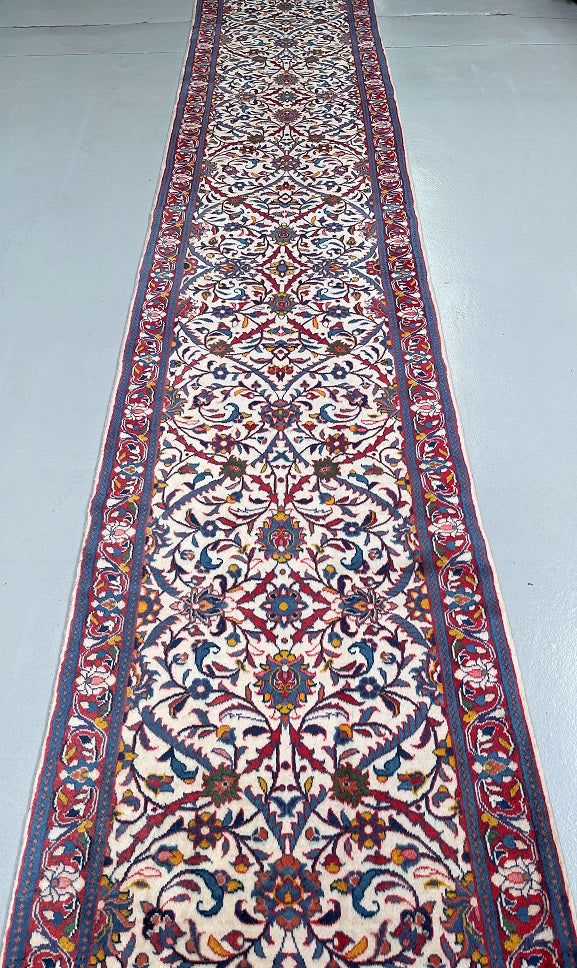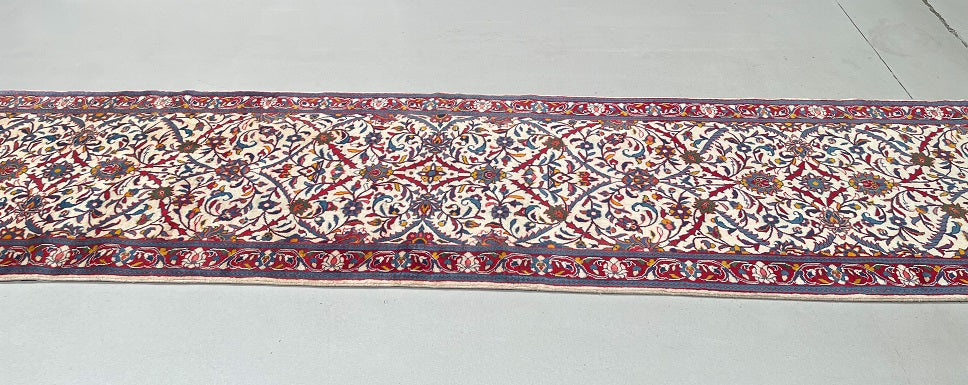 Oversize Authentic Handmade Persian Sarough Hall Runner. Above All It Is Hard To Get Quality Handmade Hall Runners Over 4m Long. It Also Has A Lamb’s Wool Pile On Cotton Base. Beige, Blue, Pink, Orange And Green Tones Dyed Using Traditional Methods.