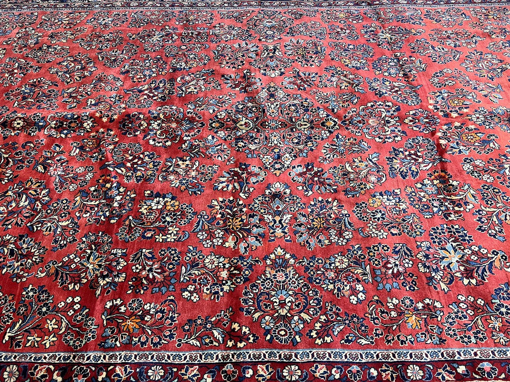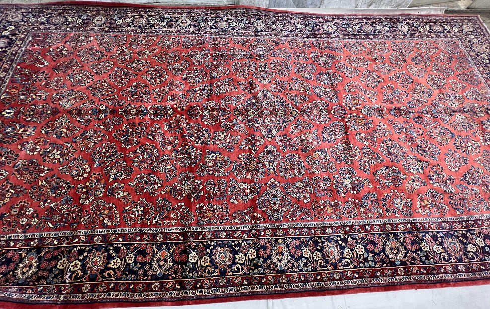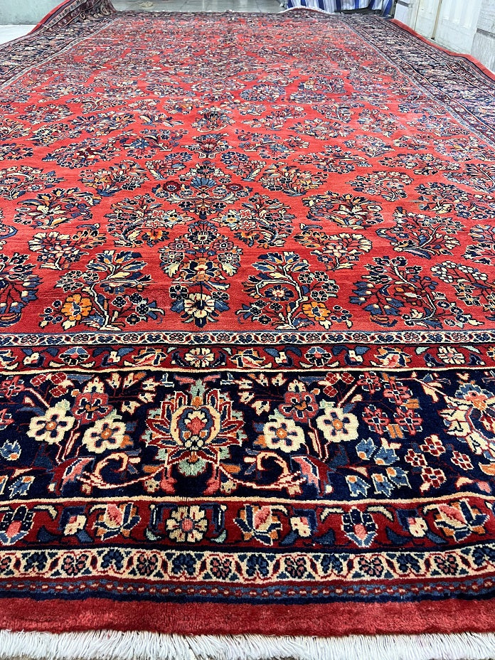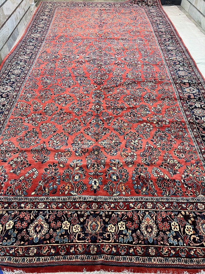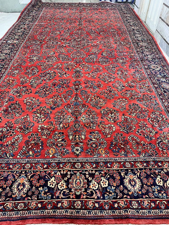 Rare Massive Room Size Genuine Handmade Antique Persian Sultanabad Sarough Rug, woven circa 1950 in excellent condition. This exceptional rug features a hand-spun wool pile on a cotton base, ensuring its authenticity and longevity. The terracotta red, black, beige, blue, gold, and orange tones are achieved through traditional methods using organic dyes, adding a touch of natural beauty to its colors. With a unique floral design adorned with vae motifs, this rug is a true gem that would enhance any rug collection and add depth to any space. It is worth noting that two weavers dedicated approximately 12 to 18 months to complete this intricate piece. Hand-woven in the Sultanabad region of Central Persia, this rug measures an impressive 525 x 225 cm and holds a gallery replacement value of $29500.
