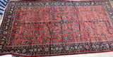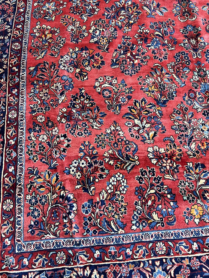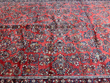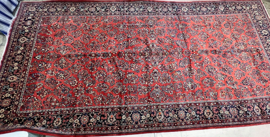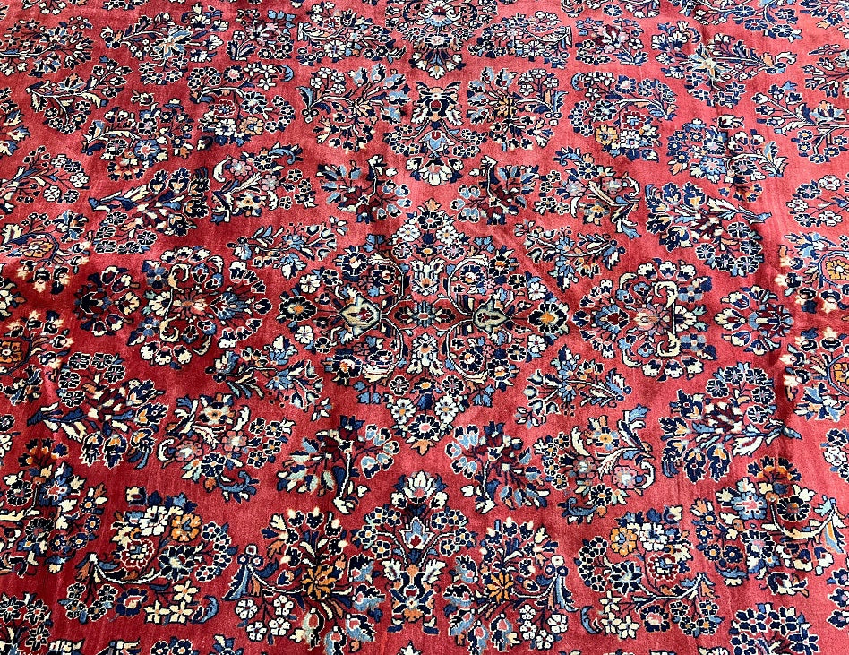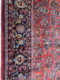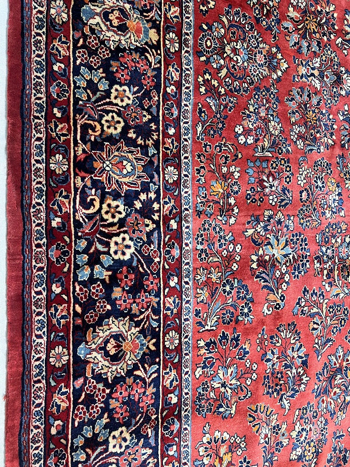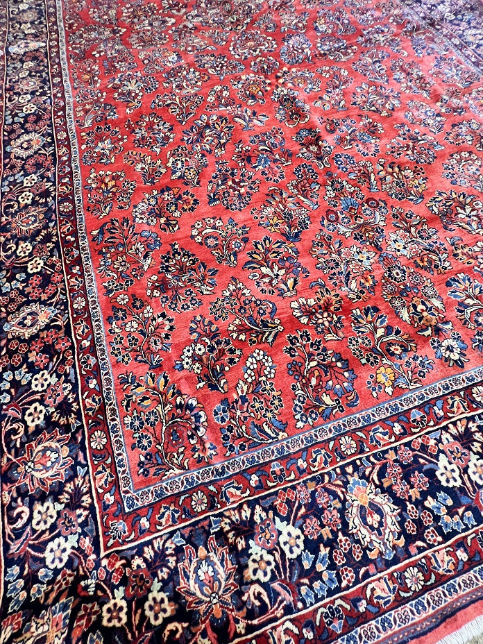 Rare Massive Room Size Genuine Handmade Antique Persian Sultanabad Sarough Rug, woven circa 1950 in excellent condition. This exceptional rug features a hand-spun wool pile on a cotton base, ensuring its authenticity and longevity. The terracotta red, black, beige, blue, gold, and orange tones are achieved through traditional methods using organic dyes, adding a touch of natural beauty to its colors. With a unique floral design adorned with vae motifs, this rug is a true gem that would enhance any rug collection and add depth to any space. It is worth noting that two weavers dedicated approximately 12 to 18 months to complete this intricate piece. Hand-woven in the Sultanabad region of Central Persia, this rug measures an impressive 525 x 225 cm and holds a gallery replacement value of $29500.