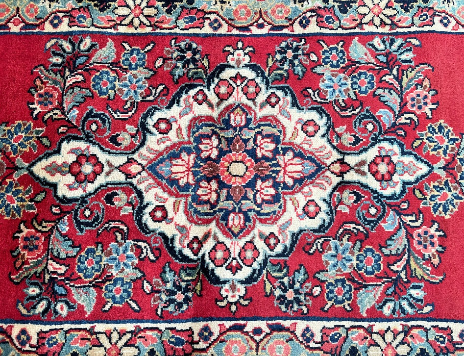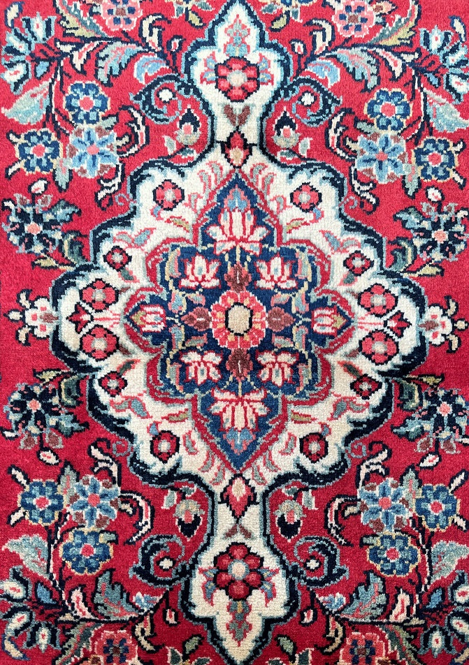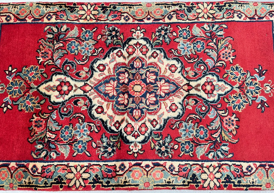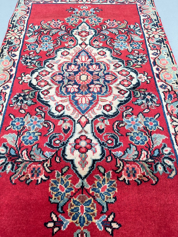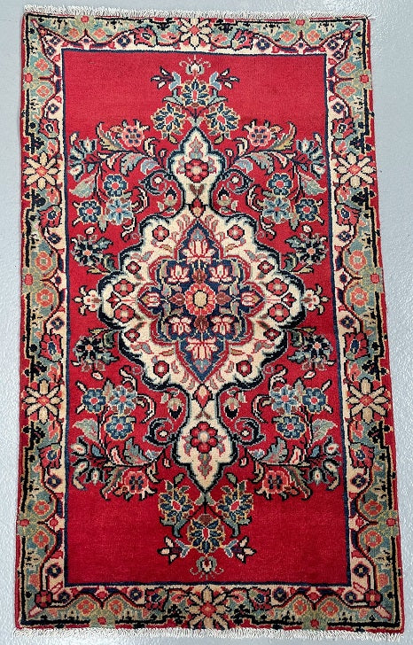 Fine Door Mat Size Authentic Handmade Persian Sarough Rug Which Could Also Be Used As A Short Runner. It Also Has A Pure Lamb’s Wool Pile on Cotton Base. Red, Beige, Indigo Blue, Gold, Pink And Green Tones Dyed Using Traditional Methods.