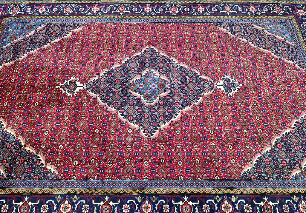 Full Room Size Handmade Fish Design Persian Ardebil Rug. Above All It Is A Heavy Quality Rug. Pure Lamb’s Wool Pile On Cotton Base. It Also Has A Brown/Terracotta Tone Dyed Using Traditional Methods. Fine Quality from Famous City Of Ardebil.