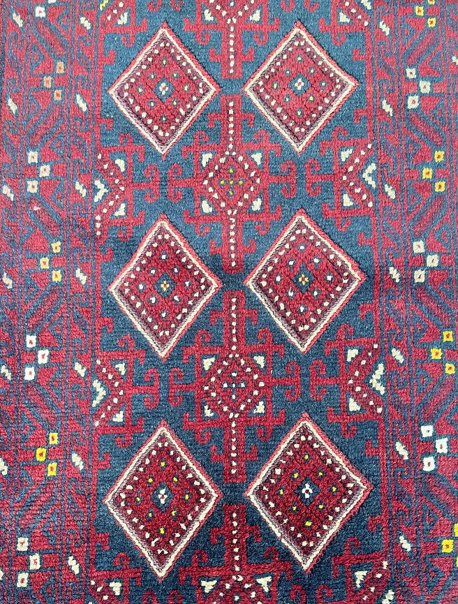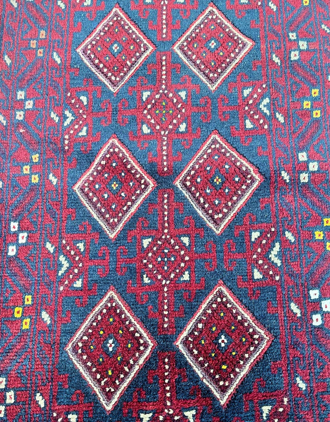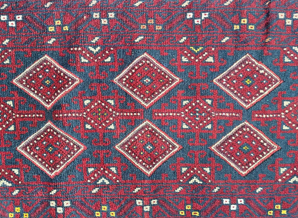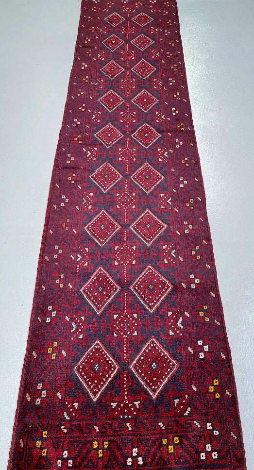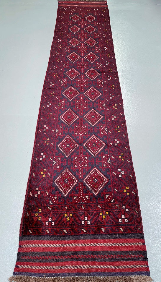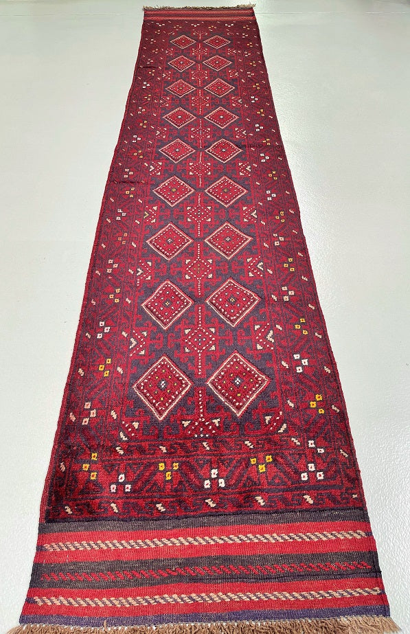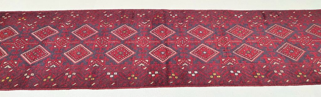 Hand Woven Afghan Mishwani Balouchi Hall Runner. Above All Three Weaving Technique Used To Make This Runner. It also Has A Pure Hand Spun Wool Pile On Wool Base. Red, Beige And Blue Tone Dyed Using Traditional Methods.