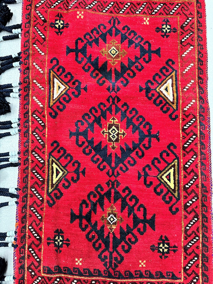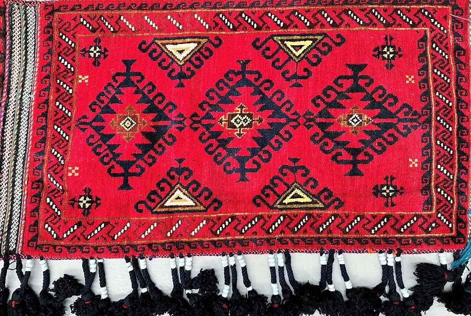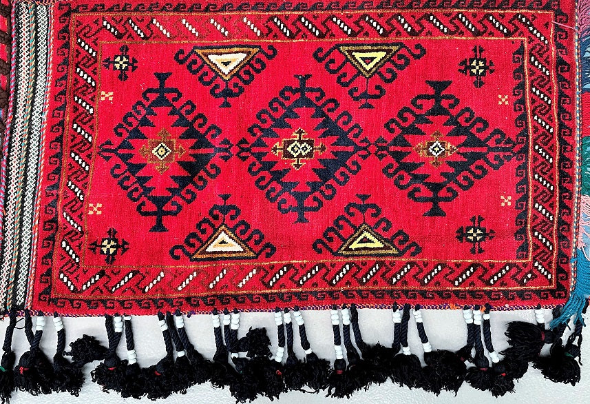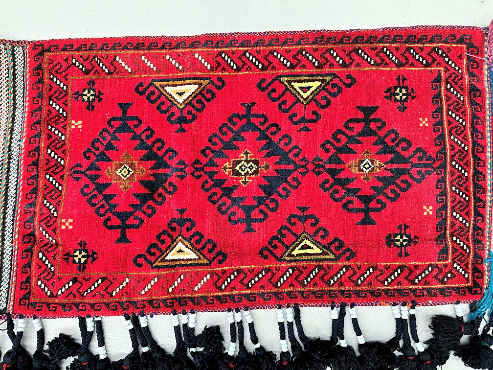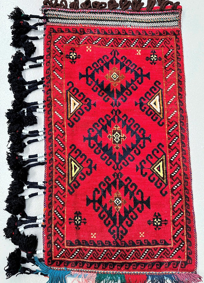 Authentic Handmade Afghan Mishwani Balouchi Saddle Rug/Pillow Case. Above All It Has The Kilim Backing And Could Be Filled And Used As A Large Cushion, Pillow Or As A Floor Rug. It Also Has A Pure Hand Spun Wool Pile On Wool Base. Red Tones Dyed Using Traditional Methods.