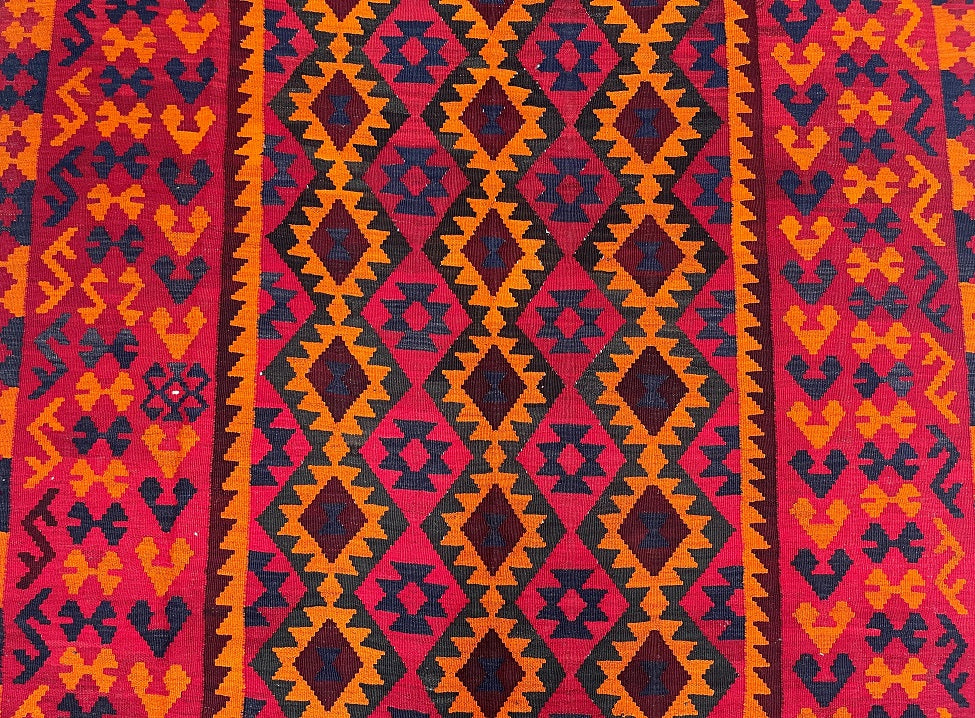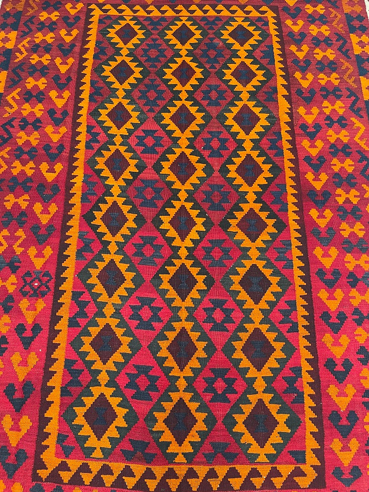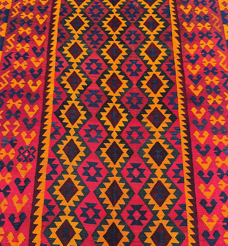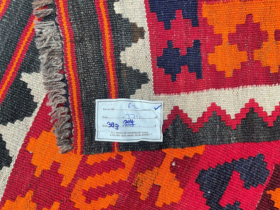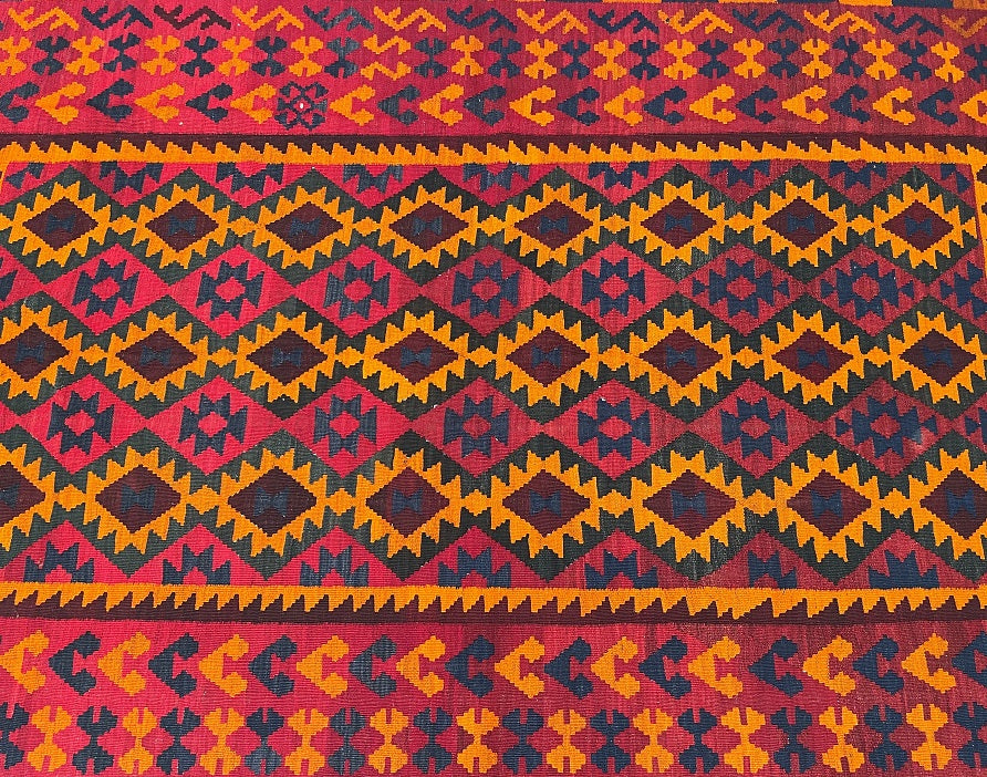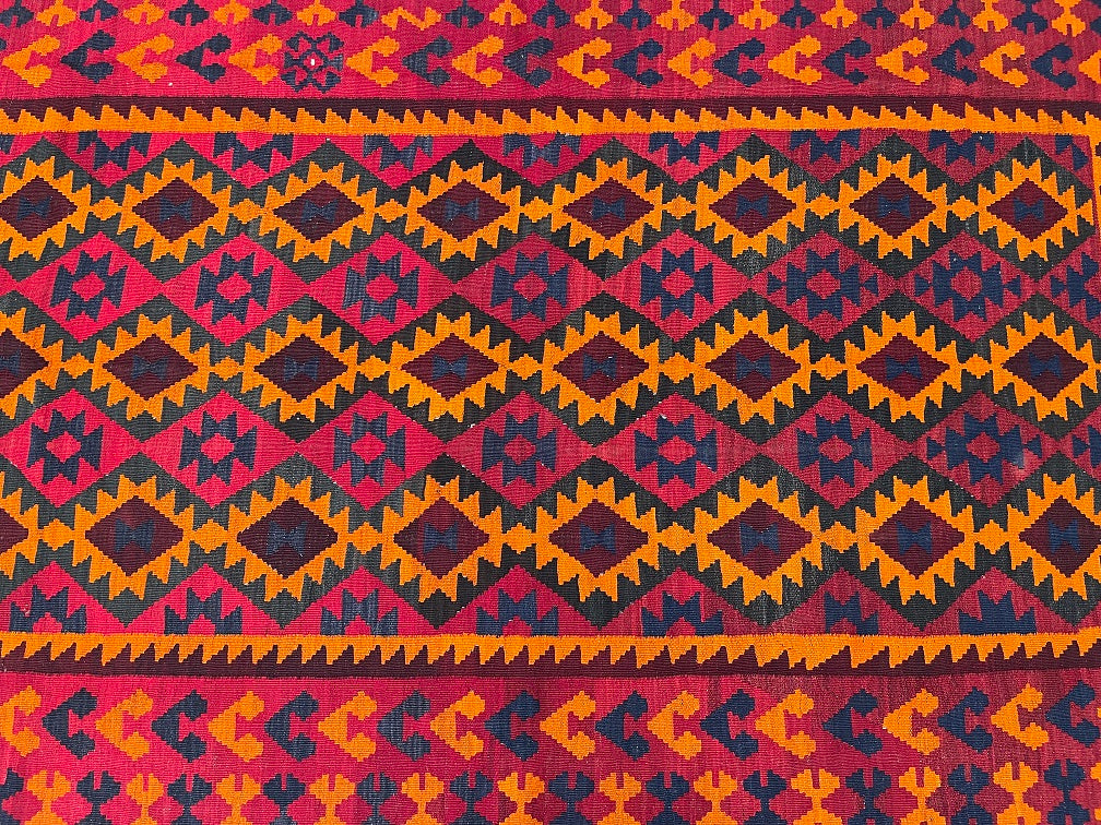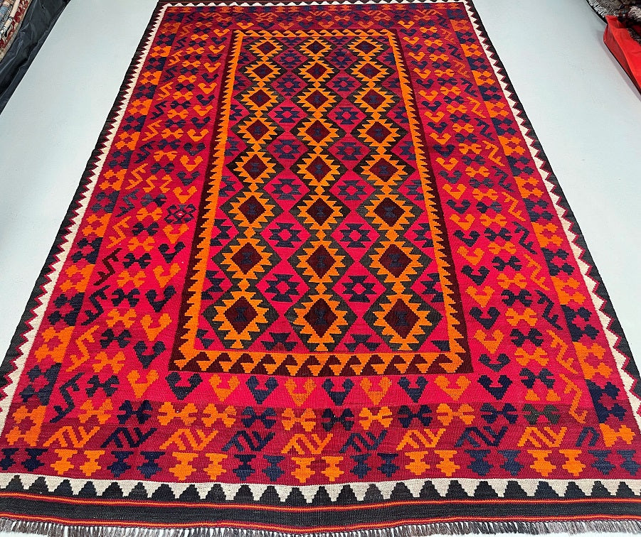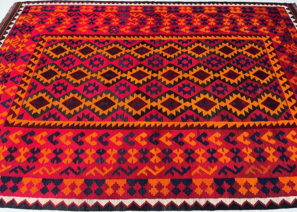 Full Room Size Authentic Hand Woven Afghan Meymaneh Kilim Rug. Above All It Has A Pure Wool Pile On Wool Base. Maroon Red, Orange, Blue, Green, White and Black Tone Dyed Using Traditional Methods.