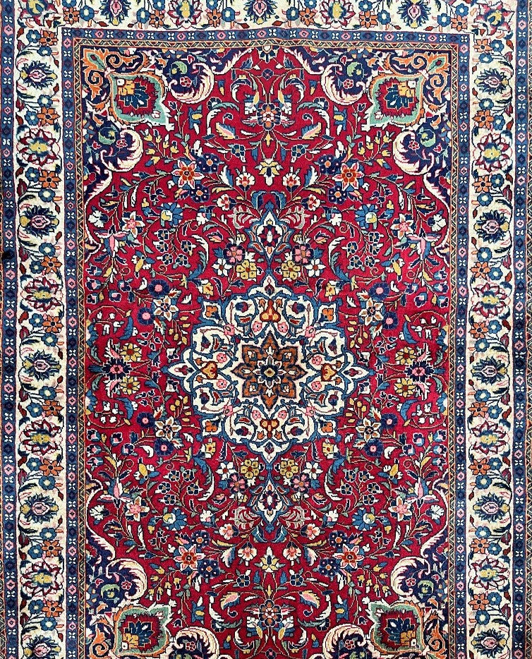 Fine Authentic Handmade Antique Persian Ghiasabad Rug. Above All It Has a Pure Lamb’s Wool Pile On Cotton Base. Red, Beige, Blue, Orange, Yellow And Pink Tone Dyed Using Traditional Methods.
