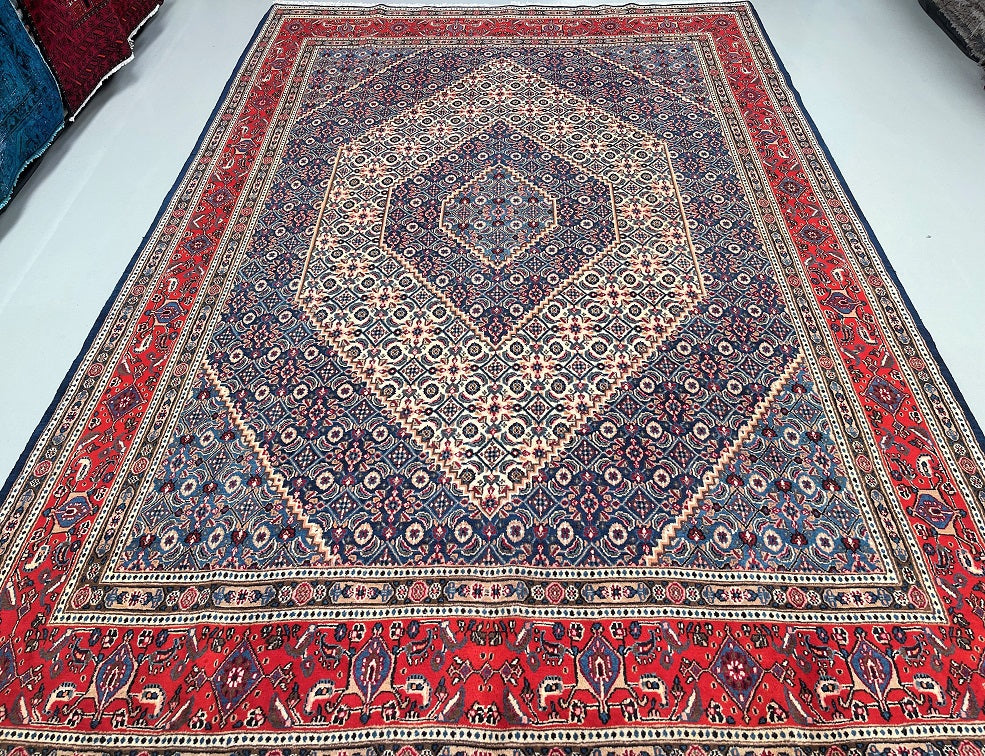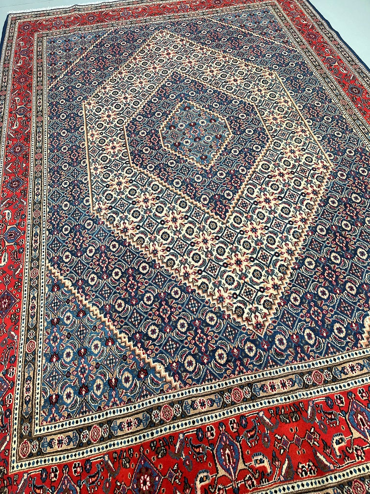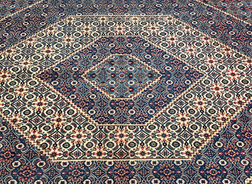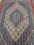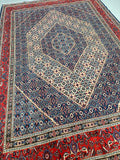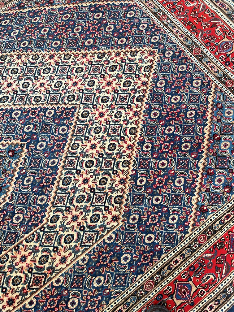 Large Room Size Authentic Handmade Vintage Persian Birjand Rug. Above All It Is Hard To Find Pattern In Original Handmade Rugs. It Also Has A Pure Lamb’s Wool Pile On Fine Cotton. Beige, Caramel, Blue And Red Tone Dyed Using Traditional Methods.