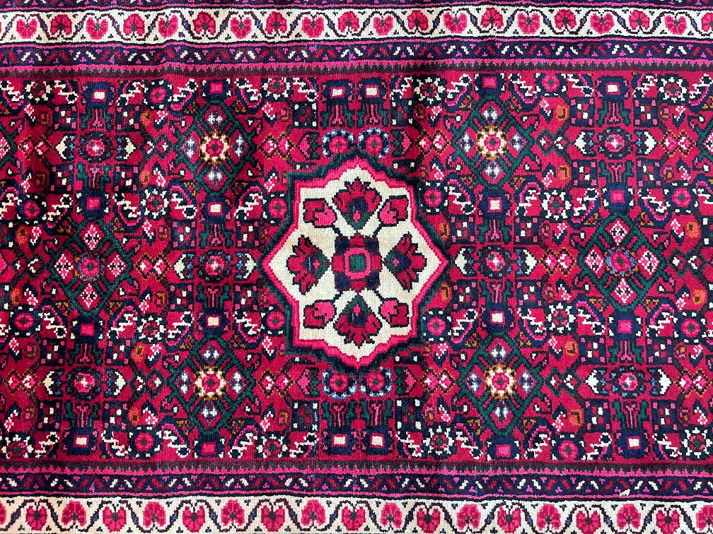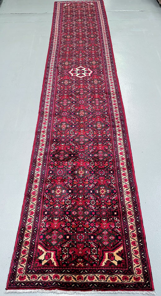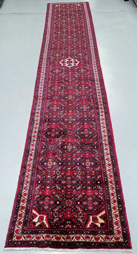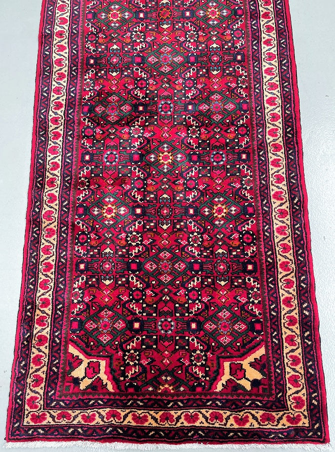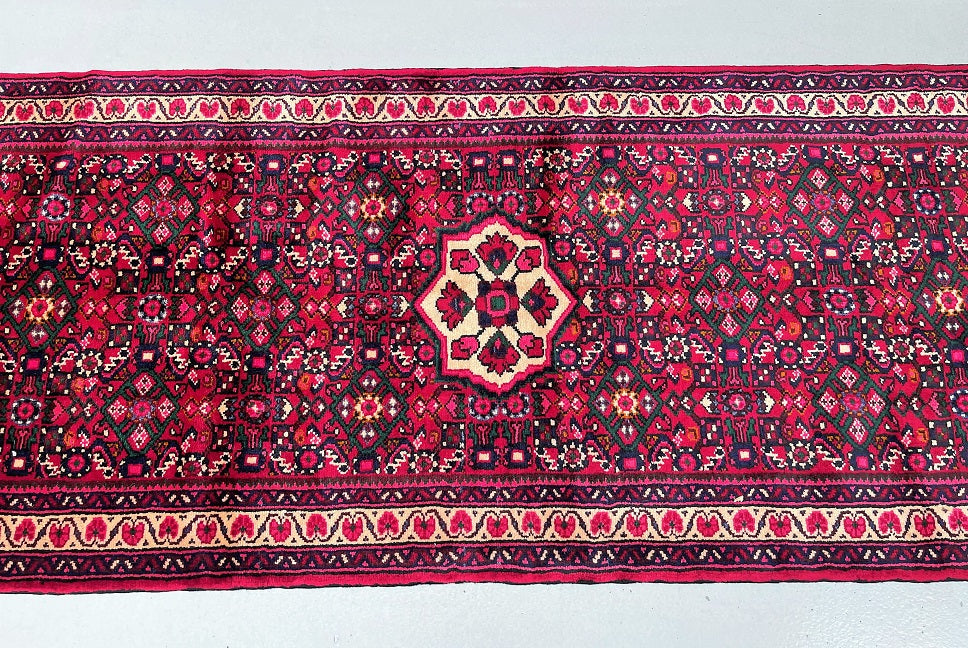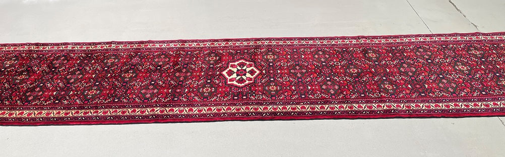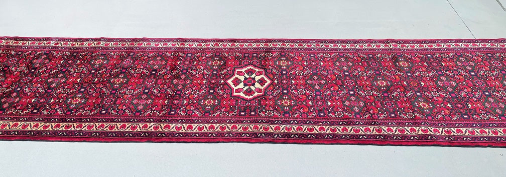 Extra Long Authentic Handmade Persian Enjelas Hall Runner. Above All It Is A Hard Wearing Runner. It Also Has Pure Hand Spun Wool Pile On Cotton Base. Red, Beige, Pink, Blue, Green And Orange Tone Dyed Using Traditional Methods.