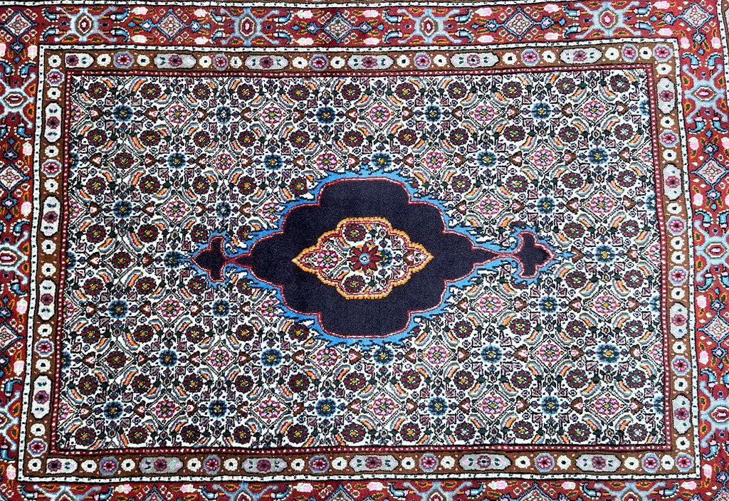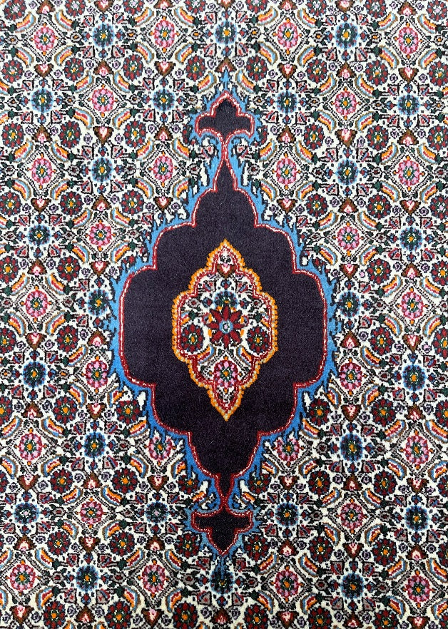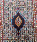 Fine Authentic Handmade Persian Birjand Rug. Above All It Has A Lamb’s Wool With Touch Of Silk Pile on Cotton. It Also Has A Beige, Indigo Blue, Terracotta Red, Orange, Light Blue And Pink Tones Dyed Using Traditional Methods.