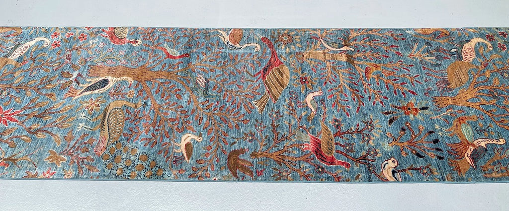Gorgeous Handmade Afghan Chobi Hall Runner. Above All It Has A Pure Wool Pile On Cotton Base. Soft Sky Blue, Warm Gold, Ivory, Rust Red, Terracotta, Chocolate Brown And Subtle Sage Green Tones.