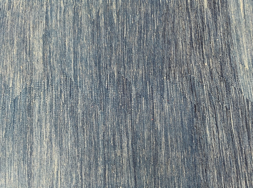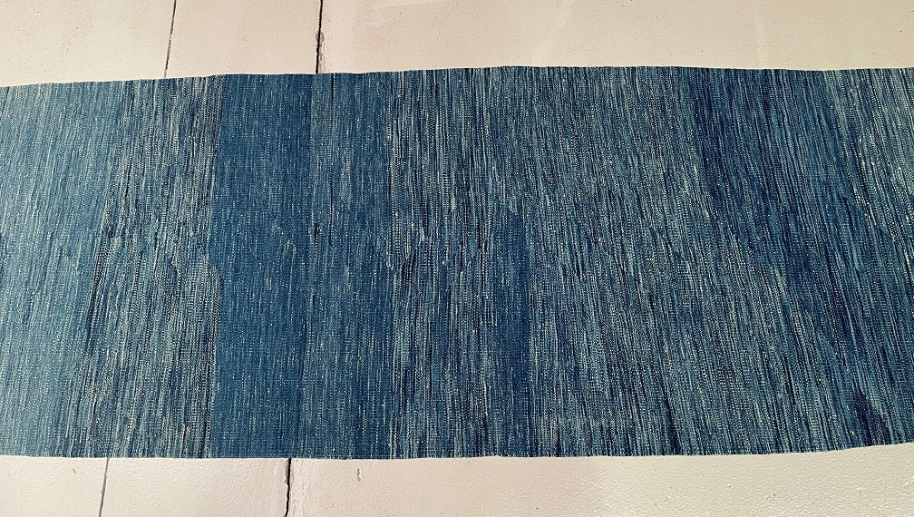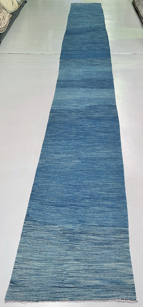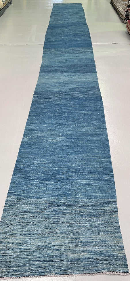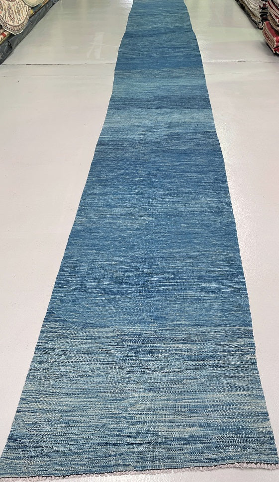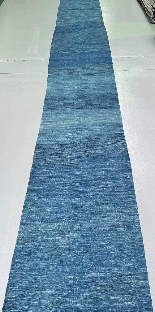 Oversize Contemporary Hand Woven Afghan Waziri Kilim Hall Runner. Please Note The Width Is Slightly Wider In Few Areas As It Is Tribal Handmade Runner. Denim Blue Tones Blended With Slate Blue And Subtle Ivory Wool Highlights Throughout The Weave. It Has A Wool Pile On Wool Base. Tones Dyed Using Traditional Methods.