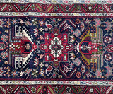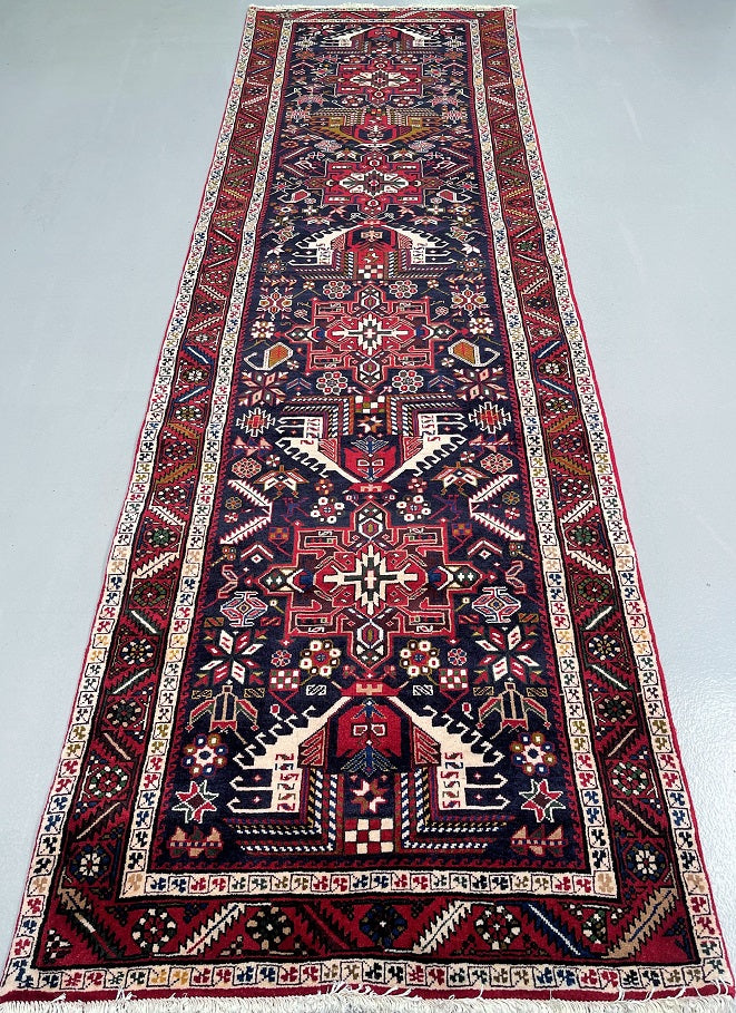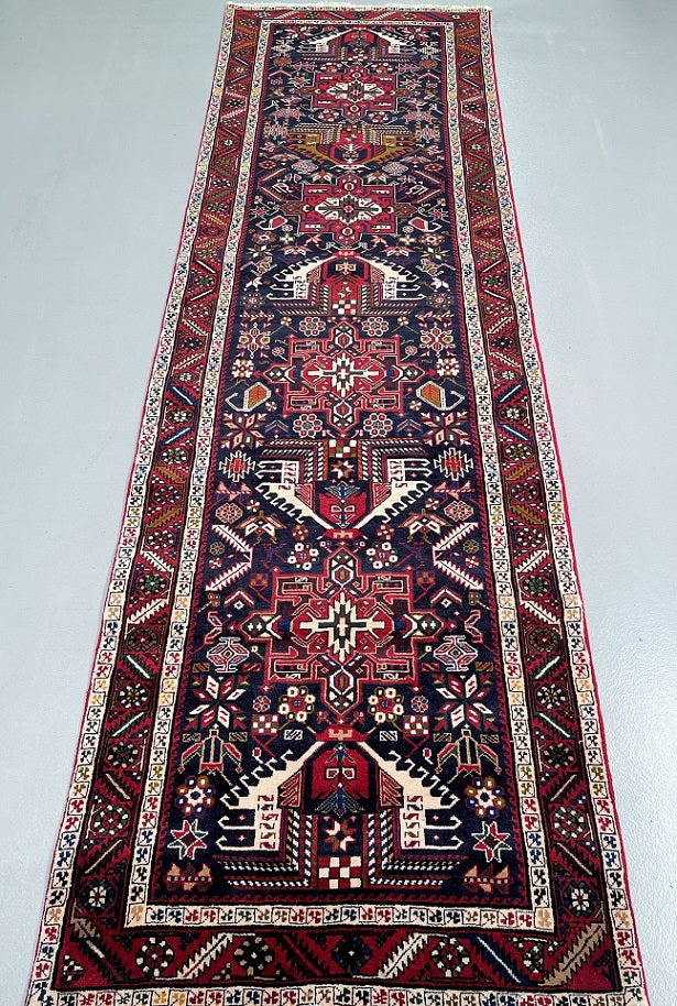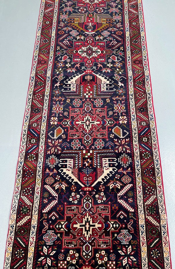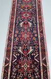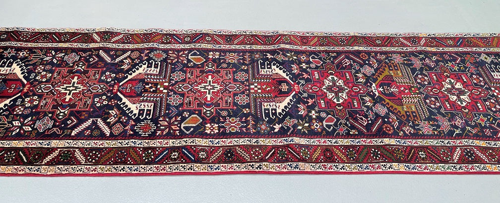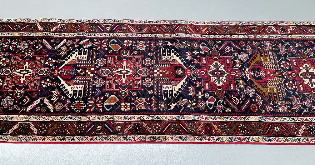 Dense Quality Authentic Handmade Persian Heriz Hall Runner. Above All It Has A Pure Hand Spun Wool Pile On Cotton Base. Indigo Blue, Beige, Red, Green, Mustard Green, Pink, Orange And Brown Tones Dyed Using Traditional Methods.