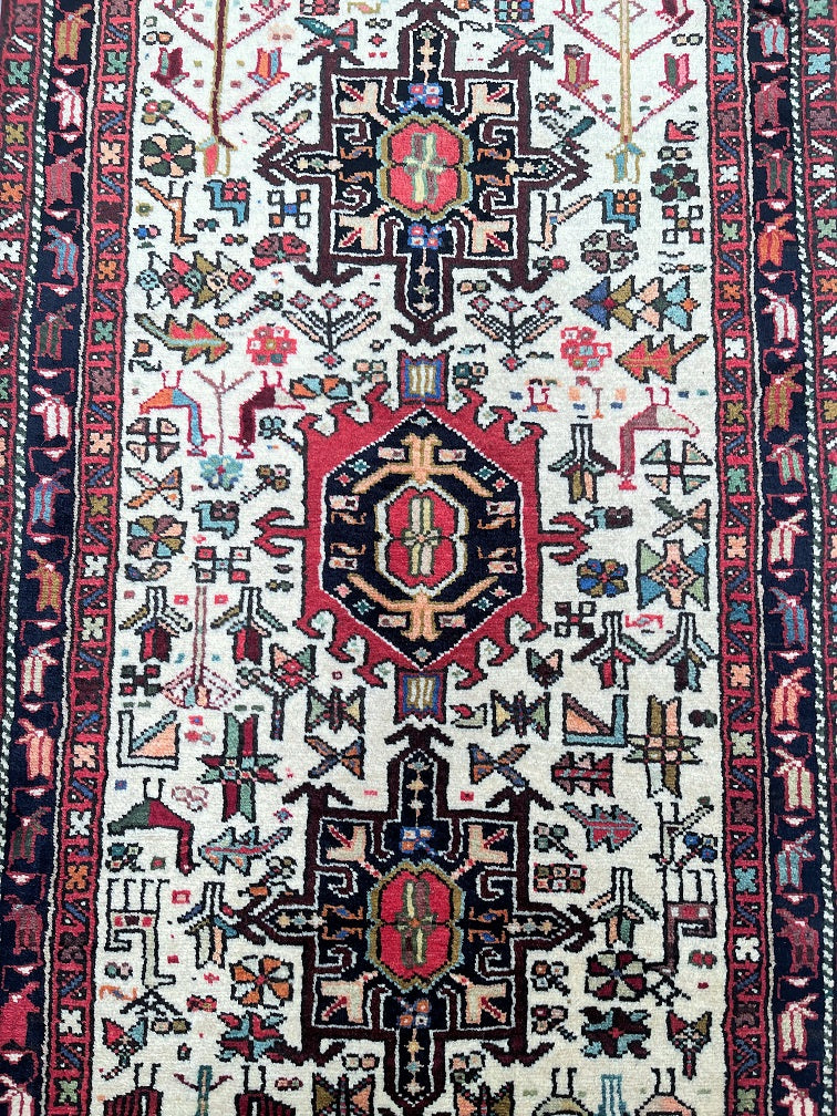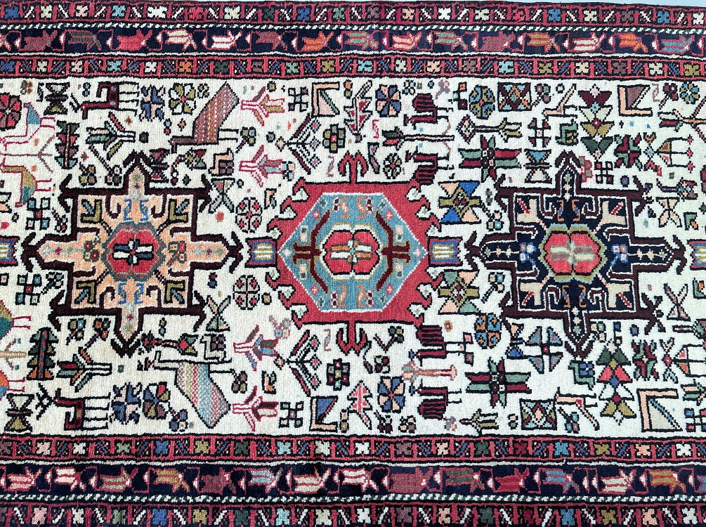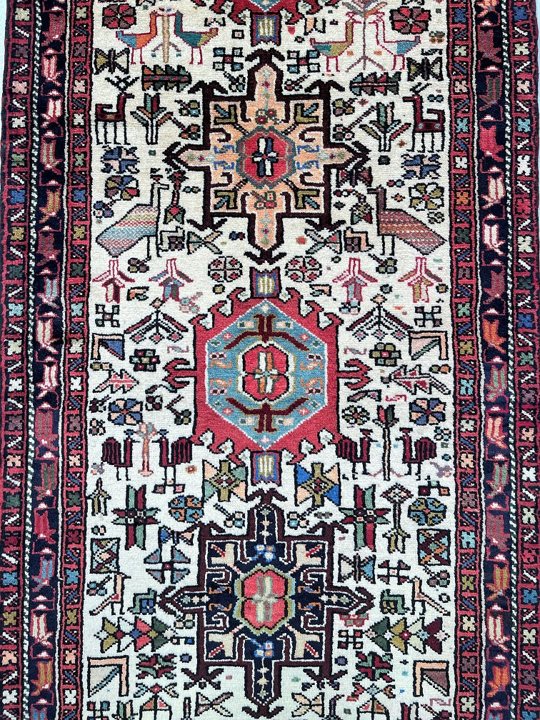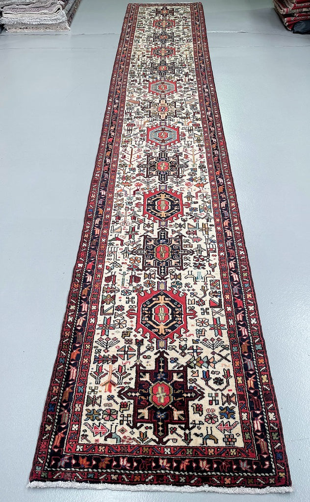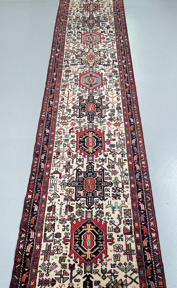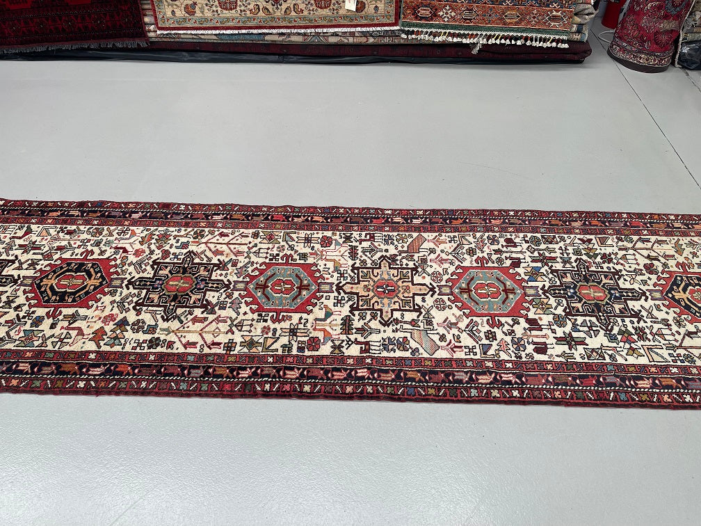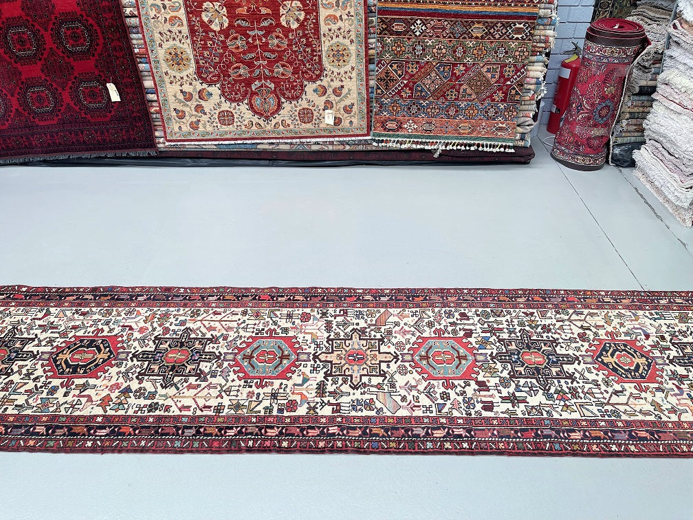 Oversize Authentic Handmade Persian Qarajeh Hall Runner. Above All It Is Hard To Find Runners Over 4m Long. It Has A Pure Hand Spun Wool Pile On Cotton Base. Beige Background Dyed Using Traditional Methods.