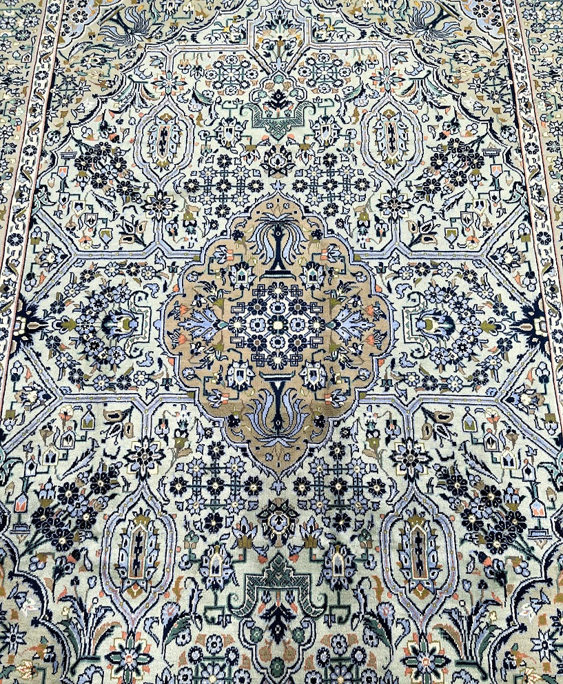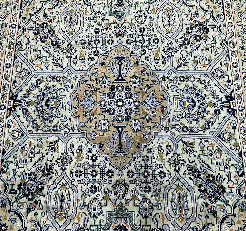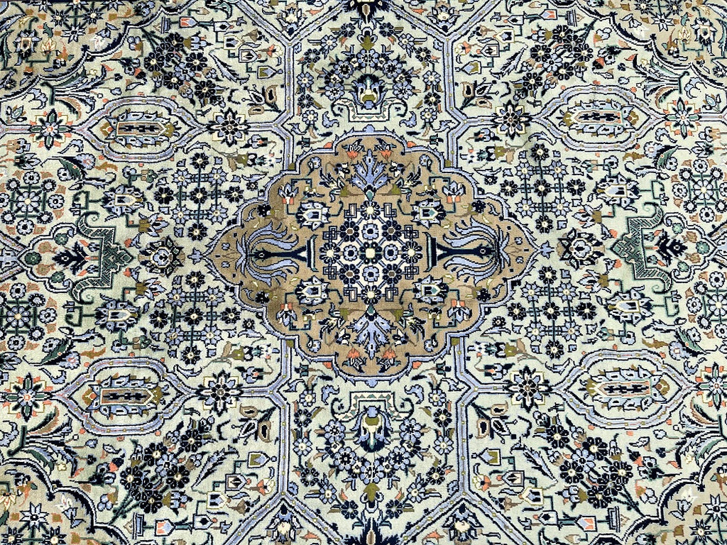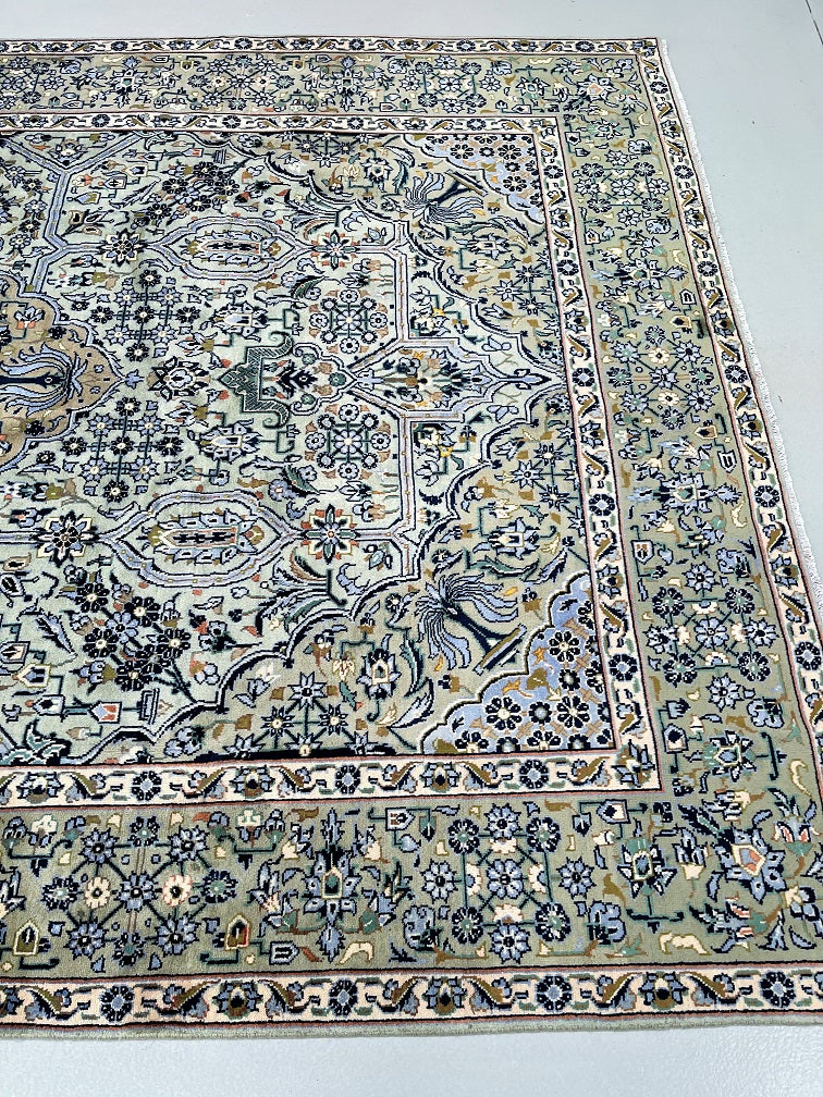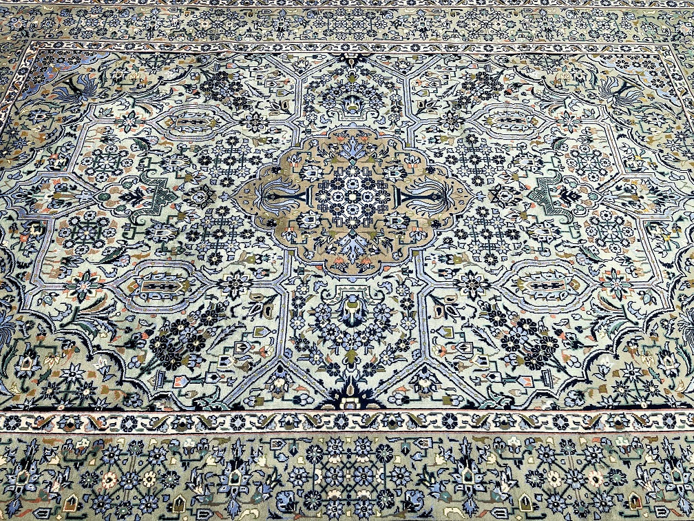 Rare Full Room Size Authentic Handmade Vintage Persian Najafabad Rug. It Has A Pure Lamb’s Wool Pile On Cotton Base. Pistachio, Blue, Orange And Beige Tone Dyed Using Traditional Methods.