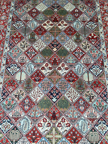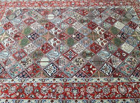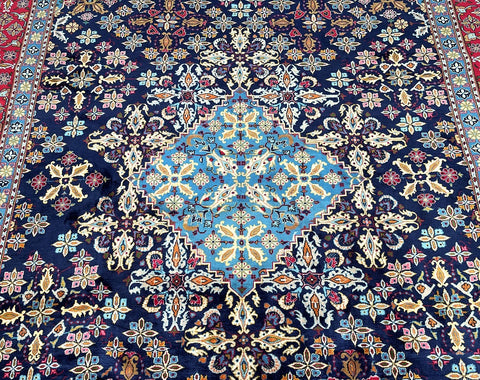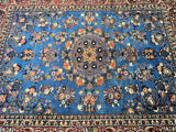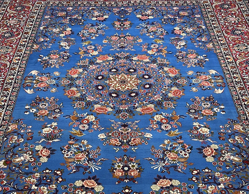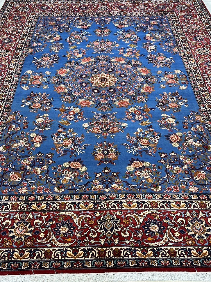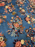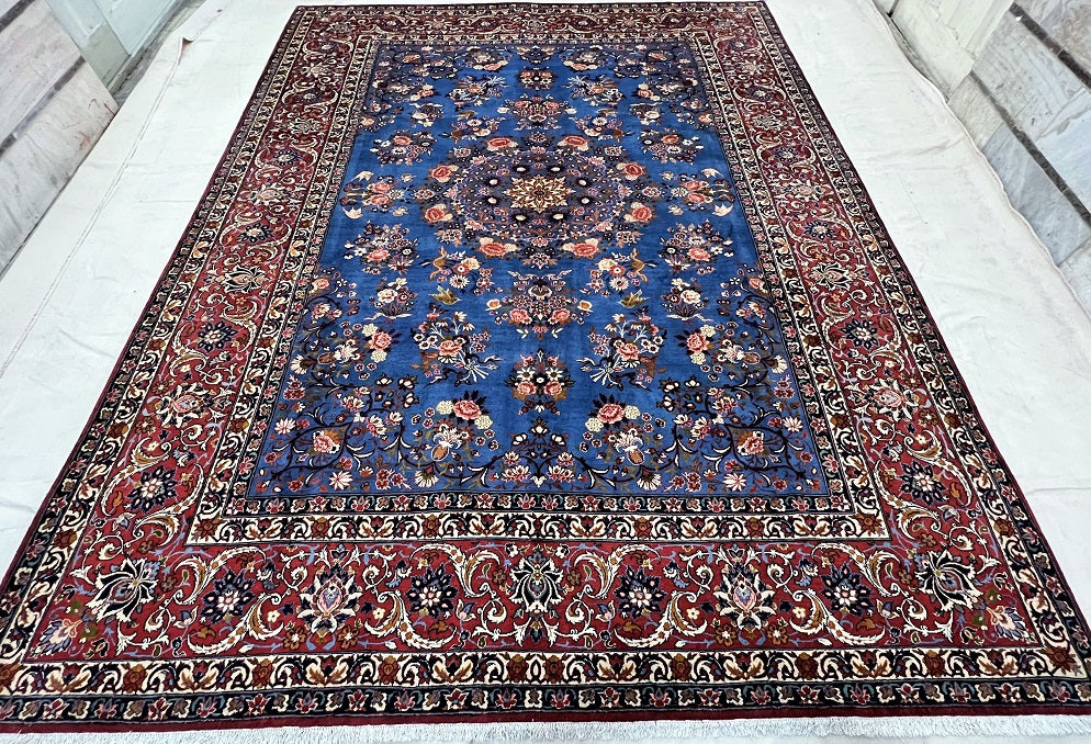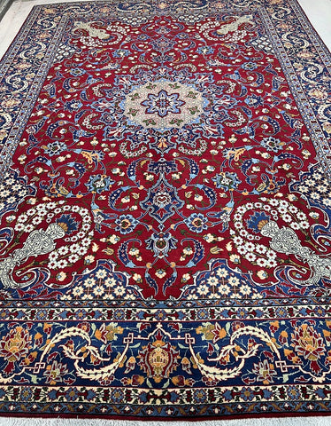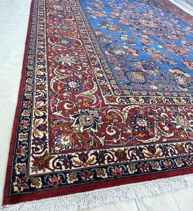 Rare Large Room Size Authentic Handmade Antique Persian Isfahan Carpet. Above All Its Hard To Find Rugs From This Region As They Are Highly collectible. It Also Has A Pure Wool Pile On Cotton Base. Blue, Maroon Red, Orange, Beige, Green And Pink Tone Dyed Using Traditional Methods.