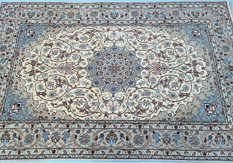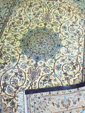Top End Quality Coffee Table To Room Size Authentic Handmade Persian Isfahan Carpet. Above All It Is Hard To Find This Quality Hand Made Rug In Silk Material. Beige/Gold Tones Dyed Using Traditional Methods.